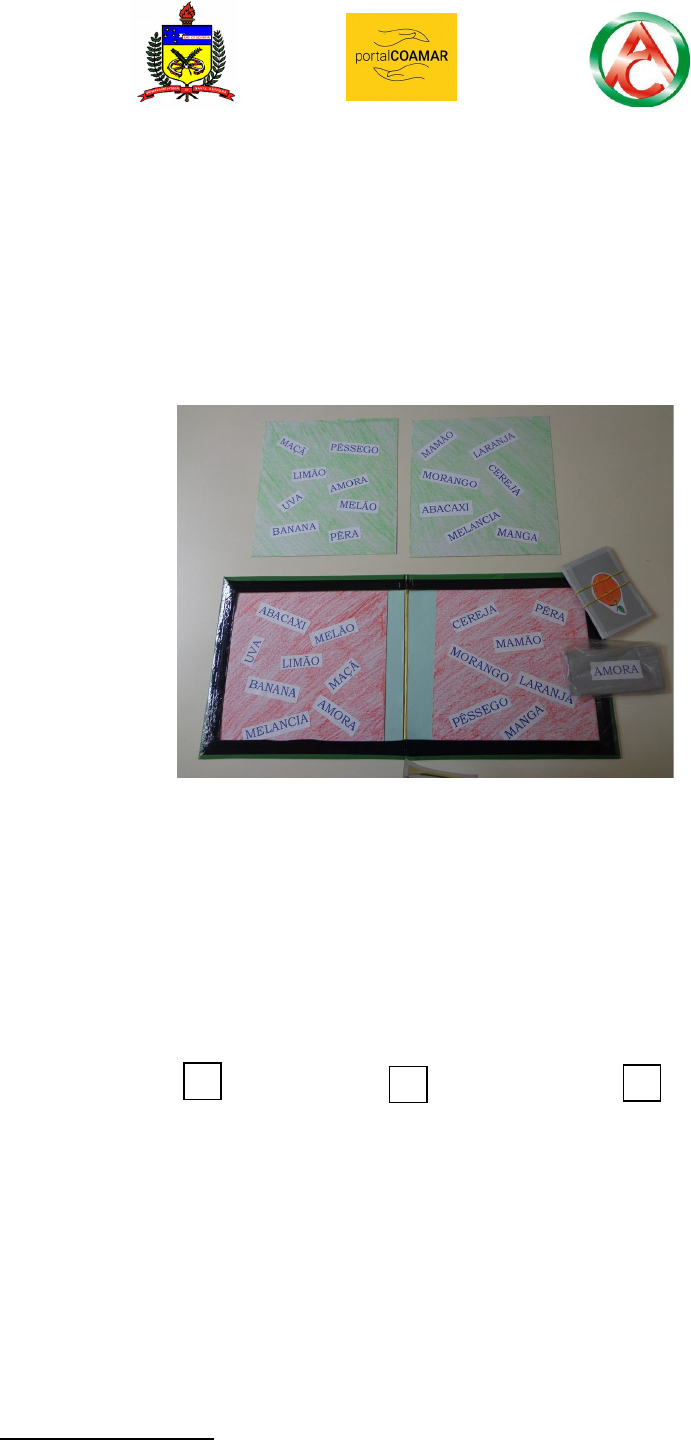 UNIVERSIDADE FEDERAL DE SANTA CATARINA COLÉGIO DE APLICAÇÃO Portal COAMAR Nome: BINGO DAS FRUTAS Descrição do material: Material em papel cartão contendo um tabuleiro, quatro cartelas grandes, quinze cartelas pequenas com imagens de frutas e quinze cartelas pequenas com palavras. Quantidade: 1 Recursos1: Libras Braille Comunicação aumentativa alternativa Disciplina: Educação Geral – LIBRAS - Anos Iniciais e Educação Especial. Objetivo: 1 Para maiores informações, consulte o glossário disponível no PORTAL COAMAR. Versão atualizada em 26/04/2017. Página 1 de 2 UNIVERSIDADE FEDERAL DE SANTA CATARINA COLÉGIO DE APLICAÇÃO Portal COAMAR Auxiliar como motivador na alfabetização; Desenvolver a atenção, a concentração e a percepção visual; Desenvolver o raciocínio rápido; Ler e escrever palavras; Associar palavras e imagens. Sugestão de uso: Pode ser usado em grupos ou individualmente. Cuidados com o manuseio: Deve-se cuidar para não perder as cartelas. Local onde se encontra: Sala de Atendimento Educacional Especializado – AEE. Condições: Boas condições Necessita de reparos Observação: Disponível para empréstimo e uso em sala de aula do CA/UFSC. Página 2 de 2 x