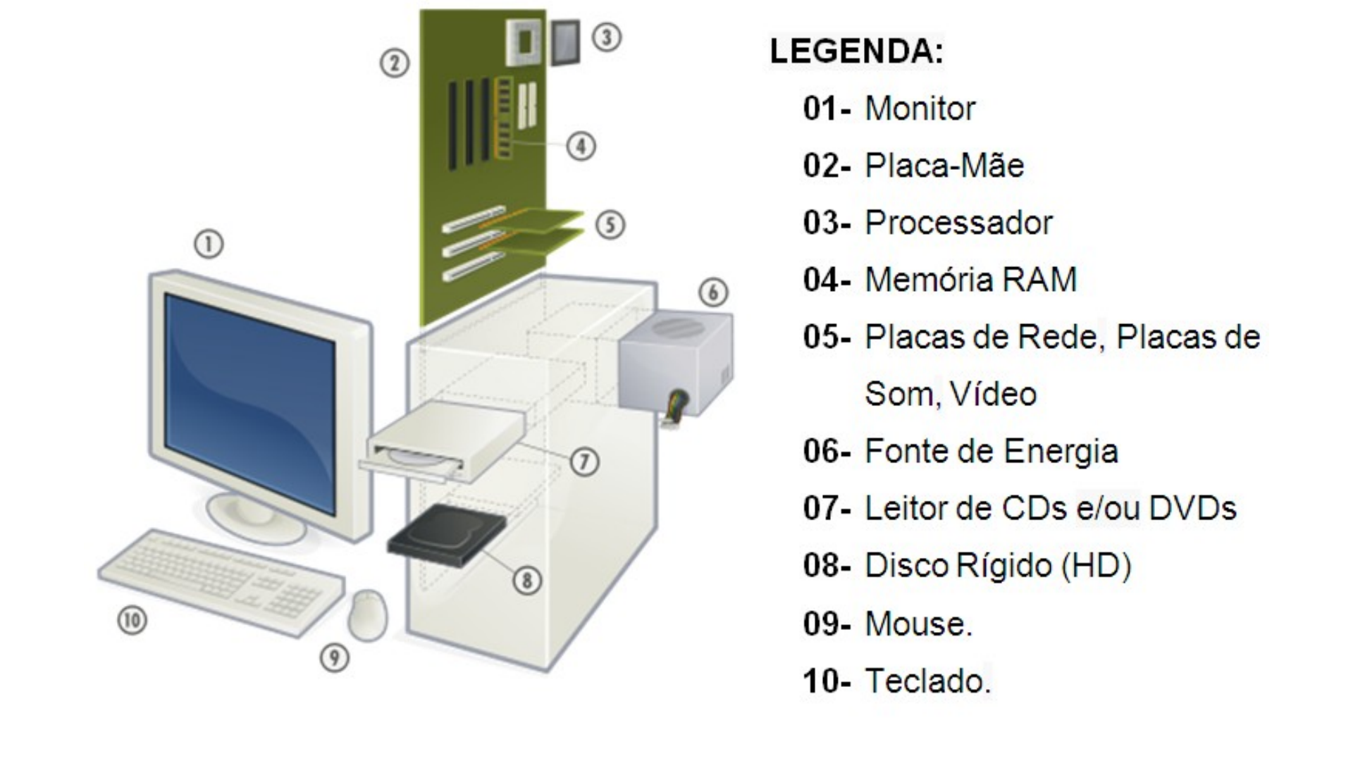 O que é uma tela de LCD? LCD significa “Liquid Cristal Display”, que, em português, é Tela de Cristal Líquido. Dentro das telas produzidas nessa composição existem cristais líquidos que são transparentes, mas têm sua estrutura molecular alterada quando recebem uma corrente elétrica e ficam opacos, impedindo a passagem de luz Qual é o significado LED? A sigla LED significa Light Emitting Diode (Diodo Emissor de Luz), mas o que isso quer dizer? Na prática, é bem simples: existem, nessas televisões, pequenos objetos como se fossem lâmpadas nas cores primárias (vermelho, azul e verde). O que é uma tela OLED? OLED - As telas de OLED não usam iluminação traseira: são formadas por diodos orgânicos que emitem a própria luz. Os pixels se acendem um a um quando estimulados por impulsos elétricos para formar as imagens e consumindo bem menos energia, é mais leve, fino, oferece melhor ângulo Taxa de atualização é a quantidade de vezes que a tela do celular é capaz atualizar uma imagem (quadro) por segundo, uma tela de 90 Hz consegue exibir 90 quadros por segundo. Já as telas de 120 Hz conseguem fazer atualizações no dobro de vezes das tradicionais, de 60 Hz. Dentro do gabinete são encontrados os componentes que formam o computador propriamente dito, como as memórias, o processador e o disco rígido, todos eles estão direta ou indiretamente ligados à placa mãe. Memória RAM É um espaço de armazenamento de dados temporário e super-rápido para acesso imediato pelos computadores. Memória ROM ROM significa Read-Only Memory, ou Memória Somente de Leitura, e está principalmente localizada no chip responsável pela iniciação do sistema – é lá que as informações básicas do computador ficam armazenadas, portanto não são afetadas quando o dispositivo é desligado. O que é o processador é qual a sua função? O processador é a unidade central de processamento de um computador (CPU), que funciona como o cérebro do computador, pois interage e faz as conexões necessárias entre todos os programas instalados. Placa Mãe Na placa-mãe, todos os componentes que formam o computador são unidos e ligados entre si. Pode-se entender a placa como uma central que resolve problemas de espaço, uma vez que une todas as partes do sistema numa só, rede de fios, porque dispõe de caminhos que permitem a troca de informação entre processadores, memórias, placas e etc. Placa de Rede A placa de rede é o hardware que permite aos micros conversarem entre sí através da rede. Sua função é controlar todo o envio e recebimento de dados através da rede. Cada arquitetura de rede exige um tipo específico de placa de rede Placa de som Uma placa de som é a peça do hardware do computador que facilita a entrada e saída dos sinais de áudio. A placa de som é responsável por fornecer os componentes de áudio dos aplicativos multimídia, como música, vídeo, apresentação, jogos etc. Placa de Vídeo (onboard) A placa de vídeo é responsável por tudo o que vemos na tela do computador, desde as telas do sistema operacional até o desenho do ponteiro do mouse. Ela faz a ligação entre a placa mãe e o monitor. Existem basicamente dois tipos: as que vêm embutidas na placa mãe, comumente chamadas de onboard, e as que podem ser instaladas posteriormente no PC, conhecidas como offboard. Vantagens Reduz o custo Mais recurso devido o menor tamanho Serem mais comuns e, assim, reconhecido automaticamente pelo sistema operacional Por serem simples, consomem bem menos energia Geram menor calor no Gabinete. Desvantagem Necessidade da memória e do processador do computador para funcionar Memoria compartilhada, o processo acaba executando o que seria da placa de vídeo e, consequentemente, há queda no desempenho do equipamento. Como é soldado na placa mãe, não há como troca-lo caso ela queime. Nesse caso a solução é uma Placa offboard. Placa de Vídeo (onboard) Placas off-board são placas externas encaixadas nos slots de expansão da placa mãe. No inicio da era do PC/XT todos as placas eram embutidas na placa mãe (na época eram somente a placa de vídeo e controladora). Vantagens Montar seu próprio computador Definição de quantidade de memória Como não utiliza processador independente, o computador fica livre para cuidar de outras tarefas Melhor desempenho Recurso que onboard não suporta, como gráficos 3D Desvantagem Investimento maior Placa mãe tem que ser compatível para conectar Instalação mais complexas Fonte de energia A fonte fica quase sempre posicionada no fundo do gabinete, normalmente em algum dos cantos traseiros da “caixa”. Esta colocação foi escolhida por dois motivos: facilitar a sua conexão com a tomada por meio de um cabo de força e, também, ajudar o periférico na hora de expulsar o calor por meio de seus recursos de esfriamento. Ao contrário do que algumas pessoas possam imaginar, a fonte (infelizmente!) não é capaz de produzir qualquer tipo de energia elétrica. O seu trabalho, na verdade, é receber aquela carga que chega à sua casa por meio da rede elétrica e altera-lá para uma compatível. Isso é necessário porque a corrente que fica disponível nas tomadas é do tipo alternada e o computador trabalha com correntes contínuas – utilizadas por todos os dispositivos eletroeletrônicos. Transformador Esse é o grande responsável por fazer com que a energia que vem da rede elétrica seja convertida e distribuída da forma correta para as partes do seu PC. O transformador recebe a corrente em 110 ou 220 Volts para que ela seja corretamente redistribuída dentro da máquina. As voltagens mais comuns utilizadas em um computador são 3,3 Volts, 5 Volts e 12 Volts. Ventoinhas e refrigeração A fonte de energia também precisa contar com um sistema próprio de refrigeração. Por trabalhar diretamente com eletricidade vinda da rede e diferentes tipos de corrente, ela é inclusive capaz de gerar muito mais calor do que 