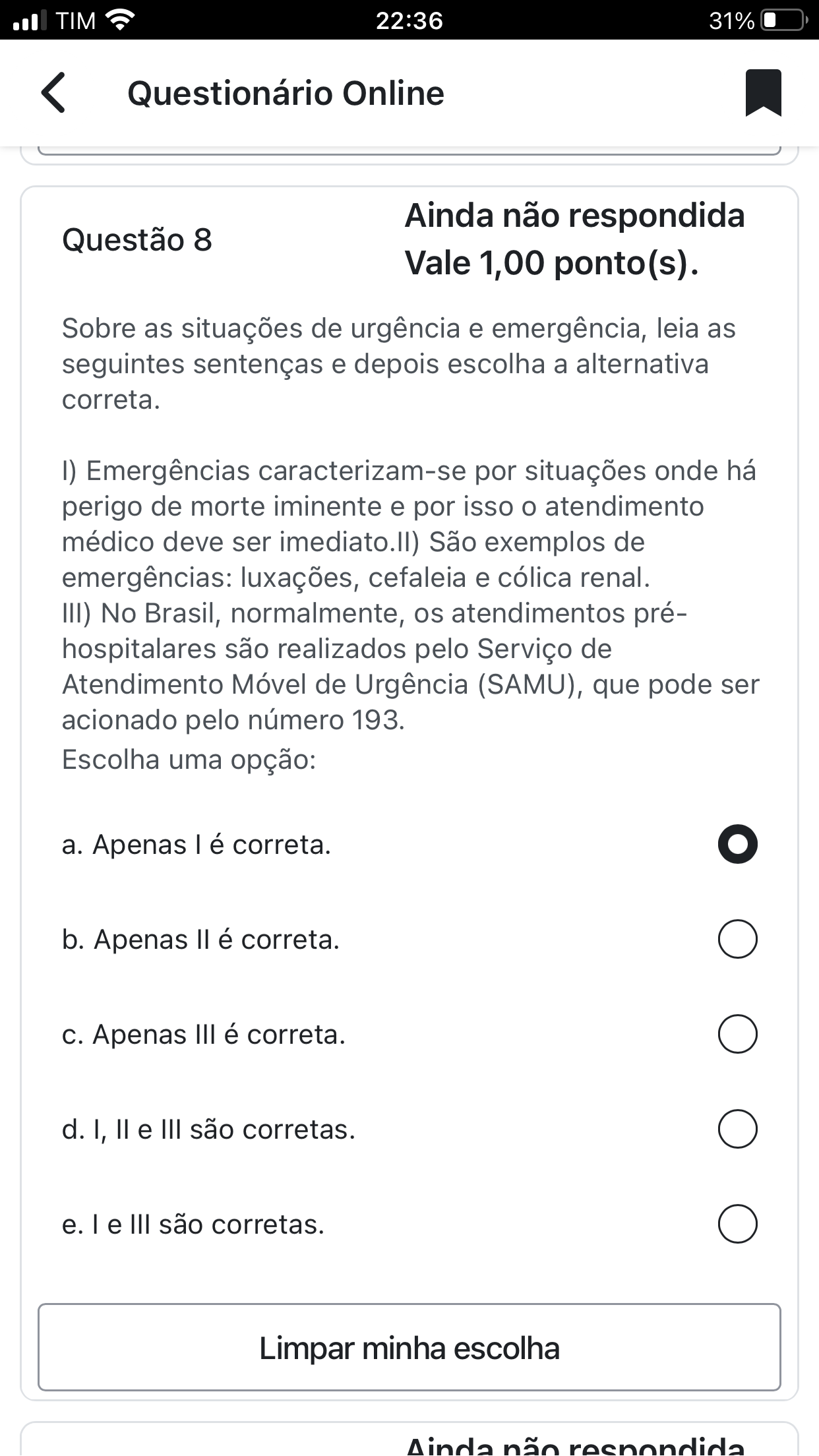 Sobre as situações de urgência e emergência, leia as seguintes sentenças e depois escolha a alternativa correta. I) Emergências caracterizam-se por situações onde há perigo de morte iminente e por isso o atendimento médico deve ser imediato. II) São exemplos de emergências: luxações, cefaleia e cólica renal. III) No Brasil, normalmente, os atendimentos pré-hospitalares são realizados pelo Serviço de Atendimento Móvel de Urgência (SAMU), que pode ser acionado pelo número 193. Escolha uma opção: I) Emergências caracterizam-se por situações onde há perigo de morte iminente e por isso o atendimento médico deve ser imediato. II) São exemplos de emergências: luxações, cefaleia e cólica renal. III) No Brasil, normalmente, os atendimentos pré-hospitalares são realizados pelo Serviço de Atendimento Móvel de Urgência (SAMU), que pode ser acionado pelo número 193. a. Apenas I é correta. b. Apenas II é correta. c. Apenas III é correta. d. I e III são corretas. e. II e III são corretas.