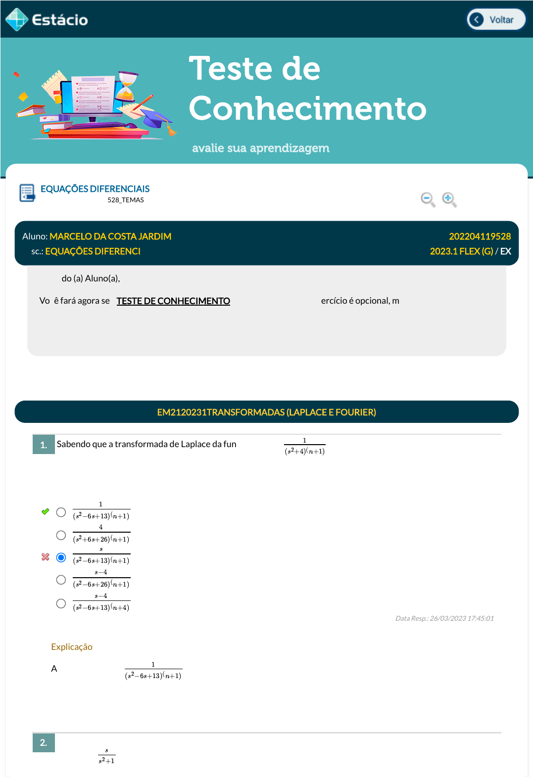 26/03/2023, 17:45 Estácio: Alunos https://simulado.estacio.br/alunos/ 1/5 Teste de Conhecimento avalie sua aprendizagem Sabendo que a transformada de Laplace da função f(t) vale sendo n um número inteiro, obtenha a transformada de Laplace de e3t f(t). Determine a transformada de Laplace da função g(t) = t2 cos t, sabendo que ℒ [ cos t] = EQUAÇÕES DIFERENCIAIS Lupa DGT0241_202204119528_TEMAS Aluno: MARCELO DA COSTA JARDIM Matr.: 202204119528 Disc.: EQUAÇÕES DIFERENCI 2023.1 FLEX (G) / EX Prezado (a) Aluno(a), Você fará agora seu TESTE DE CONHECIMENTO! Lembre-se que este exercício é opcional, mas não valerá ponto para sua avaliação. O mesmo será composto de questões de múltipla escolha. Após responde cada questão, você terá acesso ao gabarito comentado e/ou à explicação da mesma. Aproveite para se familiarizar com este modelo de questões que será usado na sua AV e AVS. EM2120231TRANSFORMADAS (LAPLACE E FOURIER) 1. Data Resp.: 26/03/2023 17:45:01 Explicação: A resposta certa é: 2. 1 (s2+4)(n+1) 1 (s2−6s+13)(n+1) 4 (s2+6s+26)(n+1) s (s2−6s+13)(n+1) s−4 (s2−6s+26)(n+1) s−4 (s2−6s+13)(n+4) 1 (s2−6s+13)(n+1) s s2+1 javascript:voltar(); javascript:voltar(); javascript:diminui(); javascript:aumenta(); 26/03/2023, 17:45 Estácio: Alunos https://simulado.estacio.br/alunos/ 2/5 Seja um circuito RL em série com resistência de e indutor de . A tensão é fornecida por uma fonte contínua de , que é ligada em . Determine a corrente máxima obtida no circuito: Um objeto cai em queda livre a partir do repouso. O objeto tem uma massa de 10 kg. Considere a constante de resistência do ar de 0,5 Ns2/m e a aceleração da gravidade igual a 10 m/s2. Determine a velocidade máxima obtida pelo objeto: Data Resp.: 26/03/2023 17:44:34 Explicação: A resposta certa é: EM2120122EQUAÇÕES DIFERENCIAIS DE PRIMEIRA ORDEM 3. Data Resp.: 26/03/2023 16:23:12 Explicação: A resposta correta é: 4. 400 m/s 200 m/s 300 m/s 100 m/s 500 m/s Data Resp.: 26/03/2023 16:23:25 Explicação: A resposta correta é: 200 m/s s(s2−3) (s2+1)3 2s(s2−3) (s2+1)3 2(s2−3) (s2−3) s(s2+3) (s2−1)3 2s(s2+3) (s2−1)3 2s(s2−3) (s2+1)3 10Ω 1H 50V t = 0s 15A 20A 10A 25A 5A 5A 26/03/2023, 17:45 Estácio: Alunos https://simulado.estacio.br/alunos/ 3/5 Determine a solução geral da equação diferencial . Determine a solução geral da equação diferencial . Marque a alternativa correta relacionada à série Marque a alternativa que apresenta a série de Maclaurin da função . EM2120123EQUAÇÕES DIFERENCIAIS DE SEGUNDA ORDEM 5. Data Resp.: 26/03/2023 17:41:53 Explicação: A resposta correta é: 6. Data Resp.: 26/03/2023 17:35:45 Explicação: A resposta correta é: EM2120230SÉRIES 7. É convergente com soma É convergente com soma É divergente É convergente com soma É convergente com soma Data Resp.: 26/03/2023 17:26:54 Explicação: A resposta correta é: É convergente com soma 8. y′′ + 4y = 10ex y = aexcos(2x) + bexsen(2x) + 2ex y = acos(2x) + bsen(2x) + x2 y = aex + bxe2x + 2cos(2x) y = acos(2x) + bxsen(2x) + 2x y = acos(2x) + bsen(2x) + 2ex y = acos(2x) + bsen(2x) + 2ex 2y′′ − 12y′ + 20y = 0 aexcos(3x) + bexsen(3x), a e b reais. axe3xcos(x) + bxe3xsen(x), a e b reais. ae3xcos(x) + be3xsen(x), a e b reais. ae−3xcos(x) + be−3xsen(x), a e b reais. axexcos(x) + bxexsen(x), a e b reais. ae3xcos(x) + be3xsen(x), a e b reais. Σn1 n+1 (n+1)(n+8) 1 8 1 10 1 11 1 9 1 10 f(x) = ex 26/03/2023, 17:45 Estácio: Alunos https://simulado.estacio.br/alunos/ 4/5 Seja um circuito RC em série com resistência de 100Ω e capacitor de 1F. A tensão é fornecida por meio de uma fonte contínua de 50V ligada em t = 0s. Determine a corrente no capacitor após 2 s. Determine o valor da carga de um capacitor Q(t) em um circuito RLC sabendo que R = 20Ω , C = 2 10 ¿ 3 F, L = 1 H e v(t) = 12 sen(10t). Sabe-se que a carga e a corrente elétrica para t = 0 são nulas. Data Resp.: 26/03/2023 17:33:54 Explicação: A resposta correta é: EM2120232APLICAÇÕES DE EQUAÇÕES DIFERENCIAIS 9. 0,25 e -1 0,25 e - 0,5 e - 0,25 e- 0,5 e - Data Resp.: 26/03/2023 17:16:32 Explicação: A resposta certa é:0,25 e - 10. e-20t[-0,012cos(20t)+0,006 sen(20t)]+0,012cos(10t)-0,024 sen(10t) e-10t[0,012cos20t-0,006 sen20t]+0,012cos10t+0,024 sen(10t) 0,012cos(20t)-0,006 sen(20t)]+0,012cos(10t)+0,024 sen(10t) e-20t[0,012cos(20t)-0,006 sen(20t)]+0,012cos(10t)+0,024 sen(10t) e-10t[-0,012cos(20t)+0,006 sen(20t)]+0,012cos(10t)-0,024 sen(10t) Data Resp.: 26/03/2023 17:25:09 Explicação: A resposta certa é: e-10t[0,012cos20t-0,006 sen20t]+0,012cos10t+0,024 sen(10t) f(x) = 1 + x + + + +. . . x2 2! x3 3! x4 4! f(x) = x + + + +. . . x2 3! x3 4! x4 5! f(x) = 1 + x + + + +. . . x2 2 x3 3 x4 4 f(x) = 1 − x + − + +. . . x2 2 x3 3 x4 4 f(x) = 1 − x + − + +. . . x2 2! x3 3! x4 4! f(x) = 1 + x + + + +. . . x2 2! x3 3! x4 4! 1 50 1 50 1 100 1 100 1 50 26/03/2023, 17:45 Estácio: Alunos https://simulado.estacio.br/alunos/ 5/5 Não Respondida Não Gravada Gravada Exercício inciado em 26/03/2023 16:17:28.