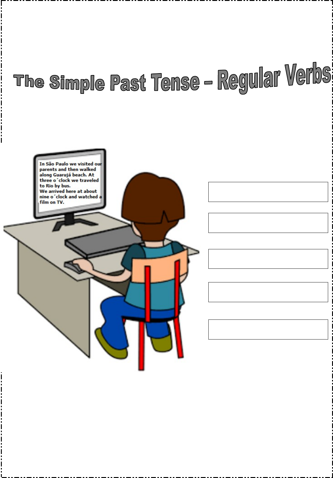 ESCOLA ________________________________________DATA:_____/_____/_____ PROF:______________________________________________TURMA:___________NOME:_______________________________________________________________ 1.Analise o texto abaixo e retire todos os verbos regulares ( regular verbs). Escreva-os nas caixas de texto ao lado. 2.Preencha as lacunas das frases com “regular verbs”. a.I____________a good film yesterday.( to watch) b.He ___________her friends last weekend. ( to visit) c.They __________the violin at the party. ( to play) d.They_____________hard last month.(to work) e.You______________your living room very well!( to clean) f.In the afternoon I ____________________along a lake. (to walk) g.My cousin _____________the piano and I ____________the drinks.( to play/to prepare) h.In the morning I _____________the birds and the sunset.( to watch) I.On weekends we_______________parties.( to organize) 3.Conjugue os verbos (to love e to cry ) no past tense: I You He/She We You They I You He/She We You They 4.Reescreva o texto abaixo substituindo os verbos grifados pelo passado. Também substitua a expressão every day por yesterday. Obs:Letra legível) ( ________________________________________________________________________________________________________________________________________________________________________________________________________________________________________________________________________________________ ) ( Kevin arrives in his o ffice at seven o´clock every day. He works fr om seven o´clock a.m. to four o´clock p.m. and then he returns home. He helps his wife in the kitchen and after dinner they talk and watch TV programs. ) 5..Complete as sentenças com o ”Simple Past Tense” dos verbos regulares, em seguida, assinale na alternativa correta. I ________my friend yesterday. ( to visit) a.( )visited b.( ) visitied They_________a new restaurant last week. ( to open) a.( ) opened b.( ) oppened The little boy_________your question. ( to answer) a.( ) answered b.( ) answerred Jonas________very well yesterday. ( to dance) a.( ) danced b.( ) danceed The children___________the new recreation center last week.(to visit) a.( )visited b.( ) visitied You_________computer games yesterday. ( to play) a.( ) played b.( ) plaied We________the new coffee shop.( to love) a.( )loved b.( ) loveed My father ____________Canada at university. ( to study) a.( )studyed b.( ) studied 6.Complete a cruzadinha com os verbos regulares no passado em inglês. www.acessaber.com.br