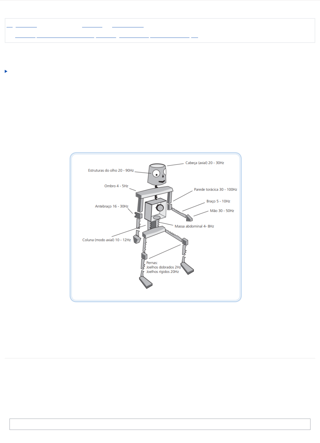 03/06/2023, 22:20 SO2023A: 2.2.1 Frequências naturais de vibração do organismo X frequência de excitação https://aprendamais.mec.gov.br/mod/page/view.php?id=25449&forceview=1 1/2 Página inicial / Meus cursos / SO2023A / 2 Riscos físicos / 2.2.1 Frequências naturais de vibração do organismo X frequência de excitação Saúde Ocupacional - Turma 2023A 2.2.1 Frequências naturais de vibração do organismo X frequência de excitação Clique aqui para versão em Libras Nosso corpo é como um sistema mecânico que possui massa e molas, possui uma frequência natural de vibração que pode variar conforme a parte do corpo e a posição que estamos. Porém, estamos sujeitos às forças externas, que são as frequências de excitação, e quando entramos em contato com elas, nosso corpo vibra. Essa vibração é chamada de vibração forçada, que pode ser prejudicial a diversos órgãos e sistemas do organismo dependendo da frequência a que fomos expostos. Quando a frequência de excitação atinge o mesmo valor da frequência natural de determinada parte do corpo, ocorre o fenômeno de ressonância, que amplifica a vibração. Vejamos a figura, nela iremos perceber que a posição do trabalhador influencia na frequência natural do nosso corpo. Figura 1 - Boneco com a indicação das frequências do corpo Este material foi baseado em: AQUINO, Aline de Souza Falcão. Saúde Ocupacional. Natal: Instituto Federal de Educação Ciência e Tecnologia do Rio Grande do Norte/Rede e-Tec, 2014. Última atualização: segunda, 28 jun 2021, 11:07 Fonte: Técnicas de avaliação de agentes ambientais: Manual SESI (2007). Adaptado por Anderson Gomes do Nascimento. Descrição da imagem: desenho de um boneco com formato humano, com a identificação e especificação das seguintes estruturas: estruturas dos olhos (20 - 90 Hz), cabeça / axial (20 - 30 Hz), ombro (4 - 5Hz), antebraço (16 - 30Hz), parede torácica (30 - 100Hz), braço (5 - 10 Hz), mão (30 - 50 Hz), massa abdominal (4 - 8Hz), coluna / modo axial (10 - 12Hz), pernas (joelhos dobrados: 2Hz, joelhos rígidos: 20Hz). ◄ 2.2 Vibrações Seguir para... 2.2.2 Distúrbios relacionados a vibrações localizadas ► https://aprendamais.mec.gov.br/ https://aprendamais.mec.gov.br/course/view.php?id=592 https://aprendamais.mec.gov.br/course/view.php?id=592#section-2 https://aprendamais.mec.gov.br/mod/page/view.php?id=25449 https://aprendamais.mec.gov.br/mod/page/view.php?id=25448&forceview=1 https://aprendamais.mec.gov.br/mod/page/view.php?id=25450&forceview=1 03/06/2023, 22:20 SO2023A: 2.2.1 Frequências naturais de vibração do organismo X frequência de excitação https://aprendamais.mec.gov.br/mod/page/view.php?id=25449&forceview=1 2/2 Resumo de retenção de dados Obter o aplicativo para dispositivos móveis Links importantes Perguntas Frequentes Suporte Termos e Condições de Uso Aviso de Privacidade e Proteção de Dados Pessoais Siga-nos https://aprendamais.mec.gov.br/admin/tool/dataprivacy/summary.php https://download.moodle.org/mobile?version=2020110904&lang=pt_br&iosappid=633359593&androidappid=com.moodle.moodlemobile https://aprendamais.mec.gov.br/mod/page/view.php?id=100 https://aprendamais.mec.gov.br/mod/page/view.php?id=23349 https://aprendamais.mec.gov.br/pluginfile.php/57/mod_folder/content/0/Termos%20de%20Uso%20Plataforma%20Aprenda%20Mais%20-%20vers%C3%A3o%202.pdf https://aprendamais.mec.gov.br/pluginfile.php/57/mod_folder/content/0/Aviso%20de%20Privacidade%20e%20Prote%C3%A7%C3%A3o%20de%20Dados%20Pessoais_versao2.pdf https://www.facebook.com/ministeriodaeducacao https://twitter.com/MEC_Comunicacao