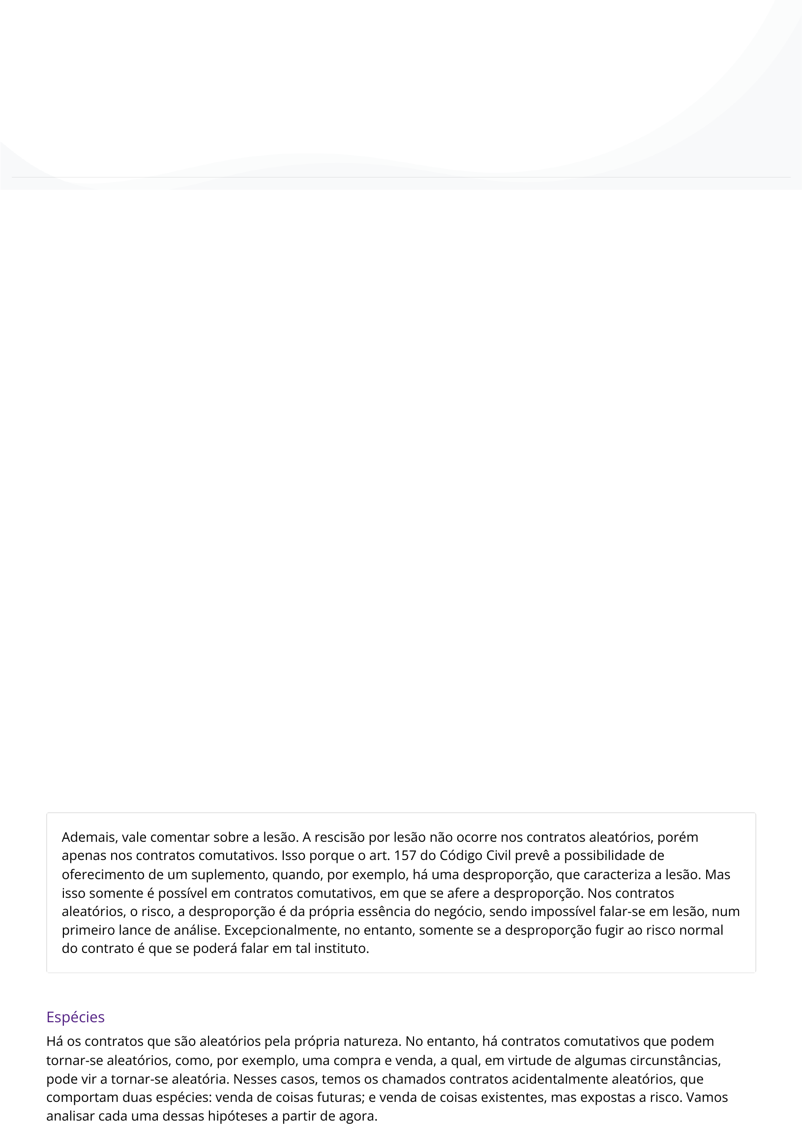 Nesta webaula, estudaremos os elementos do contrato, seus efeitos, os contratos aleatórios e a interpretação contratual. Contratos acidentalmente aleatórios Contratos aleatórios Em função das expectativas de vantagens ou de benefícios que as partes podem esperar em virtude de um contrato, os contratos bilaterais e onerosos podem ser de tipo comutativo ou aleatório. Os contratos comutativos são aqueles de prestações certas e determinadas, onde as partes já tem condições de antever as vantagens e também os sacrifícios envolvidos na avença. Há, na comutatividade, uma equivalência, no geral, e não há nenhum tipo de risco. Já o contrato aleatório, bilateral e oneroso, é aquele no qual pelo menos um dos contratantes não consegue, de imediato, antever a vantagem que porventura auferirá a partir da avença. Aqui, é justamente o contrário: não há certeza; o elemento dominante é, assim, a incerteza, para ambas as partes. Essência do contrato aleatório A palavra aleatório vem do latim alea, que indica sorte, risco. Alea jacta est (a sorte está lançada) – a famosa frase de Júlio César. O contrato aleatório é, assim, também chamado de contrato de sorte, onde são exemplos os contratos de jogo, aposta e seguro (GOLÇALVES, 2019). Distinções Não podemos confundir o contrato aleatório com outros institutos e mesmo com outras formas contratuais. Os contratos aleatórios, por exemplo, não se confundem com os contratos condicionais, porque a e�cácia destes depende de um evento futuro e incerto, enquanto nos aleatórios já há perfeição, embora com o risco envolvido na prestação das partes. Ademais, vale comentar sobre a lesão. A rescisão por lesão não ocorre nos contratos aleatórios, porém apenas nos contratos comutativos. Isso porque o art. 157 do Código Civil prevê a possibilidade de oferecimento de um suplemento, quando, por exemplo, há uma desproporção, que caracteriza a lesão. Mas isso somente é possível em contratos comutativos, em que se afere a desproporção. Nos contratos aleatórios, o risco, a desproporção é da própria essência do negócio, sendo impossível falar-se em lesão, num primeiro lance de análise. Excepcionalmente, no entanto, somente se a desproporção fugir ao risco normal do contrato é que se poderá falar em tal instituto. Espécies Há os contratos que são aleatórios pela própria natureza. No entanto, há contratos comutativos que podem tornar-se aleatórios, como, por exemplo, uma compra e venda, a qual, em virtude de algumas circunstâncias, pode vir a tornar-se aleatória. Nesses casos, temos os chamados contratos acidentalmente aleatórios, que comportam duas espécies: venda de coisas futuras; e venda de coisas existentes, mas expostas a risco. Vamos analisar cada uma dessas hipóteses a partir de agora. Direito Civil - Contratos Elementos do contrato, efeitos, contratos aleatórios e interpretação Você sabia que seu material didático é interativo e multimídia? Isso signi�ca que você pode interagir com o conteúdo de diversas formas, a qualquer hora e lugar. Na versão impressa, porém, alguns conteúdos interativos �cam desabilitados. Por essa razão, �que atento: sempre que possível, opte pela versão digital. Bons estudos! Venda de coisas futuras O art. 458 do CC/02 trata da venda de coisas futuras onde o risco diz respeito à própria existência da coisa. Assim, se o contrato for aleatório, por dizer respeito a coisas ou fatos futuros, cujo risco de não virem a existir um dos contratantes assuma, terá o outro direito de receber integralmente o que lhe foi prometido, desde que de sua parte não tenha havido dolo ou culpa, ainda que nada do avençado venha a existir. É que se chama de “emptio spei” ou venda da esperança (GONÇALVES, 2019), que diz respeito acerca da probabilidade de as coisas ou fatos existirem. Por exemplo, quando é vendida uma colheita futura ou quando uma pessoa que “propõe pagar determinada importância ao pescador pelo que ele apanhar na rede que está na iminência de lançar ao mar. Mesmo que, ao puxá-la, veri�que não ter apanhado nenhum peixe, terá o pescador direito ao preço integral se agiu com a habitual diligência” (GONÇALVES, 2019, p. 886). Na venda de coisa futura, também pode estar em questão o risco relativo à quantidade maior ou menor da coisa esperada. É a venda da coisa esperada (emptio rei speratae). O art. 459 do CC/02 disciplina a matéria, de modo que se for aleatório, por serem objeto dele coisas futuras, tomando o adquirente a si o risco de virem a existir em qualquer quantidade, terá também direito o alienante a todo o preço, desde que de sua parte não tiver concorrido culpa, ainda que a coisa venha a existir em quantidade inferior à esperada. Assim, no exemplo dado anteriormente, se o resultado de uma safra for inexistente, o contrato será nulo, pois alguma coisa tem que existir, de modo que o risco está envolvido na quantidade e não na existência. Qualquer quantidade incorrerá na obrigação de cumprimento do contrato. Venda de coisas existentes, mas expostas à risco De acordo com o art. 460 do CC/02, Se for aleatório o contrato, por se referir a coisas existentes, mas expostas a risco, assumido pelo adquirente, terá igualmente direito o alienante a todo o preço, posto que a coisa já não existisse, em parte, ou de todo, no dia do contrato. Como exemplo, “a mercadoria que está sendo transportada em alto-mar por pequeno navio, cujo risco de naufrágio o adquirente assumiu. É válida, mesmo que a embarcação já tenha sucumbido na data do contrato. Se, contudo, o alienante sabia do naufrágio, a alienação poderá ser anulada como dolosa pelo prejudicado, como prescreve o art. 461 do Código Civil, cabendo ao adquirente a prova dessa ciência” (GONÇALVES, 2019, pp. 886-887). Contratos com pessoa a declarar Venda de coisas existentes, mas expostas à risco O contrato com pessoa a decl