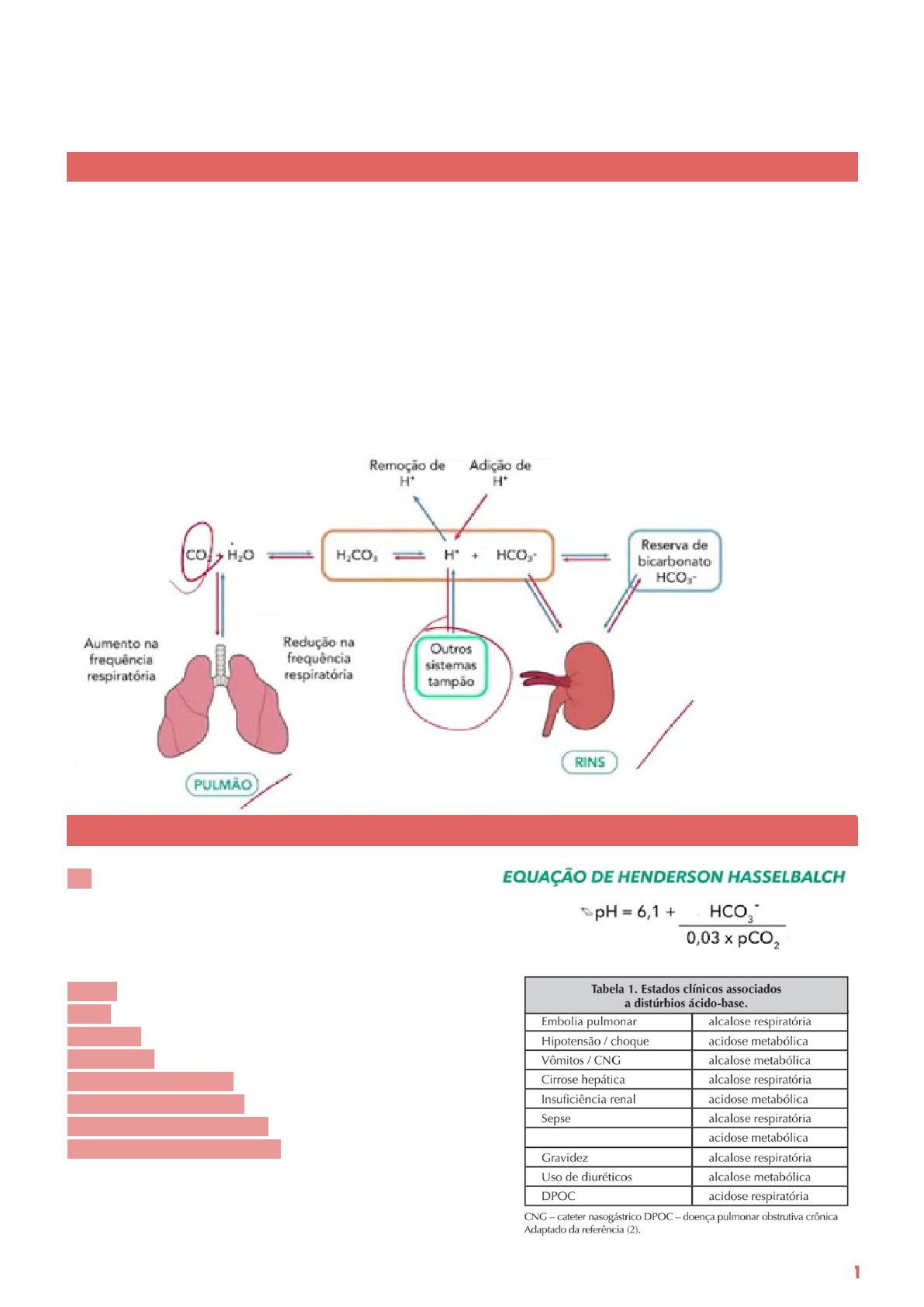 @medsurtoo Nivya Moraes P7/UC21 - UNIT AL GASOMETRIA INTRODUÇÃO Objetivos da gasometria: ● Diagnosticar distúrbios do equilíbrio ácidobásico ● Analisar a distribuição de oxigênio para os tecidos ● Pode ser útil na avaliação de eletrólitos e hemoglobina, mas requer calibragem acurada no gasômetro Sangue arterial é coletado da artéria radial ou artéria femoral com seringa heparinizada Produção diária de carga ácida: ● Ácidos voláteis: metabolismo dos carboidratos, eliminados pelos pulmões na forma de CO2 ● Ácidos fixos: metabolismo das proteínas, gorduras e aminoácidos, eliminados pelos rins DISTÚRBIOS DO METABOLISMO ÁCIDO-BASE PH: É o logaritmo negativo da concentração do íon H+, que é igual a concentração de íons H+ quando o coeficiente de atividade é unitário. Potencial de hidrogênio. Representa a concentração de H+; Logarítmica (Equação de Henderson Hasselbach) - DP ao HCO3- e IP ao PCO2 ÁCIDO: Substância capaz de doar prótons ou íons H+ BASE: Substância capaz de receber prótons ou íons H+ ACIDEMIA: pH do sangue arterial menor que 7,35 (H+> 44 nmol/L). ALCALEMIA: pH do sangue arterial maior que 7,45 (H+< 36 nmol/L). ACIDOSE E ALCALOSE: processos que tendem a variar o pH ACIDEMIA E ALCALEMIA: relacionadas com a quantidade de pH DISTÚRBIOS METABÓLICOS: mexem no bicarbonato DISTÚRBIOS RESPIRATÓRIOS: mexem no pCO2 1 @medsurtoo Nivya Moraes P7/UC21 - UNIT AL acidose metabólica DEFINIÇÃO: processo patológico com tendência à acidemia, que cursa com redução dos níveis séricos de bicarbonato. HCO3- < 22mEq/L REPERCUSSÕES CLÍNICAS: ● Causa de parada cardiorrespiratória ● Reduz resposta dos receptores adrenérgicos: queda no inotropismo, vasoplegia (hipotensão!) ● Resposta compensatória: tentativa de eliminar CO2 (ritmo de Kussmaul) CLASSIFICAÇÃO Acidose metabólica AG aumentado - AG aumenta quando tem um ácido que se dissocie em um H+ e um ânion (ex.: ácido lático ⇌ lactato + H+) Causas: ○ Acidose lática (choque é a principal causa, drogas - ex.: metformina) ○ Disfunção renal (aguda ou crônica - acumula ácidos como o sulfúrico) ○ Intoxicações ■ Álcoois tóxicos - ex1.: metanol em bebidas adulteradas, clínica de baixa acuidade visual antes de paciente piorar pelo acometimento do nervo óptico devido à toxicidade do ácido fórmico. ex2.: etilenoglicol: anticongelante, formação de cristais de oxalato de cálcio na urina. TTO: etanol ■ Salicilatos: pode cursar com alcalose respiratória. ex.: abuso de AAS ■ Cetoacidoses (diabética, alcoólica, jejum prolongado) Acidose metabólica AG normal Causas: ○ Renais ■ Acidoses tubulares renais: ocorrem por alteração em um dos segmentos do néfron. Não há ganho de novos ácidos! ATR 2: Problema no TCP resultando em prejuízo na reabsorção de HCO3- e bicarbonatúria. Causas: mieloma múltiplo, acetazolamida, aminoglicosídeos. Síndrome de Fanconi é a disfunção completa do TCP com aminoacidúria, glicosúria e fosfatúria além de alcalose metabólica. 2 @medsurtoo Nivya Moraes P7/UC21 - UNIT AL ATR 1: Problema no TCD resultando em redução da secreção de H+, cursa com hipocalemia e pH urinário alcalino. Causas: Sjogren, paraproteinemias, anfotericina B. Tem relação com distúrbios minerais e ósseos, como osteopenia, nefrolitíase e nefrocalcinose ATR 4: Problema no túbulo coletor com redução ou bloqueio da aldosterona (em situações normais a aldosterona estimula a reabsorção de sódio no túbulo coletor). Cursa com acidose metabólica AG normal e hipercalemia. Causas: hipoaldosteronismo hiporreninêmico, espironolactona, IECA/BRA. ○ Extra-renais ■ Diarreias: perda de secreção rica em bicarbonato. ■ Ureterossigmoidostomia: reabsorção de cloreto em troca de bicarbonato ■ Soro fisiológico: aporte excessivo de cloreto alcalose metabólica DEFINIÇÃO: processo patológico com tendência à alcalemia, que cursa com aumento dos níveis séricos de bicarbonato. HCO3- > 26mEq/L ASPECTOS FISIOLÓGICOS QUE PERPETUAM A ALCALOSE METABÓLICA: ● Hipovolemia: aumenta a reabsorção de Na+ no TCP ● HIpocloremia: o cloro é essencial para a rebsorção de Na+ no TCP ● Hipocalemia: no coletor, quando há reabsorção de Na+, há secreção de K+ ou H+ 3 @medsurtoo Nivya Moraes P7/UC21 - UNIT AL Causas: ○ Hipovolêmicas Renais/Cloreto sensíveis ■ Diuréticos de alça - NKCC2 na alça de Henle. Alcalose metabólica com hipocalemia ■ Diuréticos tiazídicos - NaCl no TCD. Alcalose metabólica com hipocalemia ■ Síndrome de Battter “furosemida like” ■ Síndrome de Gitelman “tiazídico like” ○ Hipovolêmicas Extrarrenais/Cloreto sensíveis ■ Perda de conteúdo gástrico (vômitos, SNG aberta) - alcalose metabólica hipoclorêmica, hipocalêmica ■ HCI ■ Perda urinária de potássio é explicada pelo aumento da secreção no néfron distal ○ Normo/Hipervolêmicas - causas renais ■ Não melhoram com a reposição de cloreto! ■ Hiperaldosteronismo: hipertensão, hipocalemia, alcalose metabólica ■ Síndrome de Cushing: atividade mineralocorticoide ○ Normo/Hipervolêmicas - causas extrarrenais ■ Não melhoram com a reposição de cloreto! ■ Administração de NaHCO3: hipernatremia, alcalose metabólica, hipocalemia, hipocalcemia ■ Hemotransfusão maciça: hipocalcemia, hipotermia, hipercalemia, alcalose metabólica acidose respiratória Caracterizada pelo aumento primário da pCO2. Tendência à acidemia. Pode ser aguda ou crônica HIPOVENTILAÇÃO: retém muito CO2 -> CO2 acumula -> diminui pH -> acidose respiratória CLÍNICA: ● Sintomas neurológicos mais proeminentes pela fácil difusão do CO2 para o SNC ● Confusão mental ● Flapping ● Tremores ● Coma ACIDOSE RESPIRATÓRIA AGUDA MECANISMOS CAUSAS Alterações neuromusculares ● Lesão de tronco ou medula ● Síndrome de Guillain-Barré ● Miastenia gravis ● Drogas Obstrução de vias respiratórias ● Corpo 