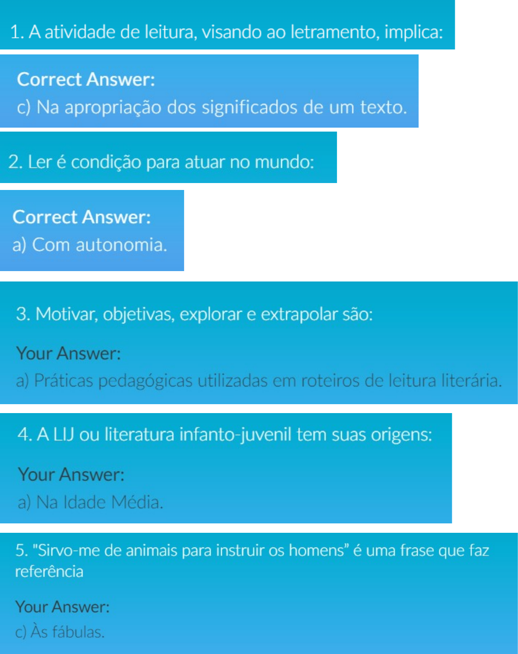 1 - Leia o excerto a seguir: “Durante a Idade Média, [...] a escola era uma instituição precária, desorganizada, demasiado subjectiva e instável, vulnerável à transmissão de crendices, superstições e ideias fantasistas variadas. [...] Além das escolas eclesiásticas medievais, estabelecidas inicialmente com o desígnio de formar clérigos, existiam somente certos cursos inconsistentes, assegurados por professores e mestres-escola, livres de determinar os seus próprios curricula arbitrariamente. Nesta época, poucas eram as crianças que iam à escola e as que iam também não permaneciam aí por muito tempo”. FONTES, O. M. Literatura Infantil:Raízes e Definições. Cadernos de Estudo 14, Escola Superior de Educação de Paula Frassinettil. Disponível em: <http://revista.esepf.pt/index.php/sabereducar/article/download/134/103.>. Acesso em: 02 abr. 2019. Com base no excerto apresentado e considerando o conteúdo estudado sobre a educação, em especial, a infantil, do período medieval, analise as afirmativas a seguir. I. A criança era vista como um adulto em miniatura. II. Não havia uma literatura destinada, especificamente, para crianças. III. A criança podia participar de todas as esferas da vida adulta. IV. Na Idade Média, a escola era aberta a toda a população. Estão corretas: 2 - Leia o trecho a seguir. “Somente no século XVIII a literatura das fadas voltada para o público infantil é abandonada pelos adultos, ou melhor, deixadas em segundo plano, e insere-se ao universo da criança, onde destaca-se principalmente, os irmãos Grimm, durante o século XIX”. NEVES, I. P. de O. O gênero conto de fadas como instrumento de aprendizagem e ressignificação do conhecimento. In: PARANÁ. Os desafios da escola pública paranaense na perspectiva do professor PDE. Cadernos PDE, v. 1, 2016. p. 6. Disponível em: <http://www.diaadiaeducacao.pr.gov.br/portals/cadernospde/pdebusca/producoes_pde/2016/2016_pdp_port_uenp_ivanetepiresdeoliveiraneves.pdf>. Acesso em: 10 abr. 2019. Considerando o excerto apresentado, como eram os contos populares antes de se tornarem contos de fada? Analise as afirmativas a seguir e assinale a correta. 3 - Considere o excerto a seguir. “[...] parte do acervo da literatura infantil e juvenil considerado clássico é fruto de adaptações. Por isso, o modelo de literatura endereçado ao infante é, muitas vezes, o clássico adaptado. Isto é, as normas literárias e sociais introjetadas no imaginário infantil são retiradas do texto literário já devidamente legitimado pela comunidade, tendo como conseqüência a composição do horizonte de expectativas desse leitor com base no universo canônico”. CARVALHO, D. B. A. de. Quando se adapta uma obra literária para crianças e jovens, que gênero textual é adaptado? In: SIMPÓSIO INTERNACIONAL DE ESTUDOS DE G& Ecirc;NEROS TEXTUAIS, 5., 2009, Caxias do Sul. Anais..., Caxias do Sul, 2009, p. 3. Analise as afirmativas a seguir, considerando o trecho apresentado sobre as adaptações: como devemos trabalhá-las em sala de aula? I. Deve-se apresentar o texto adaptado como arte, que é passível de um diálogo intertextual com outros textos/artes. II. Deve-se expor que o texto adaptado não possui originalidade. III. Deve-se apresentar o contexto de produção da obra original e de sua adaptação. IV. As adaptações devem ser utilizadas em último caso, pois são obras menores. Estão corretas: 4- Leia a citação a seguir. “O universo dos contos populares pode, de algum modo, dividir uma certa área integrada no universo infantil, mas a Literatura para Crianças terá, possivelmente, ainda outras raízes, o que vem colocar novas questões, no que se refere à origem desta tipologia textual particular. [...] os contos sobreviveram, ao longo dos séculos, através da transmissão, quase que exclusivamente, oral, [...] num tempo em que a vida comunitária e colectiva era intensa [...]”. FONTES, O. M. Literatura Infantil:Raízes e Definições. Cadernos de Estudo 14, Escola Superior de Educação de Paula Frassinettil. Disponível em: <http://revista.esepf.pt/index.php/sabereducar/article/download/134/103.>. Acesso em: 02 abr. 2019. Levando em consideração a citação exposta e o conteúdo estudado sobre as origens da literatura infantil, analise as afirmativas a seguir. I. As narrativas reproduziam oralmente as histórias advindas do folclore. II. Até o século XVII, os contos não eram direcionados às crianças. III. As narrativas eram transmitidas pela oralidade e são de natureza popular. IV. Era comum temas que apresentavam a inconformidade com os valores feudais. Estão corretas: 5- Leia a citação a seguir. “A literatura vista como ‘pilar’, responsável pelo bem-estar do homem presentifica o tema da finalidade da literatura. Uma delas - a da formação - [...] atribui à literatura a função de humanizar o homem [...]. A obra de arte, uma vez em interação com o receptor, se transforma em objeto estético e tem, então, a capacidade de transformá-lo”. MÜGGE, E. A função formadora da literatura. Revista Línguas & Letras, Unioeste, v. 14, n. 27, 2013. p. 9. Assim, no que se refere à formação propiciada pela Literatura Infantil, assinale a alternativa correta. 6- Leia o excerto a seguir. “A tradição oral vem de tempos muito remotos e fazia parte das trocas culturais anteriores ao advento da escrita. Assim, a única forma de as sociedades manterem vivas as suas tradições era com a narração de suas histórias”. PINHEIRO, N. M. L. P. Como você está diferente, vovó! Aspectos sócio-históricos dos contos populares. Dissertação (Mestrado em Letras) - Faculdade de Filosofia, Letras e Ciências Humanas, Universidade de São Paulo, São Paulo, 2012. p. 11. Considerando o excerto a respeito da transmissão de histórias por meio da oralidade, analise as afirmativas a seguir. I. Os ensinamentos das histórias de tradição oral são destinados ao público d