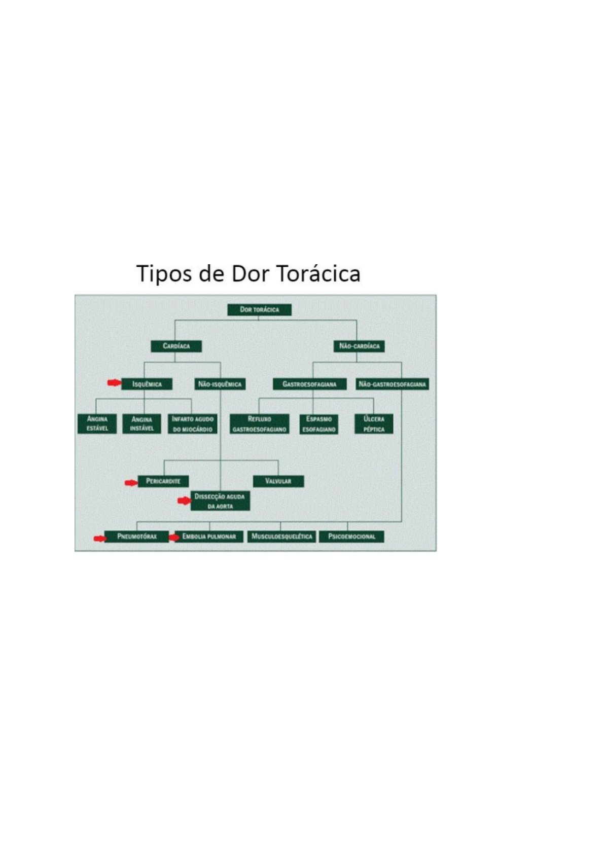 PROPEDÊUTICA DA DOR TORÁCICA Ponderações ● Dor torácica é uma queixa muito comum no pronto-atendimento; ● Cerca de metade dos IAM com supra ST não aparecem no ECG na chegada ao PS; ● Menos da metade dos IAM com supra têm elevação de troponina na chegada ao PS. Dor torácica Diagnósticos diferenciais na dor torácica ● TEP ● SCA ● Dissecção aórtica ● Herpes-zóster ● Disfunções TGI ● Dor músculo-esquelética ● Psico-emocional Características da dor torácica ● Dor pleurítica: dor a inspiração (ventilatório-dependente); ● Espasmódica: crises de espamos; ● Dor em aperto ou peso: dor do tipo constritiva (“dor em aperto ou sensação de “peso no peito”); ● Dor em pressão: sensação de “pressão no peito”; ● Dor aguda ou localizada: “é aqui que dói" ● Dor visceral: difícil de delimitar (comum sensação de dor em queimação); ● Dor em rasgo: sinto como se tivesse rasgando no peito Localização da dor Depende muito da situação (causa, patologia), podendo ser: ● Subesternal; ● Central ou em todo o tórax; ● Parte lateral do tórax; ● Dor irradiada para o tórax ou do tórax para outras áreas como pescoço, maxilar ou MMSS (principalmente braço esquerdo); História: idade, episódios prévios, IVAS, febre, trauma, estresse, fator emocional, doença cardíaca prévia, febre e flebite. Sinais e sintomas: dispneia, diaforese (sudorese intensa), náuseas e vômitos, astenia, síncope, alterações neurológicas, hipertensão arterial ou hipotensão, sons respiratórios alterados, cianose, hemoptise, assimetria de pulsos, massa abdominal palpável, dor abdominal, etc. Dor anginosa Caracterizada como dor em aperto, retroesternal, com irradiação para costas ou mandíbula e que piora ao exercício. É estável quando dura de 10 - 15 min e instável quando > 20 min. Na dor anginosa podemos ter o sinal de Levine (mão fechada na região esternal) ou sinal da palma, do braço e/ou do apontamento. Dor torácica na dissecção de aorta Dor de início súbito, intensa, dilacerante, com assimetria de pulsos e sem fatores de melhora para a dor. Presença de PA desigual nos braços, aparecimento de sopro de insuficiência aórtica. Paciente descreve “dor com sensação de rasgo” que irradia para o dorso ou da região anterior do tórax para o dorso, além de apresentar diaforese, fraqueza, tontura e síncope e é comum massa abdominal pulsátil (visível). Tipo de dor que também pode estar presente na síndrome de Marfan, aterosclerose, HAS. Mas jamais descartar a possibilidade de ser um aneurisma de aorta dissecante. Dor torácica na TEP Dor pleurítica associada com dispneia súbita, ipsilateral, podendo apresentar hemoptise. Pode ter sinais de TVP*. Paciente pode apresentar também sinais de IC direita ou hipertensão pulmonar. *Dor na região da panturrilha, que pode estender-se até o pé e tornozelo ou braços, com presença de edema na área afetada, pode ter mudança de coloração na região afetada, de vermelha a azulada. Dor torácica no pneumotórax hipertensivo Dor de início súbito (minutos ou horas) do tipo pleurítica, ipsilateral, com dispneia progressiva. No exame físico temos MV diminuídos, timpanismo à percussão (exceto no pneumotórax laminar). Apresenta sinais de insuficiência respiratória e IC direita. Geralmente associado a manobras com aumento da pressão intratorácica (tossir, evacuar, mergulhar, etc). Dor torácica na pericardite Dor em pontada, de início súbito, aguda, pleurítica, retroesternal ou precordial, podendo irradiar para pescoço e ombro esquerdo. Tem piora em decúbito dorsal, ao tossir ou na respiração. No exame físico temos presença de som de atrito pericárdico na ausculta cardíaca. Pode ter tríade de Beck (hipotensão, turgor jugular e abafamento de bulhas no tamponamento cardíaco). Paciente assume posição maometana na crise de dor (fator de melhora). Dor torácica na ruptura de esôfago Presença de dor prévia em queimação, súbita, intensa e precordial, com piora à deglutição. Dor do tipo retroesternal/epigástrio. Tem piora ao deglutir e inspiração profunda. Evolução com mediastinite (dispneia, febre, taquicardia, hipotensão arterial), vômitos, hematêmese, enfisema subcutâneo. Principal complicação: Síndrome de Boerhaave. Dor torácica na pneumonia Dor pleurítica, que acomete mais a parede torácica lateral, do tipo ventilatório-dependente. Piora com a respiração profunda e tosse. Paciente pode apresentar febre , tosse e expectoração associados. Exame físico com presença de estertores subcrepitantes na ausculta. Dor torácica na gastrite Dor preexistente com piora súbita, em queimação (ou pontada) na região epigástrica, com piora após comer ou no jejum prolongado. Sintomas associados: azia, náuseas, vômitos, eructações, perda de apetite. História prévia de doença gastrointestinal. Dor torácica na doença do refluxo gastroesofágico Dor de início súbito (10-60 min), com sensação de queimação retroesternal ascendente, podendo ser acompanhada de regurgitação. Fatores de piora: decúbito dorsal após alimentação em grande quantidade Fatores de melhora: uso de antiácidos Dor torácica na úlcera péptica Dor de início súbito na região epigástrica ou retroesternal, do tipo queimação e pontada. Associada com náuseas, vômitos e mal-estar geral. Dor que piora com o estômago vazio. Causas: infecção por H. pylori (na EDA). Na úlcera perfurada o paciente relata dor localizada. Dor torácica na colecistite Dor em hipocôndrio direito, súbita e que pode irradiar para o ombro direito, costas, epigástrio. Apresenta náuseas, vômitos, perde a hepatite. No exame físico tem sinal de Murphy positivo e pode irradiar para o flanco direito. Paciente também pode apresentar febre, mal-estar e prostração. Dor torácica na costocondrite Pode ser súbita ou insidiosa, localizada, dolorosa à palpação e ausência 