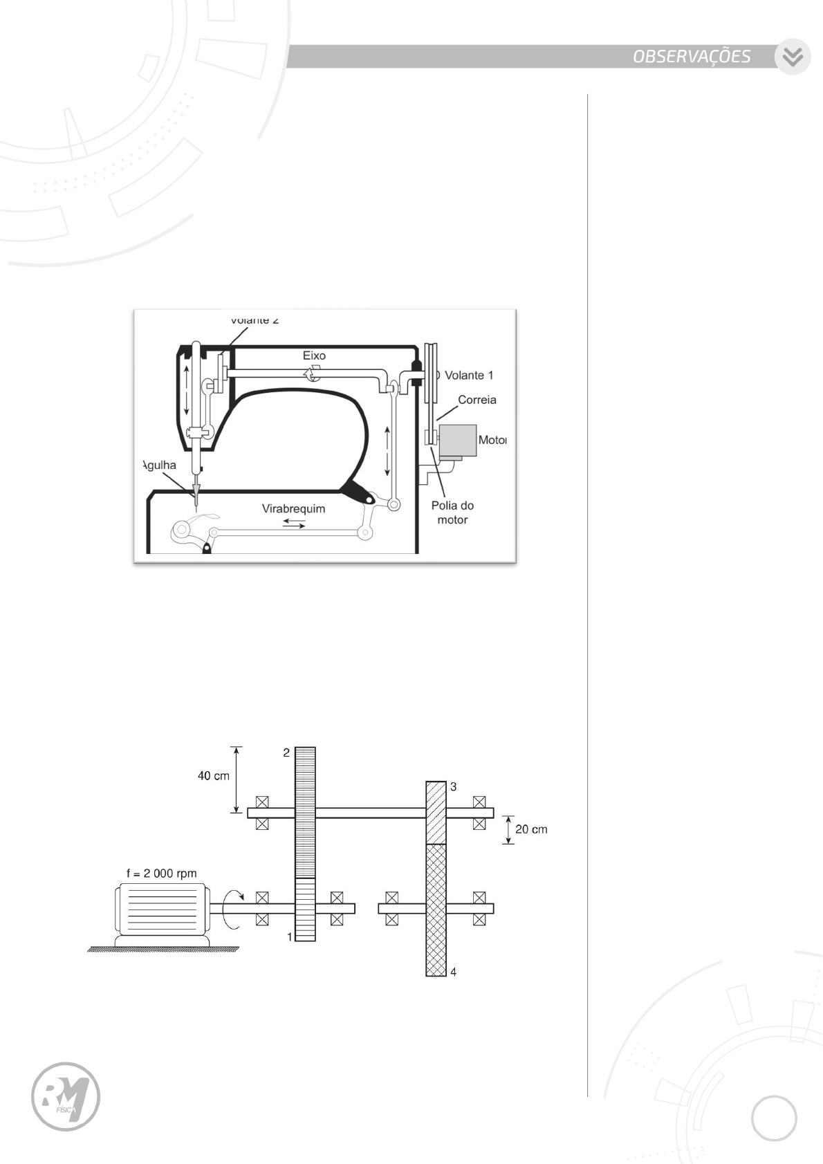 FAST TRAINING 04 01. Máquinas de costura são dispositivos usados para unir materiais diferentes com uma linha. Simplificadamente, em máquinas de costura residenciais, a polia do motor, cujo diâmetro é de 55 mm, encaixa-se ao volante 1 (165 mm de diâmetro) por uma correia, enquanto o volante 1 se conecta ao volante 2 por um eixo e um virabrequim (responsável por combinar o movimento do volante 1 com o da linha que passa na agulha). O volante 2 transmite seu movimento à agulha, que se movimenta verticalmente, como ilustrado. Qual deve ser a frequência da polia do motor para que a agulha faça 2.400 pontos por minuto? a)20 Hz. b) 40 Hz c) 60 Hz d) 72 Hz e) 120 Hz 02. Trens de engrenagens compostos são acoplamentos que utilizam pelo menos um eixo no qual existe mais de uma engrenagem conectada ao motor. Esse tipo de associação tem o objetivo de diminuir a frequência de rotação do objeto a ser conectado, de maneira proporcional à dimensão das engrenagens envolvidas no acoplamento. A figura apresenta um sistema desse tipo, em que as engrenagens ímpares possuem as mesmas dimensões entre si, bem como as engrenagens pares. Qual a frequência da engrenagem 4? a) 125 rpm b) 250 rpm c) 500 rpm d) 750 rpm e) 1.000 rpm 03. Um sistema de uma centrífuga manual para secar verduras é composto por 3 engrenagens cuja quantidade de dentes é diretamente proporcional ao próprio raio, conforme mostrado na figura a seguir. Nesse sistema, uma pessoa gira a engrenagem A em média de 2 rotações por segundo. A engrenagem C está conectada à cesta da centrífuga por meio de um eixo, e, conforme ele gira, a cesta também gira. Considerando que as engrenagens não deslizam, a frequência de rotação da cesta, em rpm, é A) 4. B) 60. C) 120. D) 160. E) 240. 04. O atuador linear elétrico é um equipamento que utiliza do movimento de rotação de um motor (ωM) para movimentar linearmente um parafuso. Comumente empregado no âmbito industrial, como uma alternativa aos sistemas pneumáticos tradicionais e motores de engrenagem, o motor elétrico transmite um movimento de rotação a uma engrenagem A que, posteriormente, por meio de outras engrenagens B e C, a transmitem ao parafuso, como ilustrado. Qual a frequência de rotação do parafuso do atuador? A) 9 Hz. B)15 Hz. C) 25 Hz. D) 30 Hz. E) 45 Hz 05. Duas cargas puntiformes de valores +Q e -3Q estão separadas conforme a figura. O ponto A tem potencial nulo. A distância entre a carga Q e o ponto A é 104 cm. 26 cm. 50 cm. 60 cm. 90 cm.