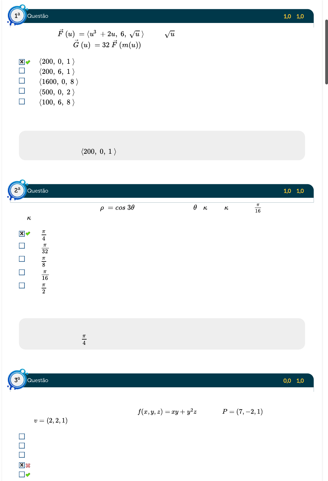 06/06/2023, 11:28 Estácio: Alunos https://simulado.estacio.br/alunos/ 1/1 Acerto: 1,0 / 1,0 Sabendo que m(u) = , assinale a alternativa que apresenta a derivada da função no ponto u = 4: Respondido em 06/06/2023 10:09:00 Explicação: A resposta correta é Acerto: 1,0 / 1,0 A área de�nida pela equação , para o intervalo 0 < < , com > 0, vale . Qual é o valor de ? Respondido em 06/06/2023 10:25:30 Explicação: A resposta correta é Acerto: 0,0 / 1,0 As funções de várias variáveis podem representar fenômenos físicos, como o movimento de partículas em um espaço tridimensional, a distribuição de temperatura em um objeto ou a variação da pressão em um �uido. Dessa forma, determine a derivada direcional no ponto na direção do vetor . -6. 0. -2. 6. 2. →F (u) = ⟨u3 + 2u, 6, √u ⟩ √u →G (u) = 32 →F (m(u)) ⟨200, 0, 1 ⟩ ⟨200, 6, 1 ⟩ ⟨1600, 0, 8 ⟩ ⟨500, 0, 2 ⟩ ⟨100, 6, 8 ⟩ ⟨200, 0, 1 ⟩ ρ = cos 3θ θ κ κ π 16 κ π 4 π 32 π 8 π 16 π 2 π 4 f(x, y, z) = xy + y2z P = (7, −2, 1) v = (2, 2, 1) Questão1 a Questão2 a Questão3 a