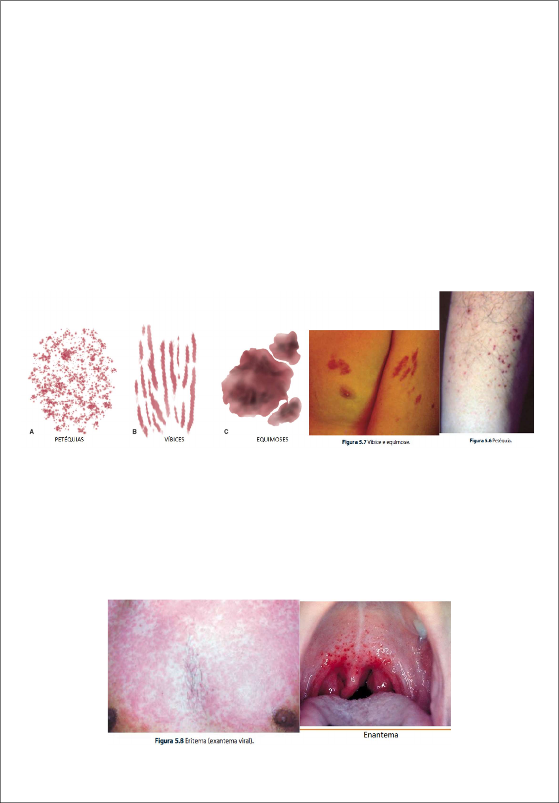Lesões elementares Primárias: Sem lesão prévia. Secundárias: Decorrente de alterações nas lesões primárias. ● Planas: Mancha / mácula: Alteração da cor da pele sem relevo / depressão. - Mancha: Alteração de cor maior que 1cm. - Mácula: Alteração de cor menor que 1cm. → Hemorrágicas: Por se tratar de sangue extravasado, não desaparecem pela depressão. ⤍ Petéquias: Puntiformes com até 1cm ⤍ Víbices: Linhas ⤍ Equimoses: Lesão em placa, geralmente maior que 1 cm. → Vasculares: Tonalidade vermelha. Desaparecem por compressão. ⤍ Eritema: Por vasodilatação. Rosa ou avermelhada. Desaparece à dígito ou vitropressão. Localizada na pele. ⤍ Enantema: Eritema localizado nas mucosas. ⤍ Exantema: Eritema em áreas extensas. ⤍ Telangiectasia: Lesão filamentar sinuosa. Corresponde à dilatação capilar permanente. → Pigmentares: ⤍ Hipocrômicas ⤍ Hipercrômicas ⤍ Acrômicas Hipocrômica Hipercrômica Acrômica ● Sólidas: - Pápula: Lesão elevada menor que 1cm. Sem líquidos. - Placa: Lesão elevada maior que 1cm. Geralmente de superfície plana. - Nódulo: Lesão arredondada, elevada ou profunda. Maior que 1cm. Goma: Nódulo que se liquefaz no centro. Com ferida no meio. - Urtica: Lesão com relevo, edematosa. Circundada por halo eritematoso ou anêmico. Pode ser branca ou vermelha. Ex: Alergia a picada de pernilongo. - Vegetação: Aspecto de couve-flor. Pode ser condilomatosa (úmida) ou verrucosa (seca). Urtica Goma ● De conteúdo líquido: - Vesícula: Menor que 1 cm. Conteúdo líquido e claro - Bolha: Maior que 1cm. - Pústula: Conteúdo purulento. Menor que 1cm. - Abscesso: Quente ou frio. - Hematoma Vesícula Bolha Pústula ● Lesões por perdas teciduais: Oriundas da eliminação exagerada ou da destruição dos tecidos cutâneos. - Escama: Massa laminada que se desprende da superfície cutânea. Devido à alteração da queratinização. Pode ser furfurácea (aspecto de farelo) ou laminar (em tiras). - Crosta: Concreção amarela / verde / vermelha que se forma em área de perda tecidual. Proveniente do ressecamento da secreção. - Escara: Lesão por necrose do tecido. - Erosão / exulceração: Atinge a epiderme. Em causas traumáticas, chamamos de escoriação. - Ulcera: Atinge a derme e deixa cicatriz. - Fissuras: Sem ação externa. Ex: Rachadura no pé - Cicatriz: Atrófica, hipertrófica, queloide. - Fistula: Geralmente forma quando tem um abscesso. Escama Crosta Escara Exulceração Ulcera Fissura Cicatriz atrófica Cicatriz hipertrófica Queloide Fístula ● Alterações de espessura: - Queratose: Aumento da camada córnea. Espessamento da pele, que fica dura e inelástica. - Liquenificação: Espessamento da pele com acentuação dos sulcos. Aspecto quadriculado. Aumento da camada de Malpighi (3ª da superfície para a base). - Edema: Extravasamento de líquido na derme e/ou epiderme. Depressível. - Infiltração: Aumento da consistência e espessura da pele. Depressível. - Atrofia: Diminuição da espessura da pele. Localizada ou difusa. Estria é um exemplo. Queratose Liquenificação Liquenificação Edema Infiltração Infiltração Atrofia