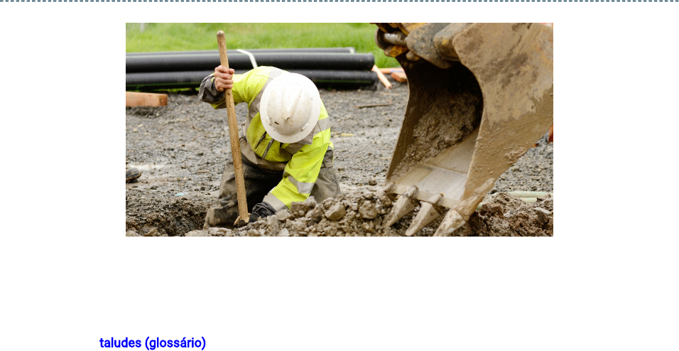 Tecnologia da Construção Aula 3 - Cuidados na etapa de escavação e execução de taludes INTRODUÇÃO Ao se pensar em obras de execução de grandes empreendimentos, em áreas urbanas, devemos perceber que escavações profundas, cortes verticais e aterros de grandes dimensões estão ficando mais evidentes e adquirindo grande importância no processo. Tal fato se dá devido à escassez de áreas para construir. Com relação aos taludes (glossário) e tipos de contenção, podemos dizer que a etapa de contenção aparece como uma das mais críticas, principalmente porque, em função dos riscos que a movimentação de terra envolve, um erro de dimensionamento, de projeto ou de execução pode ser fatal. Além disso, com o surgimento de projetos mais complexos e cronogramas mais enxutos o segmento de contenção precisou se adaptar, e dessas adaptações surgiram evoluções nas técnicas e equipamentos para atender a essa demanda. De modo geral, as técnicas vêm sendo aprimoradas. Vamos falar mais sobre esse assunto, nesta aula. OBJETIVOS Reconhecer os cuidados que devem existir durante as escavações; Identificar os principais tipos de taludes. ESCAVAÇÕES E SEUS CUIDADOS COM O ENTORNO Antes de iniciar uma escavação é importante conhecer o entorno em que se dará tal atividade. Para isso, os cuidados devem ser planejados e acompanhados durante a execução. A NBR 9061 (ABNT, 1985) afirma que o controle das edificações vizinhas e da escavação deve obedecer a um plano de acompanhamento através de inspeção e de instrumentação adequada ao tamanho da obra e das edificações vizinhas, sendo dessa forma: INSPEÇÃO Tem por finalidade observar qualquer evento cuja análise permite medidas preventivas ou considerações especiais para a segurança da obra. INSTRUMENTAÇÃO Visa à medida direta de grandezas físicas necessárias à interpretação e previsão do desempenho das obras, com referência aos critérios de segurança e econômicos adotados na fase de projeto. Nesse caso, aqui estão relacionados os equipamentos necessários, o escoramento (glossário) que deve ser feito e a sinalização e o isolamento da área da execução. 1 – VIABILIDADE Permitir a previsão de custos e prazos das diversas alternativas. 2 - PROJETO BÁSICO Detalhamento de forma a quantificar os serviços necessários ao desenvolvimento do projeto executivo. 3 - PROJETO EXECUTIVO Define claramente os diversos componentes da obra, incluindo memoriais descritivos, cálculos estruturais, desenhos, especificações técnicas e executivas, planilhas de orçamento e cronogramas básicos. 4 - PROJETO “COMO EXECUTADO” (AS BUILT) Compreende o acompanhamento sistemático da execução da obra, o reexame dos critérios de dimensionamento em função de dados obtidos durante a execução e a elaboração de um relatório final, comentando a execução com as dificuldades encontradas, sendo recomendada a complementação com fotografias. Saiba mais! , Vale lembrar que o grau de detalhamento do projeto varia de acordo com o tipo e a característica de cada obra. Durante a execução da escavação, as cargas e os carregamentos no terreno podem variar, e a NBR 9061 (ABNT, 1985) classifica em cargas estáticas e cargas dinâmicas. Veja, a seguir, as características de cada uma. Cargas estáticas São elas: Empuxo lateral do solo (glossário) Pressão hidrostática Cargas provenientes de construções próximas Acúmulo de material escavado na borda da escavação Atenção! , Atenção para esse último tipo de carga, pois na hora da elaboração do plano você deverá definir onde essa terra retirada será depositada. A NR 18 (ABNT, 2016) afirma que os materiais retirados da escavação devem ser depositados a uma distância superior à metade da profundidade, medida a partir da borda do talude. A Figura 1 apresenta bem como seria essa relação., , , , Figura 1: Relação entre a distância do local do material da escavação e a profundidade da escavação. Cargas dinâmicas São elas: Atenção! , É importante lembrar que o tráfego próximo da escavação deve ser desviado ou ter a velocidade reduzida, e para a segurança dos envolvidos, os acessos de pessoal, veículos e equipamentos devem ter sinalização permanente, além de ser proibido o acesso de pessoal não autorizado., , A Figura 2 apresenta uma sugestão de afastamentos da área de execução., , Então, conforme foi apresentado, são muitos os cuidados que devemos ter durante a escavação, e a NR 18 apresenta ainda mais outras ações que podem garantir a segurança dos envolvidos na atividade, são elas: Assim, muros, edificações vizinhas e todas as estruturas que possam ser afetadas pela escavação devem ser escorados. A Figura 4 apresenta um exemplo de escoramento de vegetação próxima à área de escavação. Durante toda a fase de execução e durante a existência da escavação, é indispensável ter-se no canteiro de obra um arquivo contendo os seguintes documentos: PRINCIPAIS TIPOS DE TALUDES Podemos dizer que talude é uma superfície inclinada do solo que limita um platô. Os taludes também são chamados de encostas e podem ser naturais ou construídos artificialmente pelo homem, como mostra a Figura 5. Fonte: hanss / Shutterstock Saiba mais! , Os taludes de aterro devem ser menos inclinados do que os de corte. A escolha para o tipo de contenção mais adequada depende do estudo detalhado de cada caso, das condições específicas da obra e da região. Mas, lembramos que, cada vez mais, o estudo dos processos de estabilização de taludes e suas formas de contenção tornam-se necessários, devido a desastrosas consequências que os escorregamentos acarretam. Então, vamos conhecer alguns tipos de contenção. Estruturas de contenção com solo reforçado com geossintéticos. Essa forma de contenção consiste no uso de mantas geotêxteis ou geogrelhas intercaladas com camadas de aterro compactado, como pode ser visto