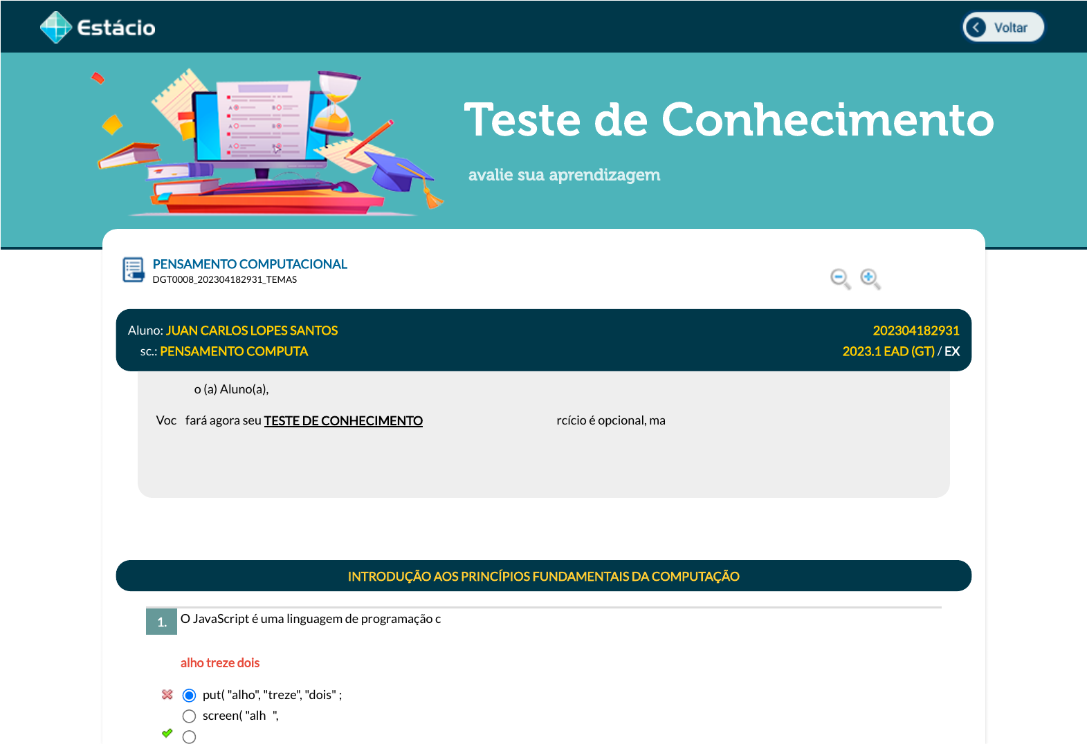 07/06/2023, 09:28 Estácio: Alunos https://simulado.estacio.br/alunos/ 1/8 Teste de Conhecimento avalie sua aprendizagem O JavaScript é uma linguagem de programação criada em meados da década de 90 e de fácil assimilação por apresentar uma sintaxe simples e intuitiva. Acerca dessa linguagem, marque a opção que representa o código Javascript que produz o resultado abaixo. alho treze dois PENSAMENTO COMPUTACIONAL Lupa DGT0008_202304182931_TEMAS Aluno: JUAN CARLOS LOPES SANTOS Matr.: 202304182931 Disc.: PENSAMENTO COMPUTA 2023.1 EAD (GT) / EX Prezado (a) Aluno(a), Você fará agora seu TESTE DE CONHECIMENTO! Lembre-se que este exercício é opcional, mas não valerá ponto para sua avaliação. O mesmo será composto de questões de múltipla escolha. Após responde cada questão, você terá acesso ao gabarito comentado e/ou à explicação da mesma. Aproveite para se familiarizar com este modelo de questões que será usado na sua AV e AVS. INTRODUÇÃO AOS PRINCÍPIOS FUNDAMENTAIS DA COMPUTAÇÃO 1. put( "alho", "treze", "dois" ; screen( "alho", 13, "dois" ); print( "alho", "treze", "dois" ); javascript:voltar(); javascript:voltar(); javascript:diminui(); javascript:aumenta(); 07/06/2023, 09:28 Estácio: Alunos https://simulado.estacio.br/alunos/ 2/8 Marque as opções que descreve corretamente a relação entre humanos, código-fonte e código de máquina: print( "alho", 13, 2); show( "alho", "treze" "dois" ); Data Resp.: 31/03/2023 07:49:51 Explicação: A resposta correta é: print( "alho", "treze", "dois" ); Os comandos show, put e screen não se aplicam. Como se trata de strings, elas devem estar entre aspas duplas. FUNDAMENTOS DE SOFTWARES DE COMPUTADORES 2. Compiladores são usados para testar o código de máquina antes de ele ser executado pela CPU, por razões de segurança. Código de máquina é de fácil compreensão para humanos. Então, em geral, os programadores escrevem instruções usando linguagem de máquina, e essas instruções estão prontas para serem executadas pela CPU. Código-fonte, escrito em uma linguagem de programação, é de fácil compreensão para humanos. Então, em geral, os programadores escrevem instruções usando uma linguagem de programação, e essas instruções estão prontas para serem executadas pela CPU. O código-fonte, escrito em uma linguagem de programação, é de difícil compreensão para humanos. Então, os programadores escrevem instruções de código de máquina usando uma linguagem de programação, e o compilador traduz as instruções fornecidas em um conjunto de instruções referentes à linguagem de programação. Código de máquina é de difícil compreensão para humanos. Então, os programadores escrevem instruções usando uma linguagem de programação, e o compilador traduz as instruções fornecidas em um conjunto de instruções em linguagem de máquina. Data Resp.: 31/03/2023 07:50:02 Explicação: A resposta correta é: Código de máquina é de difícil compreensão para humanos. Então, os programadores escrevem instruções usando uma linguagem de programação, e o compilador traduz as instruções fornecidas em um conjunto de instruções em linguagem de máquina. 07/06/2023, 09:28 Estácio: Alunos https://simulado.estacio.br/alunos/ 3/8 Podemos de�nir Hardware como todo equipamento �sicamente palpável da estrutura de um computador. Entre os elementos de hardware estudados, selecione a opção que indique o componente responsável efetivamente por executar instruções. Observe o código a seguir, que está manipulando uma imagem totalmente branca: FUNDAMENTOS DE HARDWARE 3. RAM. SSD. Pendrive. HD. CPU. Data Resp.: 31/03/2023 07:50:07 Explicação: A resposta correta é: CPU. A CPU (Unidade Central de Processamento) é a parte mais importante de um computador. Considerada o cérebro de um PC, ela é responsável pela execução das instruções. NOÇÕES DE PROGRAMAÇÃO: EXEMPLOS COM MANIPULAÇÃO DE IMAGENS DIGITAIS 4. 07/06/2023, 09:28 Estácio: Alunos https://simulado.estacio.br/alunos/ 4/8 Se o computador executar as linhas de código da parte 1 e, segundos depois, as linhas de código da parte 2, qual será o efeito observado nas imagens apresentadas na tela? Considere a grade de pixels a seguir: Um pixel preto se deslocando para a esquerda. Um pixel preto se deslocando para a direita. Um pixel cinza se deslocando para baixo. Um pixel cinza se deslocando para a esquerda. Um pixel preto se deslocando para baixo. Data Resp.: 31/03/2023 07:50:12 Explicação: A execução sequencial do código revelará um pixel preto, código RGB (0,0,0), se deslocando para baixo. REPRESENTAÇÃO DE IMAGENS EM COMPUTADORES 5. 07/06/2023, 09:28 Estácio: Alunos https://simulado.estacio.br/alunos/ 5/8 Quais são as coordenadas dos pixels em preto? Quantos pixels possui uma imagem com resolução de 800x600? (0,0) e (6,5) (1,2) e (5,5) (1,1) e (5,4) (0,0) e (5,4) (1,1) e (6,5) Data Resp.: 31/03/2023 07:50:26 Explicação: A resposta correta é: (0,0) e (5,4) 6. 240.000 2.800 120.000 480.000 1.400 Data Resp.: 31/03/2023 07:50:31 Explicação: A resposta correta é: 480.000 07/06/2023, 09:28 Estácio: Alunos https://simulado.estacio.br/alunos/ 6/8 Linguagens de programação são conjuntos de símbolos, palavras e regras sintáticas que permitem ao programador escrever códigos. Qual é o objetivo da utilização de uma linguagem de programação na escrita de códigos para o computador? (UNIOESTE/2022) Hardwares e Softwares são partes responsáveis pelo funcionamento que compõem um sistema computacional. Assinale a alternativa correta que indica um hardware e um software, respectivamente: INTRODUÇÃO AOS PRINCÍPIOS FUNDAMENTAIS DA COMPUTAÇÃO 7. Para que o computador compreenda o que fazer Para tornar os códigos mais chiques e chamativos Para que sejam utilizados somente os recursos principais da linguagem Para tornar os códigos mais complexos Para imprimir na tela instruções simpli�cadas Data Resp