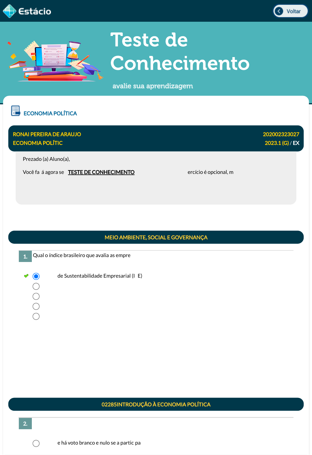 Teste de Conhecimento avalie sua aprendizagem Qual o índice brasileiro que avalia as empresas listadas no mercado local em diversos aspectos da sustentabilidade? Desde a idade média os métodos de votação são incapazes de produzir um resultado ótimo. Com relação ao do paradoxo do voto, assinale a alternativa que melhor corresponde à sua de�nição: ECONOMIA POLÍTICA RONAI PEREIRA DE ARAUJO 202002323027 ECONOMIA POLÍTIC 2023.1 (G) / EX Prezado (a) Aluno(a), Você fará agora seu TESTE DE CONHECIMENTO! Lembre-se que este exercício é opcional, mas não valerá ponto para sua avaliação. O mesmo será composto de questões de múltipla escolha. Após responde cada questão, você terá acesso ao gabarito comentado e/ou à explicação da mesma. Aproveite para se familiarizar com este modelo de questões que será usado na sua AV e AVS. MEIO AMBIENTE, SOCIAL E GOVERNANÇA 1. Índice de Sustentabilidade Empresarial (ISE). Índice Carbono E�ciente. IBOVESPA. Índice de Redução de Emissões. Índice de Sustentabilidade Dow Jones. Data Resp.: 07/06/2023 13:27:24 Explicação: A resposta correta é: Índice de Sustentabilidade Empresarial (ISE). 02285INTRODUÇÃO À ECONOMIA POLÍTICA 2. Por que há voto branco e nulo se a participação eleitoral é obrigatória? javascript:voltar(); javascript:voltar(); O sufrágio feminino nos Estados Unidos, aprovado no �nal do séc. XIX e início do séc. XX, alterou o padrão de voto dos legisladores no país e in�uenciou as políticas para maiores gastos com gasto público local em saúde. Marque a alternativa que indica a parcela mais bene�ciada pela externalidade do sufrágio feminino? O Programa Bolsa Família foi criado a partir da uni�cação de outros programas sociais preexistentes, em especial o programa de renda mínima vinculado à educação, o Bolsa Escola. Sobre o Programa Bolsa Família, assinale a alternativa que representa uma condicionalidade do programa: Por que as pessoas vendem o voto se o voto é secreto? Por que as pessoas votam se elas não acreditam que os políticos cumprirão suas promessas? Por que as pessoas votam em candidatos diferentes no primeiro e no segundo turno? Por que as pessoas votam se elas sabem que a probabilidade de fazer a diferença no resultado das eleições é praticamente nula? Data Resp.: 07/06/2023 13:28:15 Explicação: Adotamos a hipótese de racionalidade dos indivíduos. Se os indivíduos são racionais, por que eles escolhem votar, se eles sabem que a probabilidade de que seu voto seja pivotal, isto é, de que altere o resultado das eleições, é próxima de zero? É este o paradoxo do voto. As demais alternativas estão erradas por de�nição. 3. Homens Idosos Políticos Crianças Negros Data Resp.: 07/06/2023 13:28:42 Explicação: Mulheres defendiam as práticas higiênicas descobertas pela revolução bacteriológica da época. Com o aumento dos gastos em saúde como resultado do sufrágio feminino, a mortalidade infantil caiu, exclusivamente entre as doenças por causas infecciosas sensíveis a condições higiênicas, pois mulheres parecem enfatizar o bem-estar infantil mais do que as dos homens. O artigo não apresenta evidências de benefício para o público contemplado nas demais alternativas. 02663POLÍTICA REDISTRIBUTIVA 4. Amamentação de recém-nascidos Acompanhamento pós natal de gestantes Parto normal Rendimento escolar mínimo Aprovação escolar Data Resp.: 07/06/2023 14:23:07 Explicação: As condicionalidades do PBF são frequência escolar, vacinação de crianças e acompanhamento pré e pós-natal de gestantes e nutrizes. O programa exige matrícula e frequência escolar de crianças e adolescentes bene�ciários do programa, com o objetivo de mantê-los na escola, mas não exige um bom rendimento escolar. Corneo e Gruner (2002) investigam diversas forças que in�uenciam a opinião dos indivíduos em relação redistribuição de renda na sociedade. (Corneo, G. e H. P. Gruner (2002). "Individual preferences for political redistribution." Journal of Public Economics 83: 83-107). Sobre o efeito de valores públicos, assinale a alternativa correta: As políticas de ações a�rmativas são objeto de muito estudos. Considere as a�rmativas abaixo sobre esse contexto. I. Políticas de ação a�rmativa podem reduzir a discriminação estatística. II. Os resultados do artigo Powerful women: does exposure reduce bias? apontam que a exposição a políticas mulheres não teve efeito. III. Políticas de ação a�rmativa tem um papel de informar indivíduos sobre a qualidade de agentes, como é no caso de cotas para mulheres na política. São verdadeiras apenas as a�rmativas: 5. Os indivíduos podem nutrir crenças idiossincráticas sobre as contribuições da origem familiar e do esforço individual para o sucesso econômico pessoal Se um indivíduo acredita que o trabalho árduo pessoal é mais importante para a determinação da renda individual, então espera-se que ele seja a favor da redistribuição Há uma ligação a priori entre a renda bruta de um indivíduo e seu apoio a políticas conservadoras de redistribuição Os indivíduos tem uma função de bem-estar social que expressa suas preferências sobre a alocação de recursos individual, apenas Se um indivíduo acredita que as origens familiares são os principais determinantes da renda individual, então espera-se que ele seja contra a redistribuição Data Resp.: 07/06/2023 14:21:05 Explicação: Os indivíduos podem ser dotados de uma função de bem-estar social que expressa suas preferências sobre a alocação de recursos para todos os indivíduos da sociedade, de modo que não haja uma ligação a priori entre renda bruta do indivíduo e seu apoio a políticas redistributivas. Nesse sentido, cada indivíduo pode ter uma crença particular a partir do papel das origens familiares e esforço individual para o sucesso econômico pessoal. Aqueles que acreditam na forte in�uên