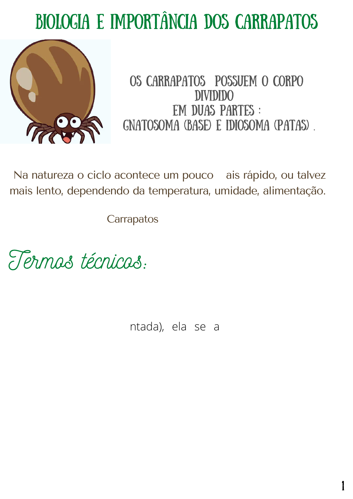 BIOLOGIA E IMPORTÂNCIA DOS CARRAPATOS Os carrapatos possuem o corpo dividido em duas partes : Gnatosoma (base) e Idiosoma (patas) . Na natureza o ciclo acontece um pouco mais rápido, ou talvez mais lento, dependendo da temperatura, umidade, alimentação. Carrapatos de 1 hospedeiro Carrapato de 3 hospedeiros Termos técnicos: Ovo – NEOLARVA (Larva que não está alimentada) – METALARVA (larva alimentada) –metalarva sofre ecdise e torna-se: NEONINFA (não alimentada), ela se alimenta e dá origem a METANINFA (ingurgitada). Já os adultos são chamados de: O que vem da metaninfa pode ser macho ou fêma. Se for macho temos o NEANDRO (a forma adulto que não esta ingurgitada, não esta apto a cópula) e o GONANDRO (neandro se alimenta e torna-se gonandro que é um macho em condições de cópula e que está ingurgitado). Em relação a fêmea, chamamos de NEÓGINA (fêmea não ingurgitada, e não está apta a cópula) e TELEÓGINA (ingurgitada, e está apta a cópula. A medida que ela vai sugando sangue, vai acontecendo a cópula). 1 O que podemos encontrar fora do Hospedeiro, nos carrapatos que exigem 1 hospedeiro? Ovo, Neolarva (podemos encontrar no hospedeiro e fora), teleógina, quenógina (fêmea morta). Ciclo a nível de hospedeiro? Metalarva, neoninfa, metaninfa, adultos (menos a teleógina). Cópula ocorre a nível de hospedeiro. Depois da cópula, a fêmea caí e o macho contínua em busca de outra fêmea. A PARTIR DA INFECÇÃO QUE É DADA PELA NEOLARVA, ELA FICA NAS GRAMÍNEAS/NO PASTO/EM BAIXO DAS FOLHAS, QUANDO O ANIMAL PASSA PARA SE ALIMENTAR, ELAS AUTOMATICAMENTE PASSAM PARA O HOSPEDEIRO,POR TEMPERATURA/CALOR. ENTÃO ELA PASSA, E BUSCA UM LOCAL DE PELE MAIS FINA PARA SE FIXAR. CHAMO ATENÇÃO PARA UBERE DA FEMEA E TESTICULOS DO MACHO. ELA SE FIXA COMO NEOLARVA, DEPOIS QUE ELA SUGA, ELA PASSA A SER METALARVA. ALIMENTADA, ELA SOFRE ECDISE E PASSA A SER NEONINFA. (A METALARVA SOFRE ECDISE). P.I: Boophilus, mais ou menos 19 a 21 dias. Ciclo de 1 Hospedeiro 2 CARRAPATOS DE 3 HOSPEDEIROS A TERMINOLOGIA É A MESMA, MAS O LOCAL DE ECDISE É DIFERENTE. Tudo começa no solo, o que tem no solo? A teleógina e ovos (Inicio de tudo). Se estamos falando de carrapatos de três hospedeiros (Periodo de incubação de Amblyomma: 29 a 31 dias/ Rhipicephalus: 22 a 25 dias). Saí dos ovos uma neolarva, essa neolarva vai subir no primeiro hospedeiro, quando ela chega no primeiro hospedeiro ela se fixa e suga o sangue é chamada de metalarva, a metalarva ingurgitada caí no solo e procura um local de sombra e umidade para sofrer ecdise (ocorre em 4 a 5 dias) para neoninfa. Essa neoninfa não esta ingurgitada, e para ingurgitar ela sobe no segundo hospedeiro, ela sobe como neoninfa se ingurgita e passa a ser chamada de metaninfa ingurgitada e caí no solo para sofrer ecdise para adulto machos e fêmeas (neandro e neogina), machos neandro e neogina sobem no hospedeiro não ingurgitados para se tornar ingurgitada, quando ingurgitada passam a ser chamados de gonandro e teleogina. (FECHANDO O CICLO) 3 4 Quais formas são encontradas fora do hospedeiro e que estão ingurgitadas que sofrem ecdise? METALARVA, METANINFA. Quais fases encontradas fora do hospedeiro? Ovo, teleogina, quenogina, metalarva e metaninfa. Temos sazonalidade, e devemos fazer controle dos carrapatos com anti carrapaticida e tratar o local. Durante o ano todo tem-se carrapato, e isso é bom pq os animais possuem anticorpos contra babesia e outras doenças. Febre maculosa do homem. Babesia Cabali, eqüinos – Transmitidas pelo Amblyomma Cajennense. OBS 5 Boophilus micropulus Amblyomma cajennense Anocentor nitens