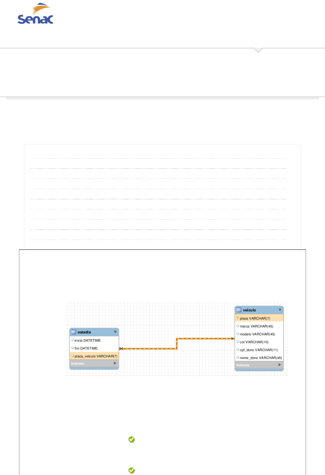 Quiz REVISAR ENVIO DO TESTE: CLIQUE AQUI PARA INICIAR O QUIZ Usuário Curso Teste Iniciado Enviado Data de vencimento Status Completada Resultado da tentativa 10 em 10 pontos Tempo decorrido 25 minutos Resultados exibidos Todas as respostas, Respostas enviadas, Respostas corretas, Comentários Pergunta 1 Resposta Selecionada: b. Respostas: a. b. Considere a seguinte modelagem feita para o banco de dados de um sistema de estacionamento: Descrição acessível: tabela estadia com campos inicio, fim e placa_veiculo; tabela veiculo com campos placa, marca, modelo, cor, cpf_dono e nome_dono; estadia.placa_veiculo é chave estrangeira para veiculo.placa. Assinale a alternativa que indica em que forma normal se encontra essa modelagem. 2FN. 1FN. 2FN. Sala de Aula Tutoriais 1 em 1 pontos https://senacsp.blackboard.com/webapps/blackboard/content/listContent.jsp?course_id=_211762_1&content_id=_9493136_1&mode=reset https://www.ead.senac.br/ https://senacsp.blackboard.com/webapps/portal/execute/tabs/tabAction?tab_tab_group_id=_260_1 https://senacsp.blackboard.com/webapps/portal/execute/tabs/tabAction?tab_tab_group_id=_210_1 https://senacsp.blackboard.com/webapps/login/?action=logout c. d. e. Comentário da resposta: 3FN. BCFN. Essa modelagem não atende nem à 1FN. b. Essa modelagem viola a 3FN, pois cpf_dono e nome_dono são funcionalmente dependentes entre si. Como há uma violação da 3FN e não há violações nem da 2FN nem da 1FN, então a modelagem apresentada está na 2FN. A modelagem não viola a 1FN pois não há campos mul�valorados. Ela também não viola a 2FN, o que ocorreria se algum atributo não primário fosse funcionalmente dependente de parte de alguma chave da tabela. Pergunta 2 Resposta Selecionada: b. Considere as seguintes tabelas: CREATE TABLE bares (nome text, preco float); CREATE TABLE restaurantes (nome text, preco float); CREATE TABLE cafes (nome text, preco float); Assinale a alternativa que forneça um significado plausível para o seguinte comando: SELECT nome, preco FROM ( SELECT nome, preco FROM bares WHERE preco = (SELECT min(preco) FROM bares) UNION SELECT nome, preco FROM restaurantes WHERE preco = (SELECT min(preco) FROM restaurantes) UNION SELECT nome, preco FROM cafes WHERE preco = (SELECT min(preco) FROM cafes) ) as lazer WHERE preco < 100; Um rapaz está procurando um lugar para marcar um encontro. Ele está em dúvida entre um restaurante, um bar ou um café. Como o rapaz está com pouco dinheiro, ele vai considerar somente as opções mais baratas de cada categoria, e desde que o preço da diversão não saia mais que 100 reais. 1 em 1 pontos Respostas: a. b. c. d. e. Comentário da resposta: Um inves�dor está procurando um estabelecimento para comprar. Ele está analisando um certo conjunto de restaurantes, bares e cafés. Ele pretende comprar o mais barato entre todos esses estabelecimentos, desde que o preço não ultrapasse 100 mil reais. Um rapaz está procurando um lugar para marcar um encontro. Ele está em dúvida entre um restaurante, um bar ou um café. Como o rapaz está com pouco dinheiro, ele vai considerar somente as opções mais baratas de cada categoria, e desde que o preço da diversão não saia mais que 100 reais. Um inves�dor pretende comprar um restaurante, um bar e um café. Mas o café ele só vai comprar se custar menos de 100 mil reais. Uma construtora aluga espaços para estabelecimentos comerciais, como restaurantes, bares e cafés. Um analista dessa construtora está montando um relatório com os aluguéis mais rentáveis para a construtora. A consulta não significa nada, pois possui um erro de sintaxe. b. A consulta retornará a princípio três registros: o restaurante mais barato, o bar mais barato e o café mais barato. Mas cada uma dessas três linhas só será exibida se seu preço correspondente for menor que 100. Pergunta 3 Considere a seguinte tabela: Tabela de municípios: n o m e u f p o p u l a c a o a r e a S ã o P a S P 1 2 2 5 2 1 5 2 1 1 em 1 pontos ul o 0 2 3 B el o H or iz o nt e M G 2 5 1 2 0 7 0 3 3 1 S or o c a b a S P 6 7 9 3 7 8 4 5 0 G u ar at in g u et á S P 1 2 1 7 9 8 7 5 2 R a n c h ar ia S P 2 9 7 0 7 1 5 8 7 Al ta m ir a P A 1 1 4 5 9 4 1 5 9 5 3 3 Fonte: https://cidades.ibge.gov.br/ É correto afirmar que essa tabela: Resposta Selecionada: c. Respostas: a. b. c. d. e. Comentário da resposta: Possui os campos “nome”, “uf”, “populacao” e “area”. Possui 4 campos e 7 registros. Possui 4 registros. Possui os campos “nome”, “uf”, “populacao” e “area”. U�liza todos os �pos de colunas presentes no MySQL: text e integer. Não é uma tabela; na verdade é uma tupla. c. Cada coluna que vemos corresponde a um campo da tabela do banco de dados. A primeira linha que vemos representa os nomes dos campos; já as linhas subsequentes representam os registros da tabela do banco de dados. Pergunta 4 Resposta Selecionada: b. Considere a seguinte tabela de pratos disponíveis em um restaurante: CREATE TABLE pratos (nome text, pais_origem text, vegetariano boolean, preco float); Considerando essa tabela, assinale a alternativa com o comando que torna possível a execução da seguinte consulta: SELECT pais_origem as pais, count(*) as qtd_pratos_vegetarianos FROM pratos_vegetarianos GROUP BY pais_origem; +--------+-------------------------+ | pais | qtd_pratos_vegetarianos | +--------+-------------------------+ | Índia | 10 | | Itália | 7 | | Brasil | 4 | +--------+-------------------------+ CREATE VIEW pratos_vegetarianos AS SELECT nome, pais_origem FROM pratos WHERE vegetariano; 1 em 1 pontos Respostas: a. b. c. d. e. Comentário da resposta: CREATE SUBSELECT pratos_vegetarianos AS SELECT nome, pais_origem AS pais FROM pratos WHERE vegetariano; CREATE VIEW pratos_vegetarianos AS SELECT nome, pais_origem FROM pratos WHERE vegetariano; CREATE SUBSELECT pratos_vegetarianos AS SELECT nome, pais_origem FROM pratos WHERE vegetariano; CREATE VIEW pratos_vegetarianos FROM SELEC