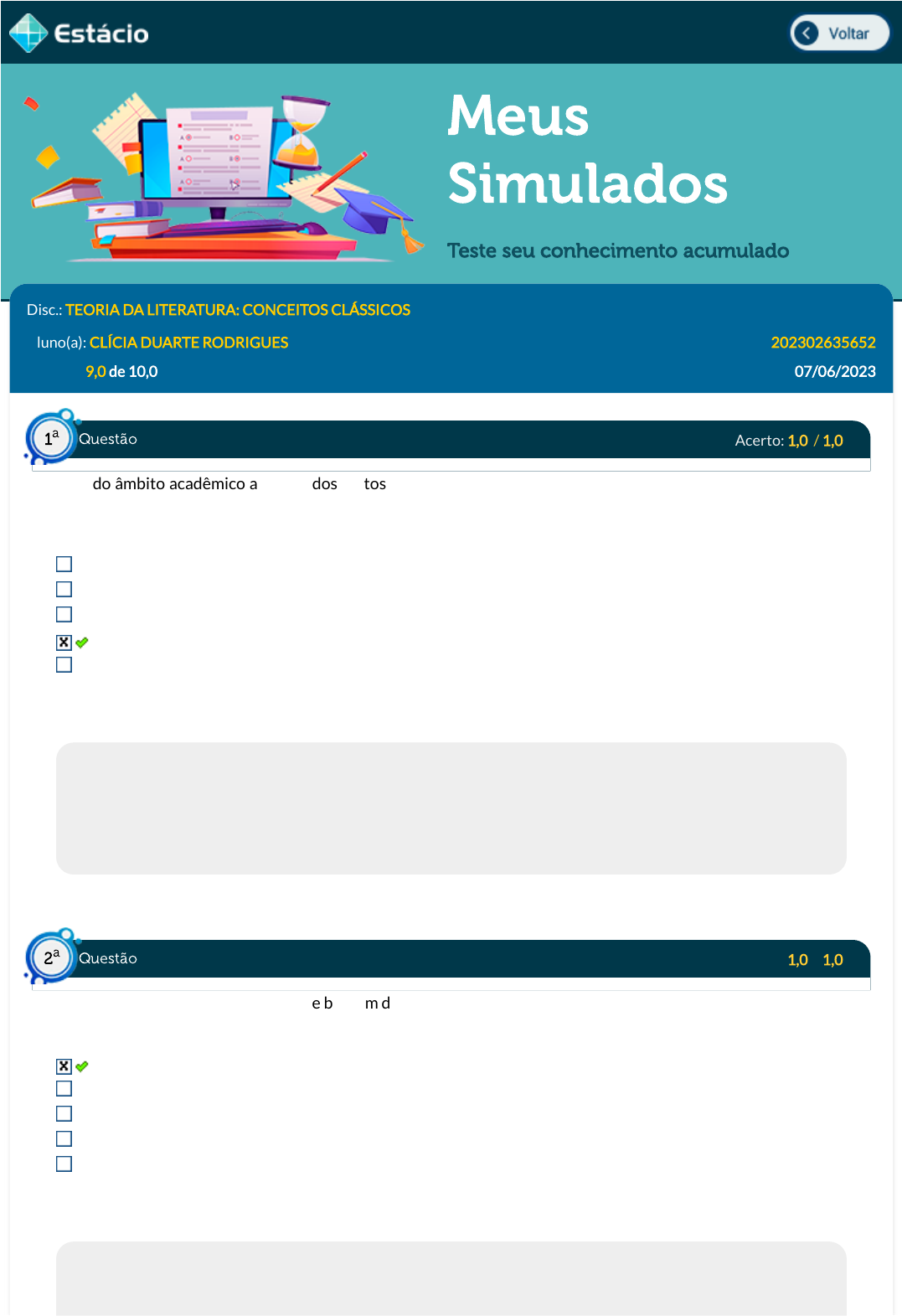 07/06/2023 11:15 Estácio: Alunos https://simulado.estacio.br/bdq_simulados_avaliacao_parcial_resultado.asp?cod_hist_prova=311975378&cod_prova=6456334672&f_cod_disc= 1/5 Meus Simulados Teste seu conhecimento acumulado Disc.: TEORIA DA LITERATURA: CONCEITOS CLÁSSICOS Aluno(a): CLÍCIA DUARTE RODRIGUES 202302635652 Acertos: 9,0 de 10,0 07/06/2023 Acerto: 1,0 / 1,0 Fora do âmbito acadêmico a leitura dos textos apoia-se, via-de-regra, no senso comum. Contudo, a modalidade de leitura proposta pela Teoria da Literatura para o texto literário, além da fundamentação teórica e do método, envolve: a relação de homologia com os textos historiográ�cos e jornalísticos. a recriação do texto em outros sistemas semióticos. o questionamento dos princípios políticos, éticos, morais e religiosos do autor. a análise, a re�exão, o exame crítico e a multiplicidade de enfoques ou abordagens. a discussão dos pressupostos metafísicos e transcendentais que in�uenciaram o autor. Respondido em 07/06/2023 10:35:37 Explicação: A Teoria da Literatura é um campo novo, ela é moderna, e leva em conta os estudos literários que tiveram início no século XIX, a partir do romantismo. Ela é descritiva, analítica e tem como objeto os discursos sobre literatura, a crítica e a história literárias, que serão questionados, problematizados e organizados. A teoria vai se opor ao senso comum, reagirá às práticas ou crenças que julgar ateóricas ou antiteóricas. Acerto: 1,0 / 1,0 Há diversas teorias e concepções que buscam de�nir o que é literatura. Pensando nas possíveis de�nições aponte qual de�nição abaixo representa o que é literatura para Aristóteles. A arte da palavra. Uma manifestação popular. O conjunto de obras catalogadas em bibliotecas. A arte de interpretar um texto. Um conjunto de obras �losó�cas. Respondido em 07/06/2023 10:36:11 Explicação: Questão1 a Questão2 a https://simulado.estacio.br/alunos/inicio.asp javascript:voltar(); 07/06/2023 11:15 Estácio: Alunos https://simulado.estacio.br/bdq_simulados_avaliacao_parcial_resultado.asp?cod_hist_prova=311975378&cod_prova=6456334672&f_cod_disc= 2/5 O �lósofo grego Aristóteles, na Poética, obra fragmentária, pois uma parte se perdeu, considera a literatura a arte da palavra. Embora não tenha utilizado a expressão literatura, Aristóteles procurou descrever o que nomeamos atualmente de fato literário. Acerto: 1,0 / 1,0 Segundo a Poética de Aristóteles, Tragédia é uma imitação de uma ação de carácter elevado, completa e de certa extensão, em linguagem ornamentada ao longo das suas diversas partes. Imita-se não através da narração, mas através de atores e da ação. Sobre a tragédia, é correto a�rmar: É executada com a �nalidade de suscitar piedade e compaixão pela catarse. A tragédia em nada se assemelha à epopeia. Uma das principais obras trágicas da Antiguidade é a Ilíada, de Homero. Não questionam o caráter de seus protagonistas. Imita o que Aristóteles chama de homens inferiores. Respondido em 07/06/2023 10:38:12 Explicação: A Ilíada, de Homero é um poema épico. Imita o que Aristóteles chama de homens superiores. A tragédia possuía a matéria semelhante à epopeia quanto ao modo de imitação, pois ambas se voltavam para as representações de feitos heroicos. Entretanto, quanto ao gênero, a tragédia se diferenciava da epopeia, pois se servia da ação (das personagens), e não era narrada. Aristóteles, conceitua a tragédia como um tipo de mimesis de caráter completo e elevado, executada com a �nalidade de suscitar piedade e compaixão pela catarse ou sublimação dessas emoções. As obras essenciais do gênero colocam em questão o ethos do protagonista (seu caráter) em confronto com seu destino (dáimon). Acerto: 1,0 / 1,0 Os gêneros literários são um referencial importante para pensarmos sobre as obras literárias. Sobre a linguagem literária e gêneros literários, analise as a�rmações. I. Uma das marcas do gênero lírico é a exposição das emoções individuais. II. A Ilíada, de Homero, é uma epopeia III. A tragédia e a comédia pertencem ao gênero dramático. IV. O soneto pertence ao gênero narrativo. É correto o que se a�rma em: I e II, apenas. I e III, apenas. II e IV, apenas. II e III, apenas. I, II e III, apenas. Respondido em 07/06/2023 10:39:36 Explicação: O soneto pertence ao Gênero Lírico. Questão3 a Questão4 a 07/06/2023 11:15 Estácio: Alunos https://simulado.estacio.br/bdq_simulados_avaliacao_parcial_resultado.asp?cod_hist_prova=311975378&cod_prova=6456334672&f_cod_disc= 3/5 Acerto: 1,0 / 1,0 Observe as a�rmativas abaixo, considerando que os poemas, de acordo com as suas estrofes e formas estró�cas podem sofrer diferentes classi�cações. I. O soneto (clássico) é uma composição de quatorze versos, distribuídos em dois quartetos iniciais e dois tercetos �nais; II. O verso de sete sílabas é também denominado "verso de redondilha menor"; III. A estrofe com cinco versos denomina-se quintilha; IV. O verso decassílabo heroico é acentuado na 6º e 10º sílabas; Estão corretas apenas as a�rmativas: I, III e IV. II, III e IV. I e III. I, II e IV. I, II e III. Respondido em 07/06/2023 10:40:33 Explicação: A resposta correta é: I, III e IV. II. Os versos que possuem cinco sílabas poéticas são chamados de redondilhas menores, já os que possuem sete sílabas são redondilhas maiores. Acerto: 1,0 / 1,0 O elemento da estrutura do poema que corresponde à semelhança de sons, seja no �nal de diferentes versos ou no interior de um mesmo verso, é identi�cado com: O tropo A cesura A rima A estrofe O metro Respondido em 07/06/2023 10:40:44 Explicação: A resposta correta é: A rima Acerto: 1,0 / 1,0 Classi�car as obras literárias de acordo com aquilo que viríamos a chamar de gênero é um trabalho que iniciou- se na antiguidade clássica com os estudos de alguns importantes �lóso