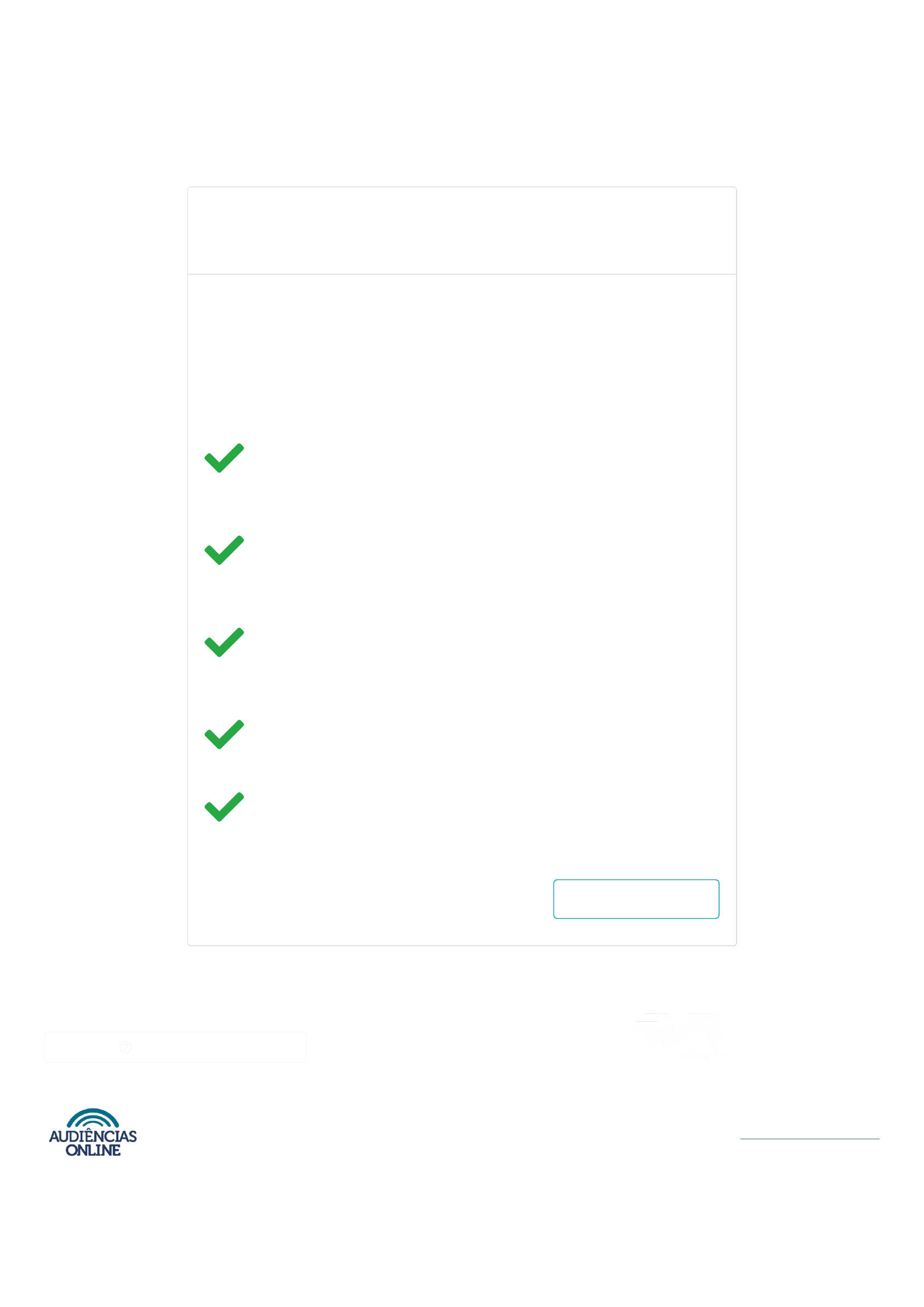 04/10/2022 15:02 Audiências online https://audienciasonline.com.br/#/avaliacao/5c82c1ad78b3e14e47219087 1/1 Avaliação de Conhecimento : Justiça do Trabalho Audiências de Instrução Audiência Trabalhista de Instrução 03 Audiência Trabalhista de Instrução 03 Processo: 0024987-32.2016.5.24.0007 Voltar para a home Parabéns, você atingiu a pontuação necessária para a emissão do certificado. Dentro de no máximo 5 minutos você poderá acessar o seu certificado na opção "Meus Certificados", existente no Menu. De acordo com o preposto da empresa reclamada qual o horário que deveria ser cumprido pelo reclamante? 8-18 (horas) Qual o cargo que o reclamante ocupava na empresa reclamada? montador Em que ano o reclamante alegou ter sido dispensando pela empresa reclamada? 2016 Quantas testemunhas foram ouvidas? 1 Por quantos anos o autor afirmou que trabalhou para a empresa reclamada? 2 contato@avaeducacao.com.br CENTRAL DE DUVIDAS contato@avaeducacao.com.br Central de ajuda CONECTE-SE Apoio ©2022 Audiencias Online. Política de Privacidade Usuário logado com sucesso! mailto:contato@audienciasonline.com.br mailto:contato@audienciasonline.com.br https://www.facebook.com/joseandradeaudienciasonline/ https://www.youtube.com/channel/UC0VPVc46sgqyslyCuEOk0Lw https://www.instagram.com/joseandradeao/?hl=pt https://t.me/juizjoseandrade