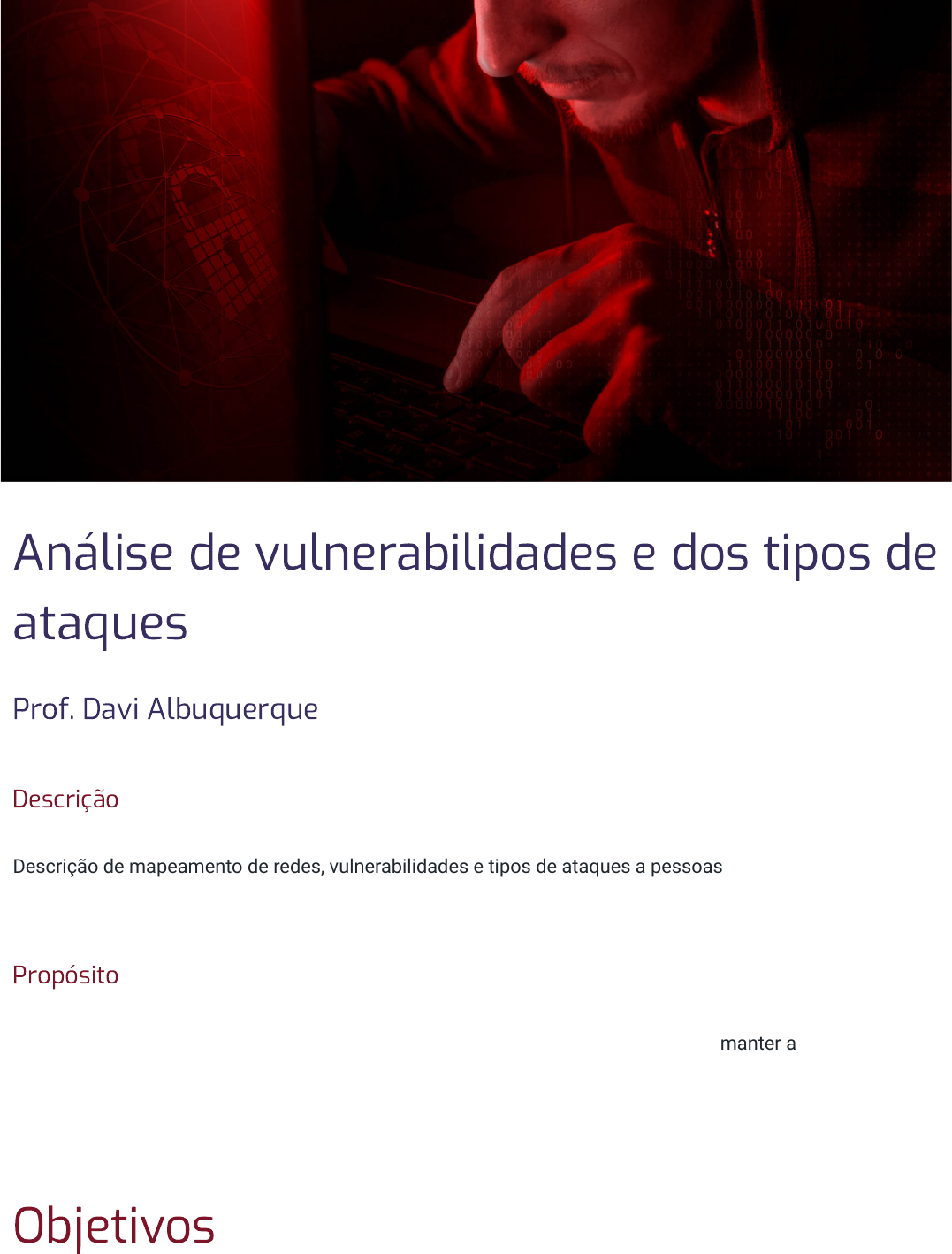 Análise de vulnerabilidades e dos tipos de ataques Prof. Davi Albuquerque Descrição Descrição de mapeamento de redes, vulnerabilidades e tipos de ataques a pessoas e instituições. Demonstração do procedimento de ataque e exemplificação de formas de ataques diferentes. Propósito O conhecimento de diferentes formas de ataque é essencial para um técnico de TI manter a segurança em redes, serviços, aplicações e até para pessoas no meio digital ou aqueles que escolherem trabalhar com segurança da informação ou não. Objetivos Módulo 1 Mapeamento de Redes Relacionar os principais meios de varredura de redes e vulnerabilidades. Módulo 2 Ataques Comuns Avaliar principais tipos de ataques a instituições e pessoas. Módulo 3 Malwares Classificar os principais tipos de códigos maliciosos utilizados por atacantes. Módulo 4 Wireless Hacking Distinguir os principais métodos de ataques a redes sem fio. Introdução O presente conteúdo tem como objetivo demonstrar e analisar os principais métodos de ataques a pessoas e instituições. Inicialmente, será discutido como um invasor ou atacante consegue informações sobre uma rede. Esses processos fazem parte da análise inicial de um hacker para conhecer a rede alvo. Em seguida, serão discutidos os principais tipos de ataques utilizados por invasores para tentar comprometer uma rede, causando danos aos serviços instalados nessa rede e às pessoas que a utilizam. Será dada atenção especial a códigos maliciosos, ou malwares, e ataques a redes sem fio, no fim do texto. Todos os procedimentos abordados aqui podem ser utilizados pelos atacantes, mas também pela equipe de TI responsável pela rede e pelos serviços, interna e externamente a uma instituição. Esses conhecimentos são base para manter a segurança dessas redes e também das pessoas que a utilizam. Isso porque, para se defender, é importante saber como será atacado. 1 - Mapeamento de Redes Ao �nal deste módulo, você será capaz de relacionar os principais meios de varredura de redes e vulnerabilidades. O que é mapeamento de redes? De�nição O mapeamento de redes pode ser compreendido como o processo de descoberta de hosts ativos, sistemas operacionais desses hosts, serviços abertos e tudo que for possível descobrir sobre determinada rede. Para isso, são utilizadas ferramentas de manipulação de pacotes TCP, UDP, ICMP. Esse conjunto de técnicas é utilizado por atacantes para tomar conhecimento da estrutura da rede e como funciona. Aplicações Atualmente, o mapeamento de redes é parte importante no processo de Penetration Test, ou pentest, em que uma equipe é contratada para simular o ataque de um agente malicioso em sua rede. O mapeamento de rede é uma das primeiras fases desse processo, para identificar os servidores e aplicações que estão disponíveis na rede. Fases O mapeamento de redes pode ser dividido em fases: Host Scan, Port Scan, Service Scan/OS fingerprint e varredura de vulnerabilidade. A primeira fase, Host Scan, tem como objetivo descobrir quais são os servidores, máquinas ou dispositivos ligados à rede. Por organização, é importante executar o host scan antes de qualquer outra varredura. Host Scan A primeira fase tem como objetivo descobrir quais são os servidores, máquinas ou dispositivos ligados à rede. Port Scan Port Scan tem como objetivo descobrir quais são as portas TCP e UDP abertas nesses servidores. Service Scan/OS �ngerprint Service Scan/OS fingerprint objetiva descobrir quais são serviços no servidor e qual o seu sistema operacional. Varredura A varredura de vulnerabilidades é a fase de pesquisa que indica quais vulnerabilidades os servidores possuem. Por organização, é importante executar o host scan antes de qualquer outra varredura. Hot Scan – ferramente ping O utilitário ping é encontrado nativamente na maioria dos sistemas operacionais. Essa ferramenta utiliza o protocolo ICMP (Internet Control Message Protocol ou, em português, Protocolo de Mensagens de Controle da Internet). O ping envia um pacote de ICMP Request para uma máquina. Se a máquina alvo estiver ativa e respondendo pacotes ICMP, ela responderá com um pacote ICMP Reply. A execução do ping é muito simples e é demonstrada na imagem a seguir. Captura de tela da ferramenta de linha comando ping. Cada linha que se inicia com “64 bytes” representa um pacote ICMP Reply recebido pela máquina alvo que, no caso, é 8.8.8.8. Também é possível realizar o Host Scan com a ferramenta fping, que envia pacotes ICMP para múltiplas máquinas simultaneamente. A imagem a seguir mostra um exemplo do comando executado pelo fping. Captura de tela da ferramenta de linha comando fping. Ferramenta nmap O nmap, ou Network Mapper, é uma ferramenta extremamente poderosa quando se fala em mapeamento de redes. É capaz de verificar a conectividade entre hosts, verificar portas abertas em hosts remotos e, ainda, identificar os serviços e vulnerabilidades nas portas de hosts. Isso é possível devido à utilização de várias técnicas de mapeamento de rede, além da utilização de scripts para mapeamento de serviços, vulnerabilidades e até mesmo para tentar identificar o sistema operacional de um host remoto. Hot Scan – nmap Até agora, foi mostrado como fazer o Host Scan com as ferramentas ping e fping. O nmap desempenha essa tarefa de uma forma mais completa, testando não apenas pacotes ICMP de diferentes tipos, mas também verificando as portas 443 e 80 do protocolo TCP (Transport Layer Protocol, ou, em português, Protocolo da Camada de Transporte). Captura de tela de Host Scan com a ferramente nmap na rede 192.168.56.0/24. O nmap, por padrão, primeiro descobre se o host está ativo e, caso esteja, executa uma varredura nas mil portas mais utilizadas. A opção '-sn' mostrada na imagem é utilizada para dizer ao nmap que ele deve executar apenas o teste se os hosts estão ativos. No resultado, é possível ver que o único ho