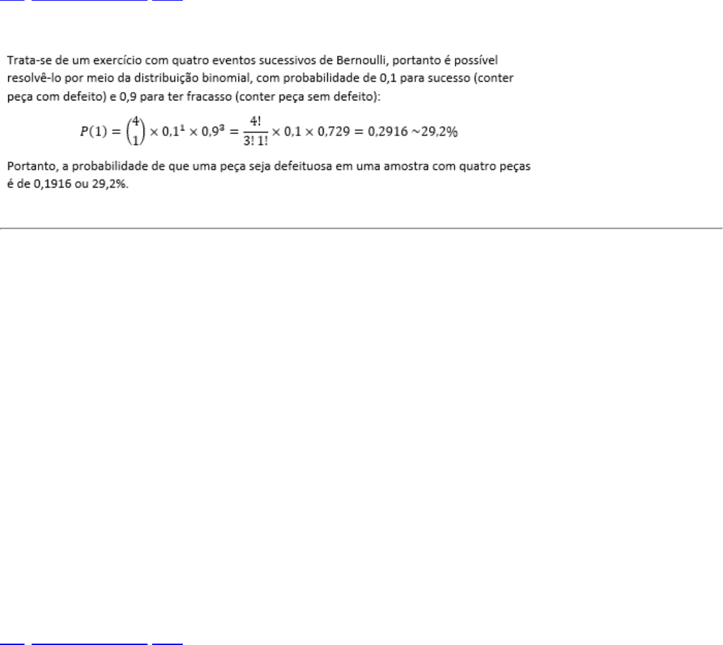 08/06/2023, 12:57 Aluno AVA https://unifacvestead.portalava.com.br/aluno/prova-online/confirma-prova 1/9 QUESTÃO 1 Na manufatura de certo produto, é sabido que 1 entre 10 é defeituoso. Qual é a probabilidade aproximada de que uma amostra aleatória de tamanho 4 contenha exatamente 1 produto defeituoso? Assinale a alternativa correta. a ) 15,8%. b ) 48,5%. c ) 29,2%. d ) 37,4%. e ) 50,6%. Ver justificativa da resposta Justificativa QUESTÃO 2 Um grupo de 125 mulheres tem a estatura média de 161,9 cm, com um desvio padrão igual a 6,01 cm. Outro grupo de 85 mulheres tem a estatura média de 160,6 cm, sendo o desvio padrão igual a 5,97. Qual é aproximadamente o coeficiente de variação de cada um dos grupos, respectivamente? Assinale a alternativa correta. a ) 5,22 e 5,38. b ) 4,72 e 4,81. c ) 7,19 e 7,10. d ) 6,12 e 6,17. e ) 3,71 e 3,71. Ver justificativa da resposta Justificativa javascript:; javascript:; 08/06/2023, 12:57 Aluno AVA https://unifacvestead.portalava.com.br/aluno/prova-online/confirma-prova 2/9 QUESTÃO 3 As pesquisas podem ser classificadas como qualitativa ou quantitativa. Leia as afirmações a seguir e considere (1) para aquelas que correspondem à pesquisa quantitativa e (2) para pesquisa qualitativa. ( ) Preocupa-se em explicar, e não em medir o fenômeno. ( ) Faz uso de métodos estatísticos. ( ) Traduz em números as opiniões e informações. ( ) Adota uma perspectiva processual do fato estudado. a ) 2, 1, 2, 1. b ) 1, 1, 2, 2. c ) 2, 1, 1, 2. d ) 1, 2, 1, 2. e ) 1, 1, 2, 1. Ver justificativa da resposta Justificativa A pesquisa qualitativa tem como natureza a profundidade. Portanto, a pertinência para a adoção de uma pesquisa qualitativa está na tentativa de identificar e descrever detalhes de um dado fenômeno de interesse por meio da observação, da narrativa ou da percepção. O interesse repousa nas particularidades e experiências individuais. Por outro lado, a pesquisa quantitativa busca a generalização. O interesse reside em identificar e descrever preferências e tendências em geral. O objetivo é descrever (e, talvez, até mesmo compreender) os fenômenos por meio da coleta de dados numéricos, os quais apontarão preferências, comportamentos e outras ações dos indivíduos que pertencem a determinado grupo ou sociedade. Para detalhes, pode-se ver o quadro a seguir. javascript:; 08/06/2023, 12:57 Aluno AVA https://unifacvestead.portalava.com.br/aluno/prova-online/confirma-prova 3/9 Quadro - Comparação entre pesquisa qualitativa e quantitativa QUESTÃO 4 Um serviço de hospedagem por meio de aplicativo foi lançado no mês passado. O diretor de marketing afirma que a média de satisfação dos usuários é superior a 8, portanto nenhuma ação corretiva precisa ser adotada, pois a nota indica satisfação. Para comprovar sua hipótese, ele solicitou uma pesquisa. Os resultados obtidos a partir de uma amostra representativa e aleatória de 30 usuários foram estes: média de 7,3 e desvio padrão de 0,5. Com nível de significância de 5%, a afirmação do diretor de marketing corresponde à realidade? Assinale a alternativa correta. a ) Não, pois há evidências de que a média de notas dos usuários seja superior a 8 pontos. b ) Sim, pois há evidências de que a média de notas dos usuários seja superior a 8 pontos. c ) Não é possível responder com exatidão, pois a média de notas dos usuários é exatamente igual a 8 pontos. d ) Sim, pois não há evidências de que a média de notas dos usuários seja superior a 8 pontos. e ) Não, pois não há evidências de que a média de notas dos usuários seja superior a 8 pontos. Ver justificativa da resposta Justificativa javascript:; 08/06/2023, 12:57 Aluno AVA https://unifacvestead.portalava.com.br/aluno/prova-online/confirma-prova 4/9 QUESTÃO 5 A declaração do objetivo é importante. Há quem afirme que, sem ele, não é possível fazer uma pesquisa. Sobre o objetivo, assinale a alternativa correta. a ) Respalda as premissas anteriores, verdadeiras ou falsas. b ) Contribui para desenvolver o planejamento da pesquisa e estabelecer metas. c ) Contesta o tema pesquisado e premissas anteriores. d ) Justifica a pesquisa a ser feita por meio dos autores mais importantes do tema. e ) Analisa e interpreta, de maneira ordenada, os dados da pesquisa de campo. Ver justificativa da resposta Justificativa Embora muitas vezes haja uma tentação de saltar diretamente para a coleta de dados (o que é compreensível, quando na urgência causada pela escassez de tempo ou pela ansiedade de se chegar rapidamente aos resultados), o primeiro passo no planejamento de uma pesquisa é a definição clara de um objetivo. É o objetivo que permite desenvolver o planejamento da pesquisa e estabelecer metas. O tema pesquisado e suas premissas anteriores são contestados ou respaldados em função dos dados coletados e de sua devida análise. QUESTÃO 6 Suponha que, com base no cálculo de uma regressão linear simples, você obtenha este modelo preditivo entre vendas anuais (em R$ milhões) e investimento em propaganda por ano (em R$ milhões): vendas=83,23+2,29× (propaganda) javascript:; 08/06/2023, 12:57 Aluno AVA https://unifacvestead.portalava.com.br/aluno/prova-online/confirma-prova 5/9 Qual é a interpretação do coeficiente 2,29? Assinale a alternativa correta. a ) Significa que, independentemente do investimento em propaganda, espera-se que as vendas anuais partam de R$ 2,29 milhões. b ) Significa que, para cada R$ milhão adicional em propaganda, espera-se que as vendas aumentem em R$ 2,29 milhões. c ) Significa o investimento em propaganda no período. d ) Significa as vendas no período. e ) Significa a relação entre vendas e propaganda no período. Ver justificativa da resposta Justificativa O coeficiente da parte variável de uma equação de primeiro grau (linear) significa o quanto a variável dependente aumenta (para funções crescentes) ou diminui (para funções decrescentes) para