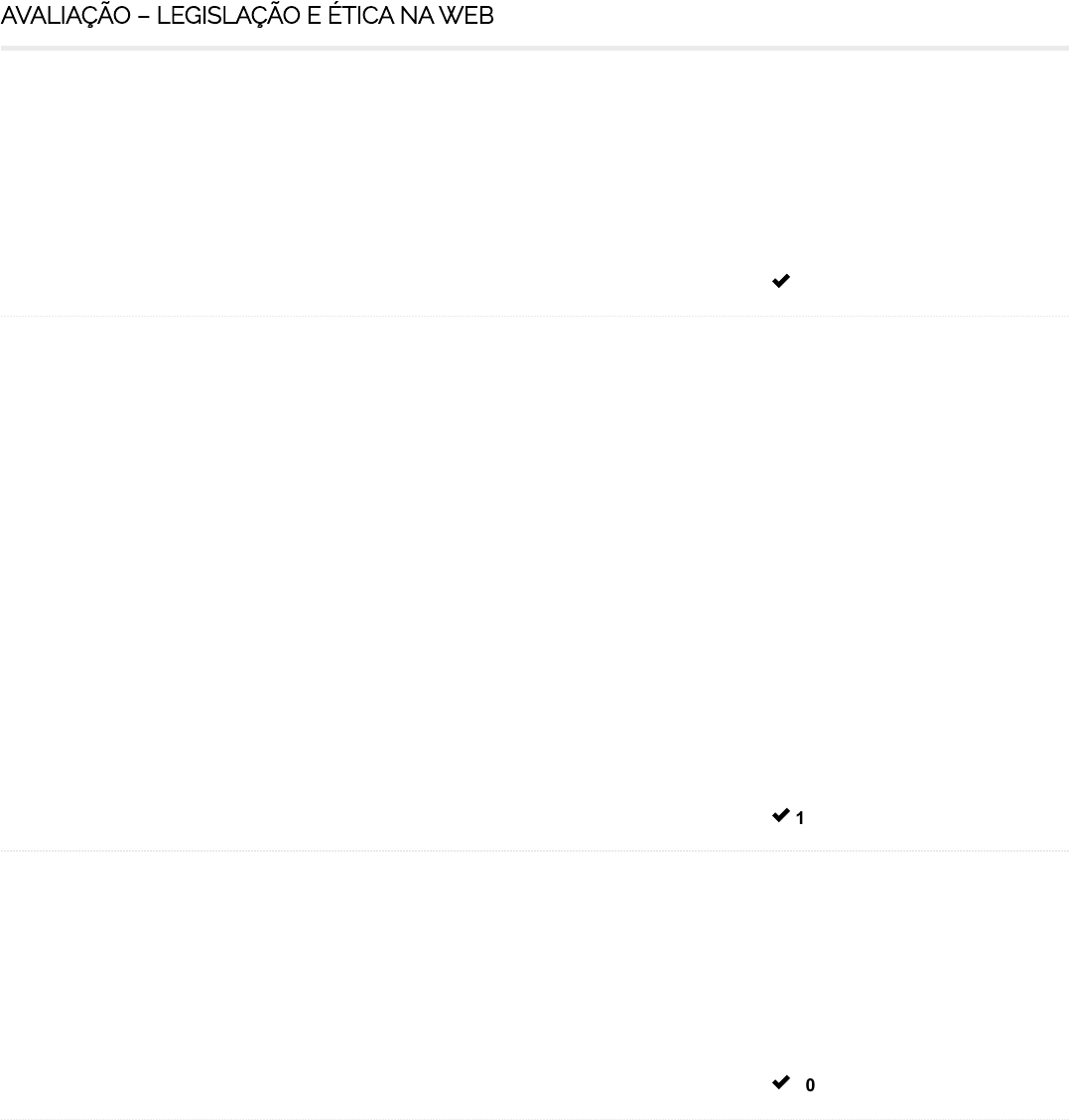 08/06/2023, 21:22 Course Status – Educaminas https://ava.educaminas.com.br/course-status/ 1/4 AVALIAÇÃO – LEGISLAÇÃO E ÉTICA NA WEB PONTUAÇÃO TOTAL: 10PONTUAÇÃO OBTIDA  10 O web jornalismo diz respeito à utilização de uma parte específica da Internet, que é a web. Analise as alternativas e assinale a INCORRETA. Resposta Marcada : Para tal é necessário ligar à internet a um navegador (browser) onde não são visualizados os conteúdos disponíveis. PONTUAÇÃO TOTAL: 10PONTUAÇÃO OBTIDA  10 Uma notícia ética dentro da Teoria Dialética de Genro, (1987) é aquela que consegue equilibrar os três eixos da percepção na hora da construção de um produto jornalístico, são eles: Analise as alternativas e marque V ( verdadeiro) ou F (falso). ( ) A singularidade, que é o fato percebido no momento pelo jornalista, sem tirar nenhuma característica e que constrói o lead – o quê, quando, onde, como e porquê. ( ) A particularidade que é a visão de mundo do jornalista, pois com a particularidade ele vai fazer um recorte fora da singularidade. ( )Transformar o fato em notícia e a universalidade que é a construção final da notícia, o contato do jornalista com o público e como ele vai fazer isso, para que o escritor entenda o que o jornalista produziu. ( ) A universalidade é a forma de compreensão tanto do jornalista como do leitor, como ele vai publicar a notícia. Resposta Marcada : V, F, F, F. PONTUAÇÃO TOTAL: 10PONTUAÇÃO OBTIDA  10 O termo web significa rede ou teia, mas com a chegada da internet, esse termo assumiu um significado maior e passou a designar a rede que conecta computadores por todo mundo, a World Wide Web (WWW). Analise e assinale a alternativa CORRETA. Resposta Marcada : No presente trabalho, discute-se sobre as características do web jornalismo como uma parte específica da Internet, que disponibiliza interfaces gráficas de uma forma bastante positiva. 08/06/2023, 21:22 Course Status – Educaminas https://ava.educaminas.com.br/course-status/ 2/4 PONTUAÇÃO TOTAL: 10PONTUAÇÃO OBTIDA  10 Analise as afirmativas a seguir: I. A sociedade acredita que o produto jornalístico não é uma criação aleatória, ficção, que as vozes são reais, que o relato é um fragmento preciso e correto da realidade; e que o jornalista usa sua capacidade técnica para reconstruir uma história da maneira menos fiel e responsável. II. O faz primeiro no processo de apuração do fato, em seguida, na seleção daquilo que considera que é mais importante, na utilização dos recursos simbólicos para permitir o entendimento e, por fim na maneira de divulgar e fazer circular. Marque a alternativa CORRETA: Resposta Marcada : A afirmativa II é verdadeira, e a I é falsa. PONTUAÇÃO TOTAL: 10PONTUAÇÃO OBTIDA  10 Quem já ouviu falar no telegrama? Ou no bilhete? Até o torpedo já ficou obsoleto. Em vez de utilizar o telegrama, utiliza-se o e-mail para passar uma informação rápida. O torpedo ficou velho e agora se tem o WhatsApp. Analise as alternativas e assinale a INCORRETA. Resposta Marcada : Para tanto, a internet veio para solucionar e acelerar transmissão de informação. PONTUAÇÃO TOTAL: 10PONTUAÇÃO OBTIDA  10 Sindicatos, mais preocupados os direitos dos profissionais da área e de organizações nacionais e internacionais, preocupados com deveres, perceberam o papel central do jornalismo, e debruçaram-se na tarefa de estabelecer fronteiras. Adiante, em anos posteriores, com o crescimento de sua importância na esfera pública era a sociedade que precisava ser protegida da ação da imprensa. Leia com atenção e marque V (verdadeiro) ou F (falso). ( ) As normas passaram então a englobar os deveres dos profissionais e empresas para com seu público. ( ) As críticas incidem sobre a subordinação dos meios de informação aos negócios, a influência crescente dos anunciantes sobre as políticas editoriais, a resistência dos jornais à mudança social, a exploração dos fait divers e do sensacionalismo, os atentados à imoralidade pública e à vida privada (CORNU, 1994, p. 42). ( ) Ao longo dos anos, o código foi modificado, outras normas em instituições que representam os profissionais surgiram e, segundo o autor, em 1987 sindicatos se ajustam para seguir as velhas orientações do Código de Ética Brasileiro. ( ) São: a missão da empresa, a liberdade de informação, a verdade como dever fundamental e o respeito a pessoa como limite. Resposta Marcada : V, F, F, V. 08/06/2023, 21:22 Course Status – Educaminas https://ava.educaminas.com.br/course-status/ 3/4 PONTUAÇÃO TOTAL: 10PONTUAÇÃO OBTIDA  10 O jornalismo se sustenta no interesse e na confiança de seu público. Depende da lealdade e da crença das pessoas (BILBENY, 2012, p.16-17) e a melhor maneira de encontrá-las, tê-las, é realizando trabalho responsável. Analise as afirmativas: I. Ofertando um produto compreensível, por meio do compartilhamento efetivo de signos e seus significados, no qual seja possível enxergar verdade no seu referencial, seja baseado em testemunho pessoal, em documentos ou no relato de fontes; com uma interpretação de dados e fatos mais próxima do fato e por meio uma preocupação extra com os efeitos dessa interpretação na vida das pessoas. II. Espera-se ainda que para obter o produto jornalístico, o percurso também tenha sido o mais correto, com métodos lícitos de apuração, sem que princípios éticos de obtenção da informação tenham sido atropelados por um sempre inquestionável interesse do público e não interesse público. Marque a alternativa CORRETA: Resposta Marcada : A afirmativa I é verdadeira, e a II é falsa. PONTUAÇÃO TOTAL: 10PONTUAÇÃO OBTIDA  10 O jornalismo é um ramo no mercado de trabalho que tem como objetivo informar a sociedade do que acontece no dia – a dia. Assinale a alternativa INCORRETA: Resposta Marcada : Diante desse cenário de múltiplas formas de se obter informação, por meio de um
