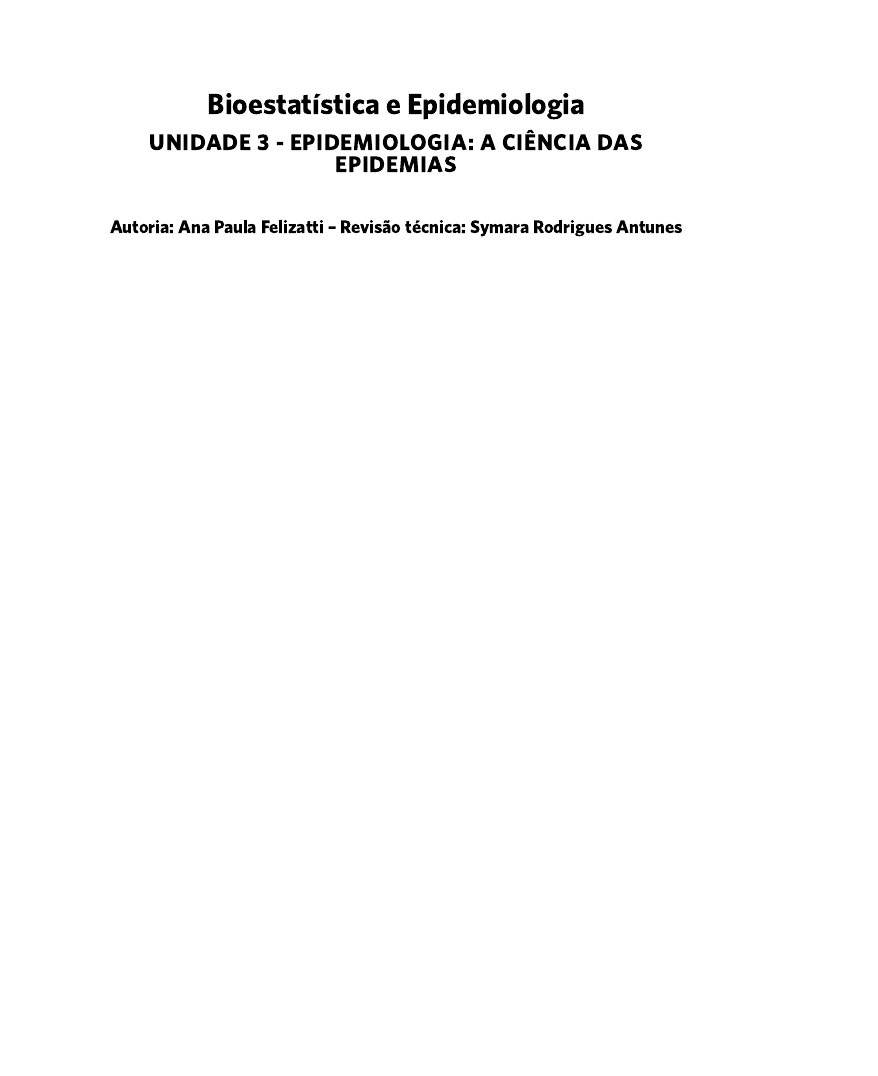 Autoria: Ana Paula Felizatti – Revisão técnica: Symara Rodrigues Antunes Bioestatística e Epidemiologia UNIDADE 3 - EPIDEMIOLOGIA: A CIÊNCIA DAS EPIDEMIAS A epidemiologia é uma ciência ampla que visa estudar determinados comportamentos patológicos coletivos, ou seja, é uma ciência voltada para o estudo de populações. Por conta de sua característica de estudo do todo, utiliza diversas ferramentas estatísticas para responder questionamentos acerca de determinada condição observada, e expandir tais conclusões para uma população predeterminada. Os estudos epidemiológicos são importantes para a saúde coletiva, uma vez que são responsáveis por monitorar e estabelecer diretrizes acerca de possíveis condições patológicas que podem acometer determinados grupos. Nesse contexto, os estudos de vigilância epidemiológica são essenciais para rastrear e elaborar planos de contenção. Você certamente já participou de uma campanha de vigilância epidemiológica, como, por exemplo, as de vacinação obrigatória. Essas campanhas auxiliam no controle de diversas doenças, sejam contagiosas ou não. Saiba que a epidemiologia vai muito além de campanhas de vacinação. Ela está presente em diversos estudos e pesquisas sobre a saúde coletiva. Você sabia que qualquer doença pode ser considerada uma epidemia, mesmo que não seja transmissível? Por exemplo, quando uma grande parcela da população apresenta indícios de obesidade ou doenças respiratórias, pode-se ter o início de uma epidemia envolvendo esses fatores, por conta do número de pessoas em um mesmo intervalo de tempo. E como identificar as causas e conter os avanços de condições de saúde coletiva nesse contexto? Com amplos estudos epidemiológicos e multidisciplinares. Nesta unidade, vamos aprender sobre os principais conceitos de epidemiologia, incluindo o contexto histórico e atual e as principais métricas utilizadas por essa tão importante ciência. Vamos começar? Bons estudos! Introdução 3.1 Conceitos em epidemiologia Inicialmente, devemos reforçar um conceito importante. A epidemiologia é uma ciência ampla que estuda, compreende e gerencia dados sobre doenças coletivas ou com potencial de atingir grande número de pessoas. Pereira (2004) destaca que o conceito de epidemiologia depende de diversos fatores, que incluem desde os dados históricos até as características demográficas e os conhecimentos acumulados sobre determinada população. De acordo com Pereira (2004, p. 7), a definição de epidemiologia é: Você deve ter notado que a definição não cita o termo “epidemia”, correto? Isso ocorre, pois, a epidemiologia estuda tanto os processos epidêmicos como as doenças e condições patológicas de caráter não epidêmicos. Mas, então, o que é uma epidemia? Veja a resposta a seguir. As epidemias, de modo geral, são características por indecências de surtos em diversos locais e de modo abrangente, com potencial de espalhamento. Um surto é relacionado ao aumento rápido de determinada condição patológica, de caráter temporário e inesperado (ROUQUAYROL; ALMEIDA FILHO, 2009). É importante diferenciar alguns conceitos que podem ser confundidos: endemias e pandemias. Vamos lá. As endemias ocorrem pelo aumento de determina condição/patologia de modo mais contido, acometendo somente uma região ou um espaço de modo sistêmico e sazonal. A principal característica é uma taxa de incidência constante (padrão já esperado), que se altera de modo sazonal, com atuação localizada. Alguns exemplos de endemias do território brasileiro são: malária, doença de chagas, dengue e febre amarela (PEREIRA, 2004). [...] a ciência que estuda a distribuição e os determinantes dos problemas de saúde (fenômenos e processos associados) em populações humanas” [...]. É a ciência básica para a saúde coletiva, principal ciência de informação de saúde. Estuda a saúde, mas na prática principalmente pela ausência de saúde sob as formas de doenças e agravos, estes últimos definidos pelo diagnóstico clínico. Seu objeto são as relações de ocorrência de saúde-doença em massa (em sociedades, coletividades, comunidades, classes sociais, grupos específicos etc.). As relações são referidas e analisadas mediante o conceito de risco. A epidemia é uma condição observada em um conjunto populacional de modo superior ao observado naturalmente. Ou seja, é o aumento da frequência de casos em vários conjuntos populacionais devido a algum desequilibro orgânico do sistema. O que é epidemia? Muitas vezes, as endemias podem se tornar epidemias quando descontroladas. Já as pandemias têm abrangência mundial, ou seja, a doença tem capacidade de se alastrar além das fronteiras de territórios, causando milhões de óbitos, usualmente (FRANCO; PASSOS, 2011). Dentre os exemplos de grandes pandemias, estão: peste negra, gripe espanhola, gripe suína e covid-19. Observe alguns conceitos sobre epidemia, endemias e pandemias. #PraCegoVer: imagem, cujo título é “qual a diferença?”, traz informações sobre quatro termos: surto, epidemia, endemia e pandemia. Assim, podemos concluir que, progressivamente, uma endemia pode ser tornar uma epidemia, que, por sua vez, pode se tornar uma pandemia. O objetivo da epidemiologia é compreender essas relações, incluindo causas, efeitos, consequências, abrangência, potencialidade, sazonalidade, distribuição geográfica, entre outros. O papel da epidemiologia é “dissecar” o percurso de uma doença, dada sua abrangência e efeitos na população. Uma breve história da epidemiologia é descrita por Almeida Filho (1986), que traz sobre o termo, cunhado inicialmente por Juan de Villaba, em 1802, mas o contexto de seu significado relacionado ao histórico das epidemias na Espanha. Com o passar dos anos, a ciência da saúde pública, com preocupação social, passou a se fortalecer entre os médicos e profissionais de sa