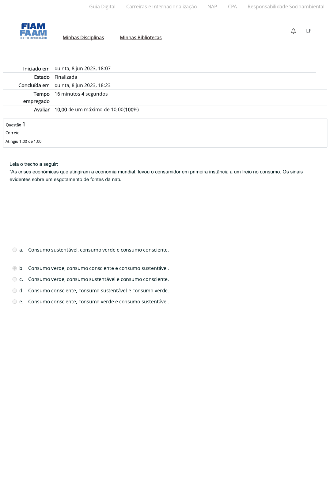 08/06/2023, 18:25 Atividade 4 (A4): Revisão da tentativa https://ambienteacademico.com.br/mod/quiz/review.php?attempt=2432622&cmid=780792 1/6 Iniciado em quinta, 8 jun 2023, 18:07 Estado Finalizada Concluída em quinta, 8 jun 2023, 18:23 Tempo empregado 16 minutos 4 segundos Avaliar 10,00 de um máximo de 10,00(100%) Questão 1 Correto Atingiu 1,00 de 1,00 Leia o trecho a seguir: “As crises econômicas que atingiram a economia mundial, levou o consumidor em primeira instância a um freio no consumo. Os sinais evidentes sobre um esgotamento de fontes da natureza somado aos impactos negativos no meio ambiente, trouxe outro movimento que vem num gráfico crescente: um consumidor consciente a respeito da responsabilidade coletiva e individual de cada um e que cada um faz parte ativa da busca por novos caminhos que mudem esse cenário.” Fonte: Disponível em: <https://sebraeinteligenciasetorial.com.br/produtos/noticias-de-impacto/sua-empresa-esta-preparada-para-o- consumidor-mais-consciente> Partindo da definição apresentada, assinale a alternativa que representa a sequência correta da hierarquia e amplitude do conceito de consumo consciente. a. Consumo sustentável, consumo verde e consumo consciente. b. Consumo verde, consumo consciente e consumo sustentável. c. Consumo verde, consumo sustentável e consumo consciente. d. Consumo consciente, consumo sustentável e consumo verde. e. Consumo consciente, consumo verde e consumo sustentável. Guia Digital Carreiras e Internacionalização NAP CPA Responsabilidade Socioambiental Minhas Disciplinas Minhas Bibliotecas LF https://codely-fmu-content.s3.amazonaws.com/Moodle/GuiaDigital/Guia+digital/index.html https://carreiras.fmu.br/ https://codely-fmu-content.s3.amazonaws.com/Moodle/NAP/inicial/nap/fmu/index.html https://codely-fmu-content.s3.amazonaws.com/Moodle/CPA/landing_CPA/index.html https://portal.fmu.br/sustentabilidade https://ambienteacademico.com.br/ https://ambienteacademico.com.br/ https://ambienteacademico.com.br/course/view.php?id=236 08/06/2023, 18:25 Atividade 4 (A4): Revisão da tentativa https://ambienteacademico.com.br/mod/quiz/review.php?attempt=2432622&cmid=780792 2/6 Questão 2 Correto Atingiu 1,00 de 1,00 Questão 3 Correto Atingiu 1,00 de 1,00 Leia o excerto a seguir: “O objetivo da mensuração dos segmentos de mercado é alocar os consumidores em categorias que minimizem a variância dentro do grupo e maximize-a entre os grupos. Para que possamos desenvolver produtos que “casem” com as preferências de cada grupo é necessário identificar os segmentos de acordo com o comportamento semelhante dos consumidores.” Fonte: BLACKWELL, R. D. [et al.]. Comportamento do consumidor. São Paulo: Pioneira Thomson Learning, 2005, p. 42. De acordo com os estudos é possível separar as etapas de segmentação de mercado, em: segmentação de mercado, segmentação do mercado-alvo e posicionamento do mercado. Dessas etapas, em particular a segmentação de mercado, analise as afirmativas a seguir: I. Determinar os perfis dos segmentos resultantes. II. Avaliar a atratividade e rentabilidade de cada segmento III. Identificar possíveis conceitos de posicionamento no segmento. IV. Identificar as variáveis de segmentação do mercado e classificá-las. É correto o que se afirma em: a. I e III, apenas. b. II e IV, apenas. c. II e III, apenas. d. I e IV, apenas. e. III e IV, apenas. Leia o trecho a seguir: “O indivíduo, nesse momento, assume o papel mais importante no processo de definição da nova prática de consumo sustentável, ao desempenhar papel de consciência no momento da compra, bem como um comportamento de consumidor preocupado com as questões pertinentes ao desenvolvimento sustentável.” Fonte: SILVA, Minelle. Consumo sustentável: a articulação de um constructo sob a perspectiva do desenvolvimento sustentável. RECADM, vol. 11, nº 2, jul. / dez. 2012. p. 227. A respeito da nova prática do consumo sustentável e suas relações, analise as afirmativas a seguir e assinale V para a(s) Verdadeira(s) e F para a(s) Falsa(s). I. O consumo sustentável da importância apenas às questões do meio ambiente, essa é sua principal relação. II. O consumo sustentável reside no foco dos atores sociais envolvidos no consumo, isso contribui com a sociedade. III. O consumo sustentável tem a relação dos atores sociais com as consciências individuais. IV. O consumo sustentável não pode ser estendido e nem ampliado, suas questões são limitadas. Assinale a alternativa que apresenta a sequência correta: a. F, V, V, F. b. F, V, V, V. c. F, V, F, V. d. V, V, F, F. e. V, V, V, F. Guia Digital Carreiras e Internacionalização NAP CPA Responsabilidade Socioambiental Minhas Disciplinas Minhas Bibliotecas LF https://codely-fmu-content.s3.amazonaws.com/Moodle/GuiaDigital/Guia+digital/index.html https://carreiras.fmu.br/ https://codely-fmu-content.s3.amazonaws.com/Moodle/NAP/inicial/nap/fmu/index.html https://codely-fmu-content.s3.amazonaws.com/Moodle/CPA/landing_CPA/index.html https://portal.fmu.br/sustentabilidade https://ambienteacademico.com.br/ https://ambienteacademico.com.br/ https://ambienteacademico.com.br/course/view.php?id=236 08/06/2023, 18:25 Atividade 4 (A4): Revisão da tentativa https://ambienteacademico.com.br/mod/quiz/review.php?attempt=2432622&cmid=780792 3/6 Questão 4 Correto Atingiu 1,00 de 1,00 Questão 5 Correto Atingiu 1,00 de 1,00 Leia o trecho a seguir: “Influência entre gerações (IEG) dos membros da família refere-se à transmissão de valores, atitudes e comportamentos de uma geração para outra. No contexto do comportamento do cliente, a IEG refere-se à transferência de valores de mercado que devem ser importantes, de percepções de marca e das próprias decisões sobre as marcas (ou seja, simplesmente adotando marca que os pais vêm usando).” Fonte: SHETH, Jagdish N; [et al.]. Comportamento do cliente: indo além do comportamento do consumidor. São Paulo: Atlas, 2008. p. 55