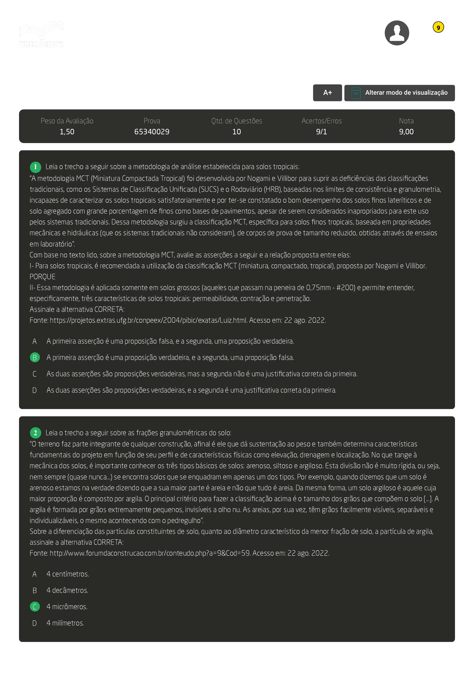Com base no texto lido, sobre a metodologia MCT, avalie as asserções a seguir e a relação proposta entre elas: I- Para solos tropicais, é recomendada a utilização da classificação MCT (miniatura, compactado, tropical), proposta por Nogami e Villibor. PORQUE II- Essa metodologia é aplicada somente em solos grossos (aqueles que passam na peneira de 0,75mm - #200) e permite entender, especificamente, três características de solos tropicais: permeabilidade, contração e penetração. Assinale a alternativa CORRETA:
