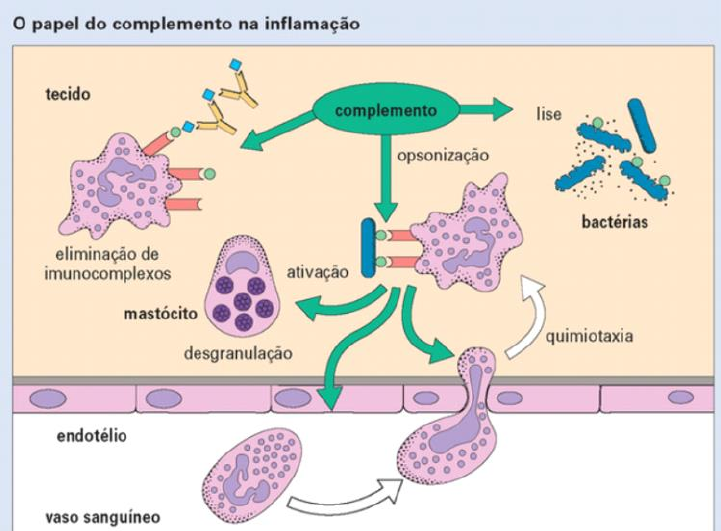 O sistema complemento é um conjunto de proteínas que podem fazer parte da resposta imunológica. Atualmente, são descritas 30 proteínas que fazem parte do sistema complemento. Essas proteínas encontram-se no plasma, em outros líquidos corpóreos, na superfície de células e em tecidos. São proteínas termolábeis (sujeitas à mudanças em resposta ao calor), por isso é necessário que suas dosagens sejam realizadas imediatamente após a coleta ou o soro seja armazenado a 4°C por curtos períodos de tempo ou a -70°C por ocasiões maiores. As funções do complemento incluem: Figura 1: O complemento apresenta um papel central na inflamação, causando quimiotaxia de fagócitos, ativação de mastócitos e fagócitos, opsonização e lise de patógenos e eliminação de imunocomplementos. Desencadeamento e aumento das reações inflamatórias• Migração de células fagocitárias através da quimiotaxia• Eliminação de imunocomplexos e células apoptóticas• Ativação celular para a destruição de patógenos• Destruição direta de patógenos e• Um papel importante no desenvolvimento das respostas de anticorpos• O complemento está envolvido na patologia de diversas doenças, provocando uma busca por tratamentos que controlem a sua ativação. VIAS DE ATIVAÇÃO DO COMPLEMENTO Existem três vias de ativação do sistema complemento: via clássica, via alternativa e via das lectinas. Sistema Complemento quarta-feira, 17 de maio de 2023 09:25 Página 1 de Imunologia Figura 2: Cada uma das vias de ativação gera uma C3 convertase (enzima), que converte C3 em C3b, o evento central da via do complemento. Por sua vez, C3b ativa a via lítica terminal de ataque à membrana. A ligação do antígeno com o anticorpo é a primeira etapa da via clássica. A via alternativa não requer anticorpos, sendo iniciada pela ligação covalente de C3b a grupos de hidroxila e amino na superfície de diversos microrganismos. A via da lectina também é iniciada pelos microrganismos, na ausência de anticorpos, com resíduos de açúcar na superfície dos patógenos fornecendo os sítios de ligação. As vias alternativa e lectina fornecem imunidade "natural" independente de anticorpos, enquanto a via clássica representa uma ligação desenvolvida mais recentemente com a resposta imune adquirida. A primeira via de ativação a ser descoberta, chamada de via clássica, é iniciada por anticorpos ligados à superfície do alvo. Apesar de ser uma eficiente via de ativação, ela requer uma resposta imune adquirida: ou seja, o hospedeiro deve ter encontrado o microrganismo anteriormente para que uma resposta de anticorpos seja gerada. A via alternativa, descrita nos anos 1950, fornece um mecanismo independente de anticorpos para a ativação do complemento na superfície do patógeno. A via da lectina, a via de ativação descrita mais recentemente, também não depende dos anticorpos, fornecendo uma ativação eficaz nos patógenos. Todas as três vias; Envolvem a ativação de C3, que é a proteína do complemento mais abundante e importante• Compreendem uma cascata proteolítica na qual complexos de proteínas do complemento criam enzimas que clivam outras proteínas do complemento, de uma maneira ordenada, para gerar novas enzimas , amplificando e perpetuando a cascata de ativação. • Página 2 de Imunologia Figura 3: Resumo dos ativadores das vias de ativação clássica, da lectina e alternativa do complemento. A VIA CLASSICA É DEPENDENTE DA RESPOSTA IMUNE ADQUIRIDA A via clássica é ativada por anticorpos ligados ao antígenos e necessita de Ca2+. Apenas anticorpos IgG e IgM ligados à membrana podem ativar, fazendo-o pela via clássica. A ligação à superfície é fundamental: A IgM é o ativador mais eficiente, mas a IgM não ligada à superfície, no plasma, não ativa o complemento • Tem início mais tardio, por necessitar da resposta adaptativa para formação de anticorpos.• A imunoglobulina une-se, por meio de sua região variável Fab, ao antígeno responsável por sua formação. • O que ocorre quando a IgM se liga à superfície de uma bactéria que permite que ela ative o complemento? P. Ocorre uma transição de uma molécula plana para uma forma semelhante a um grampo, que expõe seus sítios de ligação ao primeiro componente do sistema complemento R. O primeiro componente da via C1, é uma molécula complexa que inclui uma unidade de reconhecimento grande, com seis cabeças, chamada de C1q, e duas moléculas de C1r e duas moléculas de C1s, as unidades enzimáticas do complexo. A reação de C1 só ocorre quando várias cabeças de C1q estão ligadas aos anticorpo. Página 3 de Imunologia O componente C1q do complexo C1 se liga às regiões Fc do anticorpo imobilizado através de seus grupos de cabeças globulares, sofrendo alterações em seu formato que desencadeiam a ativação autocatalítica da unidade enzimática C1r. Já que a ativação de C1 só ocorre quando várias das seis cabeças de C1q estão ligadas ao anticorpo, apenas superfícies que estão densamente cobertas de anticorpos desencadearão o processo. Essa limitação reduz o risco de ativação inapropriada nos tecidos do hospedeiro. A enzima C1s cliva C4 e C2 Via clássica: Quando um microrganismo invade o nosso corpo, o nosso organismo dispara uma resposta que pode levar a produção de anticorpos contra aquele microrganismo. Esses anticorpos podem opsonizar o microrganismo podendo ativar ações imunológicas, como ativar a via clássica do complemento: os isótopos IgG e IgM. A IgM faz melhor essa função. O IgG ou IgM vai opsonizar o microrganismo, uma proteína do complemento chamada de C1, consegue interagir com a porção Fc do anticorpo que está revestindo o microrganismo. São 6 proteínas C1q (cabeças globulares) associadas à duas enzimas inativadas: C1s e C1r. Essas enzimas (C1s e C1r) só serão ativadas quando, pelo menos, 2 cabeças conseguirem se ligar com os anti