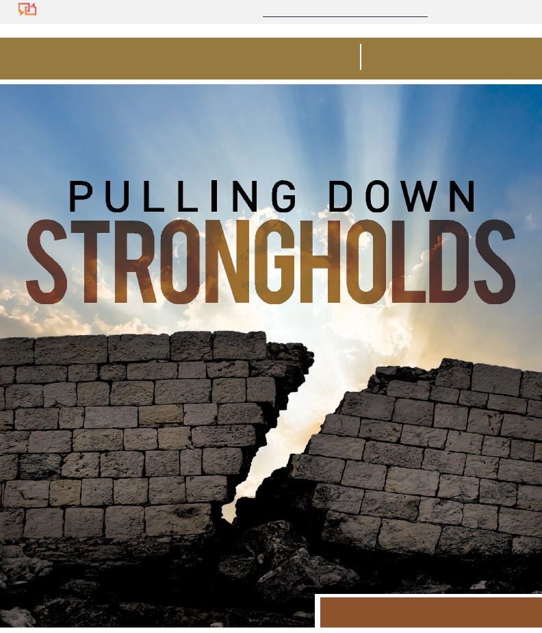Guia de estudo do companheiro 5 LIÇÕES R ICK RENNER Éexiste um certo tipo de pensamento errado que você não consegue se livrar? Está ligado a um mau hábito ou a um problema que você subconscientemente parece gravitar? Pode ser que você esteja lidando com uma fortaleza mental. Nesta série dinâmica de cinco partes, Rick Renner disseca meticulosamente o que é uma fortaleza e expõe em sete armas espirituais que você recebeu para demolir fortalezas mentais. Você também descobrirá a diferença entre fortalezas lógicas e ilógicas; o que significa derrubar imaginações e trazer todo pensamento cativo; e como ajudar Traduzido do Inglês para o Português - www.onlinedoctranslator.com https://www.onlinedoctranslator.com/pt/?utm_source=onlinedoctranslator&utm_medium=docx&utm_campaign=attribution https://www.onlinedoctranslator.com/pt/?utm_source=onlinedoctranslator&utm_medium=docx&utm_campaign=attribution os outros a se libertarem das fortalezas que os mantêm reféns. 2|GUIA DE ESTUDO A menos que de outra formaindicado, todas as citações das escrituras são tiradas da versão King James da Bíblia. Derrubar Fortalezas Copyright © 2020 por Rick Renner 8316 E. 73rd St. Tulsa, Oklahoma 74133 Publicado pelo Ministério Rick Rennerwww.renner.org Impresso nos Estados Unidos da América. Todos os direitos reservados. Nenhuma parte deste livro pode ser reproduzida ou transmitida de qualquer forma ou por qualquer meio - eletrônico, mecânico, fotocópia, gravação, digitalização ou outro - exceto para breves citações em resenhas críticas ou artigos, sem a permissão prévia por escrito da Editora. http://www.renner.org/ Derrubar Fortalezas|3 Uma nota de Rick Renner Estou em uma busca pessoal para ver um “avivamento da Bíblia” para que as pessoas possam estabelecer suas vidas em uma base firme que permanecerá forte e suportar o teste quando os ventos da tempestade do fim dos tempos começarem a se intensificar. Para experimentar um reavivamento da Bíblia em sua vida pessoal, é importante reservar um tempo cada dia para ler, receber e aplicar suas verdades em sua vida. Tiago nos dizque se continuarmos na lei perfeita da liberdade - recusando ser ouvintes esquecidos, mas determinados a ser praticantes - seremos abençoados em nossos caminhos. À medida que você assiste ou ouve os programas desta série e trabalha com este guia de estudo correspondente, confio que você examinará as Escrituras e permitirá que o Espírito Santo o ajude a ouvir algo novo da Palavra de Deus que se aplica especificamente à sua vida. Eu encorajo você aseja um praticante da Palavra que Ele lhe revela. Seja qual for o custo, garanto a você – valerá a pena. Acharam-se as tuas palavras, e eu as comi; e a tua palavra foi para mim o gozo e alegria do meu coração; porque pelo teu nome me chamo, ó Senhor Deus dos Exércitos. — Jeremias 15:16 Seu irmão e amigo em Jesus Cristo, Rick Renner 4 |GUIA DE ESTUDO Como usar este guia de estudo Este guia de estudo de cinco lições corresponde a “Pulling Down Strongholds” com Rick Renner (Renner TV). Cada lição neste guia de estudo abrangeum tema que é abordado durante a série do programa, com perguntas e referências fornecidas para aprofundá-lo em seu próprio estudo particular das Escrituras sobre este assunto. Paratirar o máximo proveito deste guia de estudo, considere o seguinte: Primeiro, assista ou ouça o programa antes de trabalhar na lição correspondente deste guia. (Os programas também podem ser vistos em renner.org clicando nos links Mídia/Arquivos.) Segundo, reserve um tempo para pesquisar as escrituras incluídas em cada lição. Em espírito de oração, considere a aplicação deles em sua própria vida. Terceiro, use um diário ou caderno para anotar suas respostas para cadaquestões de estudo da lição e desafios de aplicação prática. Quarto, investir específicotempo em oração e na Palavra de Deus para consultar o Espírito Santo. Anote as escrituras ou ideias que Ele revela a você sobre ser cheio do Espírito e capacitado por Ele em sua vida diária. Finalmente, tome uma atitude! Tudo o que o Senhor lhe disser para fazer de acordo com a Sua Palavra, faça-o. Para informações adicionais sobre este assunto, é recomendado que você obtenha o livro de Rick Renner Dressed To Kill: A Biblical Approach to Spiritual Warfare and Armor. Você também pode selecionar outros recursos disponíveis de Rick fazendo seu pedido em renner.org ou ligando para 1-800-742-5593. Derrubar Fortalezas|5 LIÇÃO1 TEMA O que é uma fortaleza? ESCRITURAS 1. 2 Coríntios 10:4- Poras armas de nossa milícia não são carnais, mas poderosas em Deus para destruir fortalezas. PALAVRAS GREGAS 1. “puxar para baixo” — καθαιρέω (kathaireo): derrubar; para desmontar,se necessário, pouco a pouco; demolir; destruir; desmontar; derrubar; derrubar, quebrar, desmembrar e despedaçar até que nada fique de pé; costumava imaginar derrubando as paredes de uma fortaleza bem defendida 2. “fortalezas” — ὀχύρωμα (ochuroma): fortaleza; castelo; cidadela; As fotosuma fortaleza com muros fortificados para manter forasteiros do lado de fora; uma terrível prisão construída nas profundezas de uma fortaleza destinada a impedir a fuga de um refém ou prisioneiro; um local de prisão, cativeiro, confinamento, detenção, prisão ou encarceramento SINOPSE As cinco lições deste estudo sobre Derrubar Fortalezas se concentrarão emos seguintes tópicos: • O que é uma fortaleza? • Armas para demolir uma fortaleza mental • Fortalezas Lógicas e Ilógicas • Trazendo cada pensamento em cativeiro • Como ajudar os outros a se libertarem das fortalezas mentais A ênfase desta lição: Uma fortaleza é uma fortaleza de mentiras que o inimigo constrói em sua mente eemoções. Isso éum local de prisão, cativeiro, confinamento, detenção, 6 |GUIA DE ESTUDO prisão, ou encarceramento em seu pensamento que o impede deexperimentar 