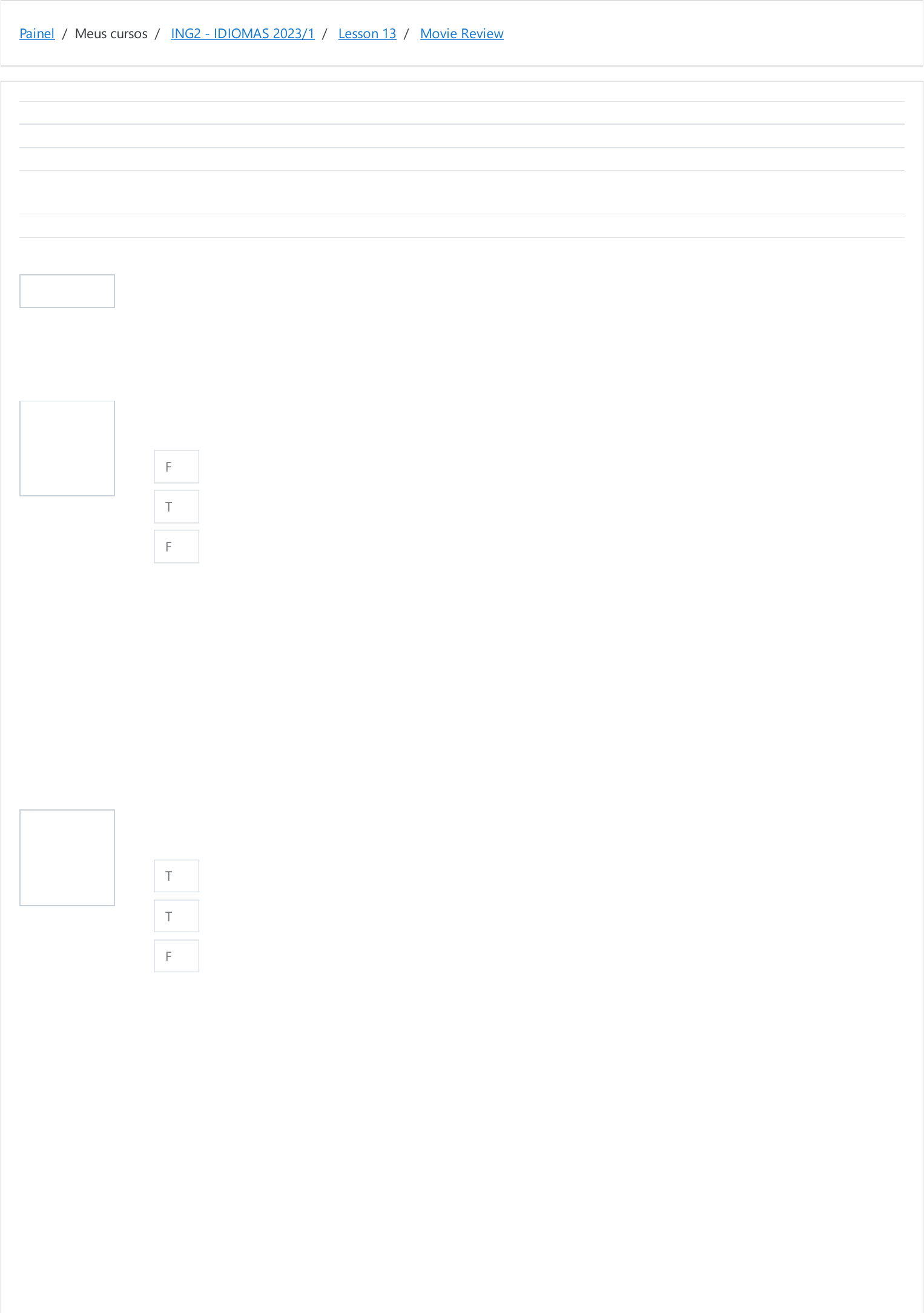 Painel / Meus cursos / ING2 - IDIOMAS 2023/1 / Lesson 13 / Movie Review Informação Questão 1 Correto Atingiu 1,00 de 1,00 Questão 2 Correto Atingiu 1,00 de 1,00 Iniciado em quinta, 8 jun 2023, 13:41 Estado Finalizada Concluída em quinta, 8 jun 2023, 13:42 Tempo empregado 43 segundos Notas 3,00/3,00 Avaliar 10,00 de um máximo de 10,00(100%) Listen to a movie review and check the sentences True (T) or False (F). Percy Jones is the director of Moving Mountains. The movie was released in Canada. People believe the movie is good but won't get any Oscar Statue. F T F Sua resposta está correta. A resposta correta é: [F] Percy Jones is the director of Moving Mountains. [T] The movie was released in Canada. [F] People believe the movie is good but won't get any Oscar Statue. It is a thriller and people are really connected to the movie while watching it. It can be considered a Canadian-American movie. Shelton is considered a good director, but not a perfectionist. T T F Sua resposta está correta. A resposta correta é: [T] It is a thriller and people are really connected to the movie while watching it. [T] It can be considered a Canadian-American movie. [F] Shelton is considered a good director, but not a perfectionist. https://moodle.ifsul.edu.br/novohamburgo/my/ https://moodle.ifsul.edu.br/novohamburgo/course/view.php?id=337 https://moodle.ifsul.edu.br/novohamburgo/course/view.php?id=337#section-22 https://moodle.ifsul.edu.br/novohamburgo/mod/quiz/view.php?id=53751 Questão 3 Correto Atingiu 1,00 de 1,00 The movie soundtrack is very good, with hit songs. As well as the soundtrack, the costumes are amazing. Despite some huge problems, the movie is good. T F F Sua resposta está correta. A resposta correta é: [T] The movie soundtrack is very good, with hit songs. [F] As well as the soundtrack, the costumes are amazing. [F] Despite some huge problems, the movie is good. ◄ Movie Crew - Who Is Who? Seguir para... Strong Or Weak Sound? ► https://moodle.ifsul.edu.br/novohamburgo/mod/quiz/view.php?id=53750&forceview=1 https://moodle.ifsul.edu.br/novohamburgo/mod/quiz/view.php?id=53752&forceview=1