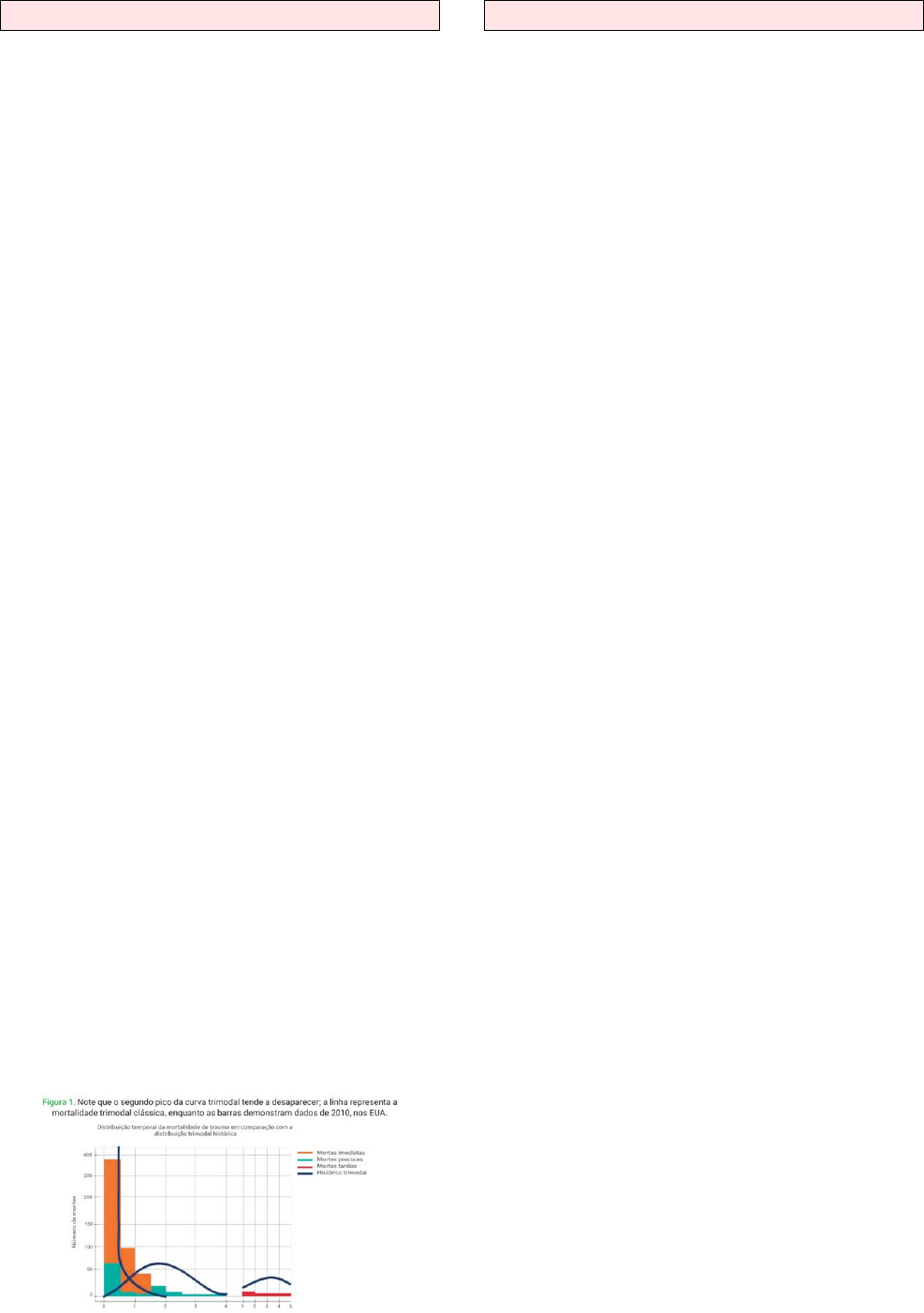ATLS 1. INTRODUÇÃO Objetivo: reduzir as mortes no contexto de trauma. Antes do ATLS o gráfico era trimodal, que passou a ser bimodal. A curva trimodal tem 3 picos: mortes imediatas (causadas por lesões incompatíveis com a vida), mortes precoces (lesões como pneumotórax hipertensivo, choque hemorrágico – de 30min a 2h do trauma) e mortes tardias, que ocorrem dias a semanas depois, no paciente que foi pra UTI, pegou pneumonia e faleceu 1 mês depois. Como tratar cada um desses pacientes? • 1º pico – não é possível reverter a lesão. São necessárias medidas de saúde publica para a prevenção do trauma. • 2º pico – prevenção + ATLS – drenar o tórax, resolver hipovolemia, atuar no paciente que está na via pública. • 3º pico – prevenção + ATLS + serviços médicos. Esse terceiro pico está caindo, pois cada vez mais os hospitais estão melhores. A curva do meio foi modificada porque os pacientes começaram a receber o tratamento adequado, tanto no pré (treinamento com ATLS) quanto no pós-hospitalar (melhora na UTI) e o gráfico passou a ser bimodal. • A primeira hora do trauma é chamada de Golden hour, que é o tempo para atender esse paciente e fazer ATLS. • Os exames primários são realizados no paciente ainda instável: FAST (pesquisa de sangramento intra-abdominal), lavado peritoneal eletrocardiograma, sondagem, raio X do trauma (tórax AP, pelve ap e NÃO fazer cervical de acordo com o ATLS). • Exames secundários: TC de abdome, tórax, ressonância, cintilografia. Só faz com o paciente estável, sem risco nenhum. 2. ABCDE DO TRAUMA ATLS é uma escada, não posso pular nenhuma etapa. Posso voltar para checar, mas nunca pular. • ATLS: ABCDE • PHTLS: X-ABCDE X – exsanguinação • É necessário tamponar o sangramento, senão o paciente vai morrer. Realizar compressão direta para parar o sangramento. Se for em extremidade, utilizar torniquete, que é exceção. • Deve ser o torniquete especifico, pois pode gerar complicações como rabdomiólise, compressão nervosa, síndrome compartimental por 60min, mas não tem tempo limite. Pode abrir o torniquete se paciente estável com muita dor local. A – airway • Vias aéreas e controle da coluna cervical. • A primeira coisa a se fazer é o colar cervical. • A queda da base da língua é a principal causa de obstrução das vias aéreas, podendo realizar o chin-lift (elevação do mento) e jaw thrust (tracionar a mandíbula para frente), sendo a segunda manobra mais utilizada, pois o chin-lift pode lesar a coluna cervical. • Isso vai definir se vai ser necessária via aérea definitiva (IOT), sendo que devemos ter via aérea definitiva se Glasgow <=8, comprometimento das vias aéreas (sangramento na boca, lesão de face) e saturação <90%. • A intubação nasotraqueal é contraindicada em suspeita de fratura de base de crânio (sinal do guaxinim, sinal de Battle (equimose retroauricular) e sinal do duplo halo (saída de liquor pelo nariz e ouvidos, sendo necessário pingar num papelzinho. O liquor vai expandir e o sangue fica no meio, gerando o sinal do duplo halo. • Traqueo não é mais tão recomendada, é possível fazer a crico, sendo preferivel fazer crico por punção em crianças (<12 anos). Em criança pode ficar com crico por punção por até 2h, já em adultos pode ficar por até 40min. B – breathing • Pneumotórax simples – no pequeno o paciente chega, sem muita clinica de pneumotórax, as vezes só tem diminuição do MV. No raio x tem um pneumotórax de até 2 dedos. Nesses casos não precisa drenar, apenas se tiver muita dúvida, se o paciente for transportado de avião para outro lugar (devido a variação de pressão) ou se precisar entubar a pessoa (pois a pressão positiva do ventilador pode causar um pneumotórax hipertensivo). O pneumotórax grande será drenado imediatamente no 5º EI na parte superior da costela na linha axilar média (primeiro coloca o dedo para saber se está no tórax ou no abdome do paciente). • Pneumotórax hipertensivo – há um furo no pulmão que leva ao extravasamento do ar, que leva a compressão do pulmão, traqueia e pulmão contralateral. Se não resolver a pessoa vai acabar morrendo. Não pode deixar pra descobrir no RX muito menos na tomo. A pessoa se apresenta com choque (hipotensão), som hipertimpânico no local, turgência jugular (porque tá comprimindo os vasos e leva a isso), pode ter desvio de traqueia também, assim como a ausculta abolida. Faz uma punção no 5º EI na linha axilar anterior e depois drena. • Pneumotórax aberto – corresponde a um furo no tórax. Se for >= 2/3 do tamanho da traqueia a tendencia do ar é de entrar pelo buraco, então o ar entra pelo buraco e gera um pneumotórax importante. Faz um curativo de 3 pontos, que deixa um buraco aberto para que o curativo se feche na inspiração e se abra na expiração. No hospital é necessário drenar o paciente. • Hemotórax – sangue na cavidade torácica. É SEMPRE drenado. O hemotórax é visto como uma linha esbranquiçada no RX O hemotórax maciço é quando tem > 1500mL ou 250 a 300mL em 2-3h, sendo que nesse caso há indicação de toracotomia de urgência. MV será abolido na ausculta. Nesse caso não tem turgência jugular porque perdeu sangue pra cavidade, mas tem hipotensão e hipertimpanismo. • Tórax instável – lesão de dois ou mais arcos costais em 2 ou mais lugares diferentes. Quando a pessoa inspira o pulmão colaba, a pessoa não consegue ventilar. O que resolve é a ventilação mecânica. Muitas vezes o paciente tem contusão pulmonar, na hora não vai complicar, só vai gerar uma pneumonite depois de dias e vai ter uma evolução desfavorável. • Tamponamento cardíaco – no FAST é possível saber se tem sangramento pericárdico. Pensar quando há hipotensão, turgência jugular, ausculta pulmonar normal, abafamento de bulha (tríade de Beck). É necessário realizar a punção de Marfan, aspirando o