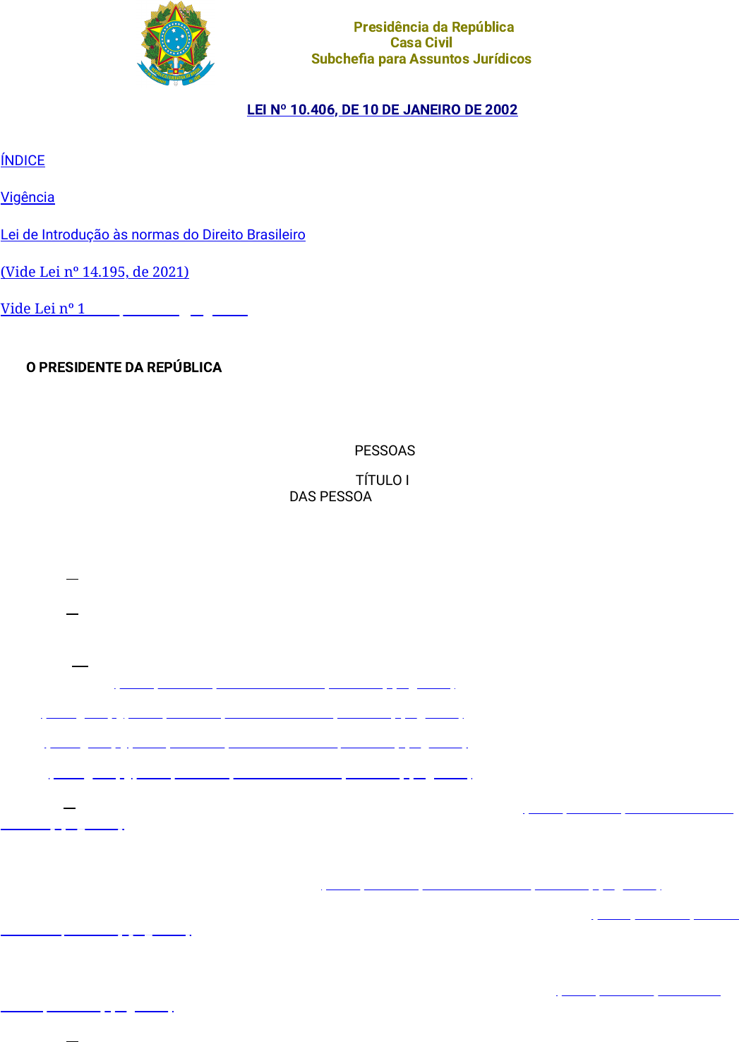 Presidência da República Casa Civil Subchefia para Assuntos Jurídicos LEI Nº 10.406, DE 10 DE JANEIRO DE 2002 ÍNDICE Vigência Lei de Introdução às normas do Direito Brasileiro (Vide Lei nº 14.195, de 2021) Vide Lei nº 14.451, de 2022 Vigência Institui o Código Civil. O PRESIDENTE DA REPÚBLICA Faço saber que o Congresso Nacional decreta e eu sanciono a seguinte Lei: P A R T E G E R A L LIVRO I DAS PESSOAS TÍTULO I DAS PESSOAS NATURAIS CAPÍTULO I Da Personalidade e da Capacidade Art. 1 o Toda pessoa é capaz de direitos e deveres na ordem civil. Art. 2 o A personalidade civil da pessoa começa do nascimento com vida; mas a lei põe a salvo, desde a concepção, os direitos do nascituro. Art. 3 o São absolutamente incapazes de exercer pessoalmente os atos da vida civil os menores de 16 (dezesseis) anos. (Redação dada pela Lei nº 13.146, de 2015) (Vigência) I - (Revogado) ; (Redação dada pela Lei nº 13.146, de 2015) (Vigência) II - (Revogado) ; (Redação dada pela Lei nº 13.146, de 2015) (Vigência) III - (Revogado) . (Redação dada pela Lei nº 13.146, de 2015) (Vigência) Art. 4 o São incapazes, relativamente a certos atos ou à maneira de os exercer: (Redação dada pela Lei nº 13.146, de 2015) (Vigência) I - os maiores de dezesseis e menores de dezoito anos; II - os ébrios habituais e os viciados em tóxico; (Redação dada pela Lei nº 13.146, de 2015) (Vigência) III - aqueles que, por causa transitória ou permanente, não puderem exprimir sua vontade; (Redação dada pela Lei nº 13.146, de 2015) (Vigência) IV - os pródigos. Parágrafo único. A capacidade dos indígenas será regulada por legislação especial. (Redação dada pela Lei nº 13.146, de 2015) (Vigência) Art. 5 o A menoridade cessa aos dezoito anos completos, quando a pessoa fica habilitada à prática de todos os atos da vida civil. http://legislacao.planalto.gov.br/legisla/legislacao.nsf/Viw_Identificacao/lei%2010.406-2002?OpenDocument https://www.planalto.gov.br/ccivil_03/Decreto-Lei/Del4657.htm https://www.planalto.gov.br/ccivil_03/_Ato2019-2022/2021/Lei/L14195.htm#art43 https://www.planalto.gov.br/ccivil_03/_Ato2019-2022/2022/Lei/L14451.htm https://www.planalto.gov.br/ccivil_03/_Ato2019-2022/2022/Lei/L14451.htm#art4 https://www.planalto.gov.br/ccivil_03/_Ato2015-2018/2015/Lei/L13146.htm#art114 https://www.planalto.gov.br/ccivil_03/_Ato2015-2018/2015/Lei/L13146.htm#art127 https://www.planalto.gov.br/ccivil_03/_Ato2015-2018/2015/Lei/L13146.htm#art123 https://www.planalto.gov.br/ccivil_03/_Ato2015-2018/2015/Lei/L13146.htm#art114 https://www.planalto.gov.br/ccivil_03/_Ato2015-2018/2015/Lei/L13146.htm#art127 https://www.planalto.gov.br/ccivil_03/_Ato2015-2018/2015/Lei/L13146.htm#art123 https://www.planalto.gov.br/ccivil_03/_Ato2015-2018/2015/Lei/L13146.htm#art114 https://www.planalto.gov.br/ccivil_03/_Ato2015-2018/2015/Lei/L13146.htm#art127 https://www.planalto.gov.br/ccivil_03/_Ato2015-2018/2015/Lei/L13146.htm#art123 https://www.planalto.gov.br/ccivil_03/_Ato2015-2018/2015/Lei/L13146.htm#art114 https://www.planalto.gov.br/ccivil_03/_Ato2015-2018/2015/Lei/L13146.htm#art127 https://www.planalto.gov.br/ccivil_03/_Ato2015-2018/2015/Lei/L13146.htm#art114 https://www.planalto.gov.br/ccivil_03/_Ato2015-2018/2015/Lei/L13146.htm#art127 https://www.planalto.gov.br/ccivil_03/_Ato2015-2018/2015/Lei/L13146.htm#art114 https://www.planalto.gov.br/ccivil_03/_Ato2015-2018/2015/Lei/L13146.htm#art127 https://www.planalto.gov.br/ccivil_03/_Ato2015-2018/2015/Lei/L13146.htm#art114 https://www.planalto.gov.br/ccivil_03/_Ato2015-2018/2015/Lei/L13146.htm#art127 https://www.planalto.gov.br/ccivil_03/_Ato2015-2018/2015/Lei/L13146.htm#art114 https://www.planalto.gov.br/ccivil_03/_Ato2015-2018/2015/Lei/L13146.htm#art127 Parágrafo único. Cessará, para os menores, a incapacidade: I - pela concessão dos pais, ou de um deles na falta do outro, mediante instrumento público, independentemente de homologação judicial, ou por sentença do juiz, ouvido o tutor, se o menor tiver dezesseis anos completos; II - pelo casamento; III - pelo exercício de emprego público efetivo; IV - pela colação de grau em curso de ensino superior; V - pelo estabelecimento civil ou comercial, ou pela existência de relação de emprego, desde que, em função deles, o menor com dezesseis anos completos tenha economia própria. Art. 6 o A existência da pessoa natural termina com a morte; presume-se esta, quanto aos ausentes, nos casos em que a lei autoriza a abertura de sucessão definitiva. Art. 7 o Pode ser declarada a morte presumida, sem decretação de ausência: I - se for extremamente provável a morte de quem estava em perigo de vida; II - se alguém, desaparecido em campanha ou feito prisioneiro, não for encontrado até dois anos após o término da guerra. Parágrafo único. A declaração da morte presumida, nesses casos, somente poderá ser requerida depois de esgotadas as buscas e averiguações, devendo a sentença fixar a data provável do falecimento. Art. 8 o Se dois ou mais indivíduos falecerem na mesma ocasião, não se podendo averiguar se algum dos comorientes precedeu aos outros, presumir-se-ão simultaneamente mortos. Art. 9 o Serão registrados em registro público: I - os nascimentos, casamentos e óbitos; II - a emancipação por outorga dos pais ou por sentença do juiz; III - a interdição por incapacidade absoluta ou relativa; IV - a sentença declaratória de ausência e de morte presumida. Art. 10. Far-se-á averbação em registro público: I - das sentenças que decretarem a nulidade ou anulação do casamento, o divórcio, a separação judicial e o restabelecimento da sociedade conjugal; II - dos atos judiciais ou extrajudiciais que declararem ou reconhecerem a filiação; III - (Revogado pela Lei nº 12.010, de 2009) CAPÍTULO II Dos Direitos da Personalidade Art. 11. Com exceção dos casos previstos em lei, os direitos da personalidade são intransmissíveis e irrenunciáveis, não podendo o 