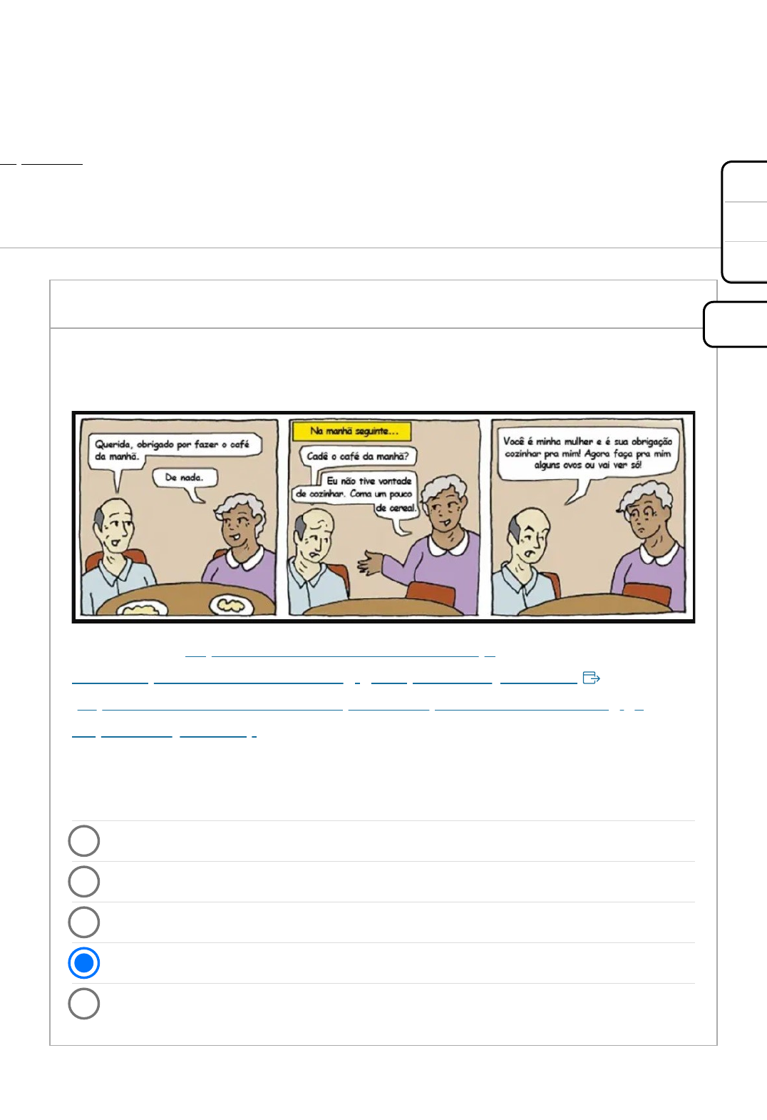 Atividade Objetiva 3 Iniciado: 24 mai em 19:31 Instruções do teste Importante: Caso você esteja realizando a atividade através do aplicativo "Canvas Student", é necessário que você clique em "FAZER O QUESTIONÁRIO", no final da página. 0,2 ptsPergunta 1 Na tirinha observamos a importância de seguir os papéis de gênero. Observamos, na tirinha, um exemplo de negligência. A tirinha demonstra uma situação comum do cotidiano de um casal. Na tirinha podemos observar um exemplo de violência psicológica. Na tirinha observamos uma relação baseada na tolerância. Leia a tirinha a seguir: Disponível em: https://ea9vhhuzko5.exactdn.com/wp- content/uploads/2015/09/tirinha-2.jpg?strip=all&lossy=1&ssl=1 (https://ea9vhhuzko5.exactdn.com/wp-content/uploads/2015/09/tirinha-2.jpg? strip=all&lossy=1&ssl=1) . Acesso em: 05 mai. 2022. Considerando a situação apresentada, assinale a opção correta: A+ A A- https://ea9vhhuzko5.exactdn.com/wp-content/uploads/2015/09/tirinha-2.jpg?strip=all&lossy=1&ssl=1 0,2 ptsPergunta 2 Observe a imagem e leia o texto a seguir: “Quando dizem que o brasileiro é cordial, cordial não significa que é gentil, que é sentimental. Porque do coração vem a bondade, a gentileza, mas vem também o ódio e a vingança — e o brasileiro é as duas coisas’, disse. ‘Isso está escondido dentro de nossa cultura: temos sombras terríveis, a sombra do colonialismo, do etnocídio indígena, da escravidão...’” Fonte: VEIGA, E. Como o mito do “homem cordial” embaça a percepção sobre o brasileiro. Tá Explicado, Uol, 16 mai. 2020. Disponível em: https://tab.uol.com.br/noticias/redacao/2020/05/16/como-o-mito-do-homem- cordial-embaca-a-percepcao-sobre-o-brasileiro.htm?cmpid=copiaecola (https://tab.uol.com.br/noticias/redacao/2020/05/16/como-o-mito-do-homem-cordial- embaca-a-percepcao-sobre-o-brasileiro.htm?cmpid=copiaecola) . Acesso em: 05 mai Considerando a imagem e o texto apresentados, e retomando a discussão sobre o estereótipo do povo brasileiro, avalie as afirmativas abaixo: I- Existe uma contradição entre a realidade cotidiana dos grupos marginalizados e o discurso constituído historicamente sobre o povo brasileiro. A+ A A- https://tab.uol.com.br/noticias/redacao/2020/05/16/como-o-mito-do-homem-cordial-embaca-a-percepcao-sobre-o-brasileiro.htm?cmpid=copiaecola II, apenas. I e II, apenas. III, apenas. I, apenas. I e III, apenas. II- A formação do discurso sobre o povo brasileiro foi forjada pela elite brasileira, que sempre conviveu pacificamente com a diversidade cultural. III-A formação colonial do Brasil erigiu diferentes tradições culturais e o perfil violento do brasileiro é realidade apenas na camada social mais baixa. É correto o que se afirma em: 0,2 ptsPergunta 3 Leia a tirinha a seguir: A partir da leitura da tirinha de Laerte, avalie as afirmativas a seguir: I-A tirinha apresenta possíveis consequências de uma educação sexual normatizadora, como as agressões física e verbal contra a personagem Muriel exemplificado pela cartunista Laerte. A+ A A- I, apenas. I e III, apenas. III, apenas. I e II, apenas. I, II e III, apenas. II-A existência de um padrão de comportamento de sexualidade e de gênero marginaliza as diferentes experiências, vulnerabilizando as pessoas que não são consideradas dentro desse padrão. III-A educação sexual é fundamental para inclusão das pessoas que tem diferentes experiências de sexualidade e de identidades de gênero, pois apontando o que é diferente do padrão diminui-se a chance de preconceitos e discriminações. É correto o que se afirma em: 0,2 ptsPergunta 4 Leia a tinha a seguir: Fonte: Um Sábado Qualquer [s.d.]. Disponível em: https://www.umsabadoqualquer.com/135-gravida-5/tirinhas147/ A+ A A- https://www.umsabadoqualquer.com/135-gravida-5/tirinhas147/ A asserção I é uma proposição verdadeira, e a II é uma proposição falsa. As asserções I e II são proposições verdadeiras, mas a II não é uma justificativa da I. As asserções I e II são ambas proposições falsas As asserções I e II são proposições verdadeiras, e a II é uma justificativa da I. A asserção I é uma proposição falsa, e a II é uma proposição verdadeira. (https://www.umsabadoqualquer.com/135-gravida-5/tirinhas147/) . Acesso em: 05 mai. 2022. Refletindo sobre a educação sexual e o diálogo retratado na tirinha, avalie as seguintes asserções e a relação proposta entre elas: 1. A sexualidade é uma dimensão importante da vida humana, por isso é muito estudada, sendo necessário uma educação sexual na escola não sistematizada e não normativa. PORQUE 1. A educação sexual acontece a todo momento e está relacionada com o estabelecimento de relações sociais, com as crenças sociais e religiosas, com a mídia, entre outros. A respeito dessas asserções, assinale a opção correta: 0,2 ptsPergunta 5 Leia o texto a seguir: A indiada não conhecia doenças, além de coceiras e desvanecimentos por perda momentânea da alma. A branquitude trazia da cárie dental à bexiga, à coqueluche, à tuberculose e o sarampo. Desencadeia‐se, ali, desde a primeira hora, uma guerra biológica implacável. De um lado, povos peneirados, nos séculos e milênios, por pestes a que sobreviveram e para as quais desenvolveram resistência. Do outro lado, povos indenes, indefesos, que começavam a morrer aos magotes. Assim é que a civilização se impõe, primeiro, como uma epidemia de pestes mortais. Depois, pela dizimação através de guerras de extermínio e da A+ A A- https://www.umsabadoqualquer.com/135-gravida-5/tirinhas147/ Salvo em 19:33 Os indígenas, no período da colonização, dizimaram os povos europeus que descobriram o Brasil, abusando e violentando as pessoas que desembarcavam no país, assim como escravizando-os. A diversidade brasileira é resultado da constituição pacífica entre os diferentes povos que colonizaram o Brasil, expandindo as suas sociedades e assimilando a cultur