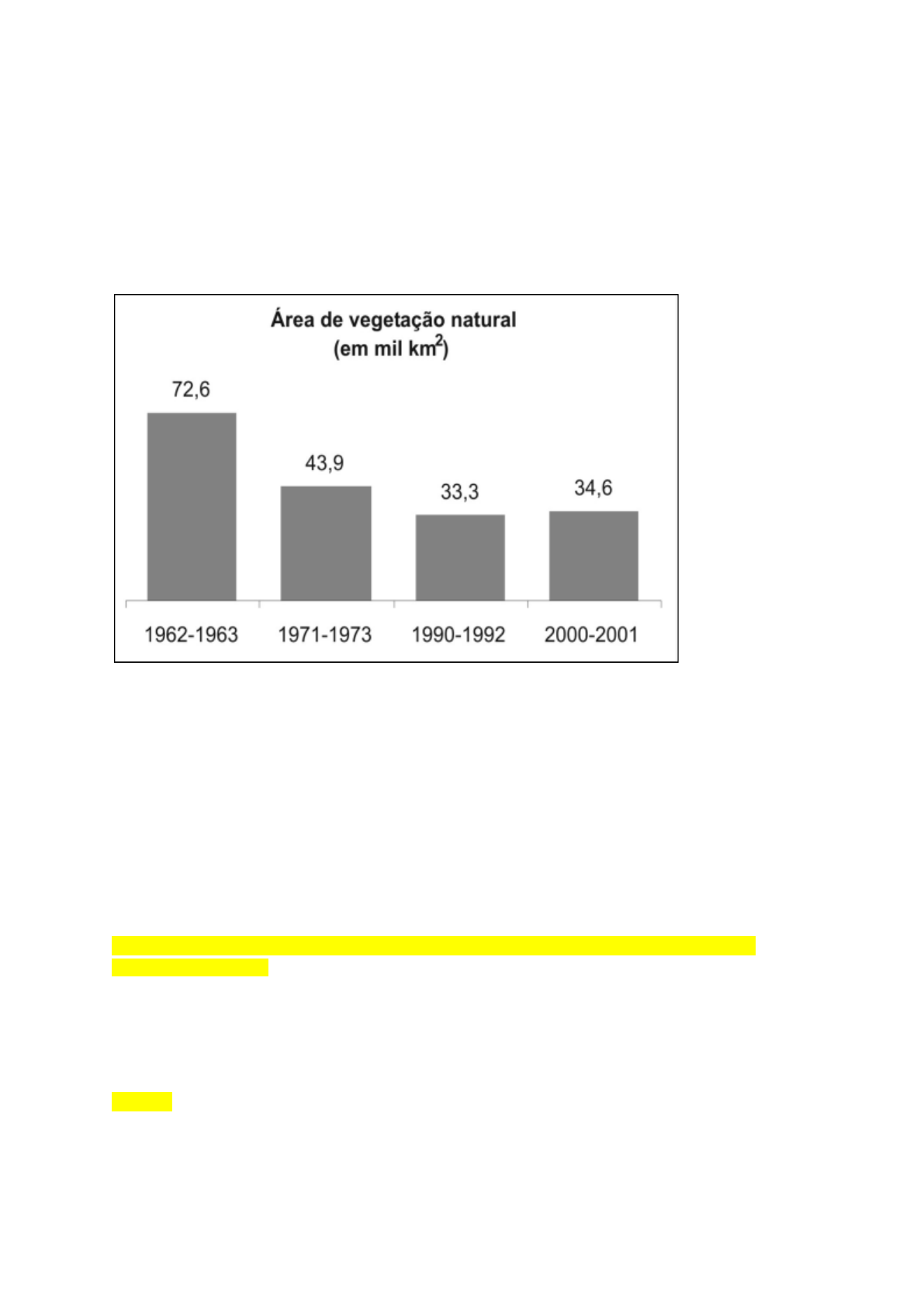 PERGUNTA 1 (Enem 2005) Em um estudo feito pelo Instituto Florestal, foi possível acompanhar a evolução de ecossistemas paulistas desde 1962. Desse estudo publicou-se o Inventário Florestal de São Paulo, que mostrou resultados de décadas de transformações da Mata Atlântica. Examinando o gráfico da área de vegetação natural remanescente (em mil km2), pode-se inferir que: Fonte: Pesquisa. 91, São Paulo: FAPESP, set/2003, p. 48. a. A Mata Atlântica teve sua área devastada em 50% entre 1963 e 1973. b. A vegetação natural da Mata Atlântica aumentou antes da década de 1960, mas reduziu nas décadas posteriores. c. A devastação da Mata Atlântica remanescente vem sendo contida desde a década de 1960. d. Em 2000-2001, a área de Mata Atlântica preservada em relação ao período de 1990-1992 foi de 34,6%. e. A área preservada da Mata Atlântica nos anos 2000 e 2001 é maior do que a registrada no período de 1990-1992. Pergunta 2 1 em 1 pontos Correta O conceito de produção limpa questiona e propõe a eliminação ou a substituição da equação industrial linear clássica, ou seja, a indústria é responsável pela prática de contenção dos resíduos (poluição) na fábrica para posterior tratamento e descarte. A produção limpa propõe a equação circular de maior ecoeficiência e eficácia ao defender a prevenção da geração de resíduos e promover maior economia de água e energia. Dessa forma, podemos dizer que o grande desafio desse processo é: Resposta Selecionada: c. Transformar o modelo econômico e industrial antropocêntrico, no qual o homem se coloca no centro do universo e, quando muito, propõe-se a transformar a ecologia em economia. Pergunta 3 1 em 1 pontos Correta Como sabemos, a estratégia ambiental traz um novo conceito que surge para que uma empresa minimize suas poluições ambientais e ajude no processo de novas formulações de estratégias ambientas que satisfaçam os objetivos ambientais, sociais e, principalmente, econômicos. Dessa forma, podemos caracterizar a estratégia ambiental de algumas formas. Avalie as afirmativas: I. Mudanças nas formas de inovação e solução tecnológica. II. Consciência ambiental real. III. Apresentar uma integração eficiente entre os processos limpos de produção, econômico e social sem sinergia. Resposta Selecionada: c. Apenas a III está incorreta. Pergunta 4 1 em 1 pontos Correta Conforme estudamos, os produtos e os serviços que não sejam nocivos ao meio ambiente e ao meio social são uma realidade possível. Enquanto algumas empresas estão trabalhando para isso, várias delas praticam o greenwashing. Dessa forma, podemos dizer que o greenwashing existe quando uma empresa: Resposta Selecionada: e. As afirmativas A, B e C estão corretas. Pergunta 5 1 em 1 pontos Correta (Enem 2005) No gráfico, mostra-se como variou o valor do dólar, em relação ao real, entre o final de 2001 e o início de 2005. Por exemplo, em janeiro de 2002, um dólar valia cerca de R$ 2,40. Durante esse período, a época em que o real esteve mais desvalorizado em relação ao dólar foi no: Resposta Selecionada: b. Final de 2002. Pergunta 6 1 em 1 pontos Correta (Enem 2004) O excesso de veículos e os congestionamentos em grandes cidades são temas de frequentes reportagens. Os meios de transportes utilizados e a forma como são ocupados têm reflexos nesses congestionamentos, além de problemas ambientais e econômicos. No gráfico a seguir, podem-se observar valores médios do consumo de energia por passageiro e por quilômetro rodado, em diferentes meios de transporte, para veículos em duas condições de ocupação (número de passageiros): ocupação típica e ocupação máxima. Esses dados indicam que políticas de transporte urbano devem também levar em conta que a maior eficiência no uso de energia ocorre para os: Resposta Selecionada: c. Transportes coletivos, com ocupação máxima. Pergunta 7 1 em 1 pontos Correta Segundo Klaus Schwab, autor do livro A quarta revolução industrial, estamos a bordo de uma revolução tecnológica que transformará fundamentalmente a forma como vivemos, trabalhamos e nos relacionamos. Em sua escala, alcance e complexidade, a transformação será diferente de qualquer coisa que o ser humano tenha experimentado antes. Entre os principais objetivos para a quarta revolução industrial, podemos destacar: Resposta Selecionada: b. Aumentar a produtividade e elevar a competitividade. Pergunta 8 1 em 1 pontos Correta Na economia digital, o caminho do consumidor deve ser redefinido como os cinco As que refletem a conectividade entre os consumidores. O conceito de marketing 4.0 visa a conduzir os consumidores a trilhar o seguinte caminho: Resposta Selecionada: b. Assimilação, atração, arguição, ação e apologia Pergunta 9 1 em 1 pontos Correta O marketing 4.0 é o mais recente estágio do mercado. Estamos vivendo essa era do marketing em que a tecnologia permeia as nossas vidas e se transforma em um meio necessário para conectar marcas e consumidores. Em resumo, podemos afirmar que o marketing 4.0 prevê: Resposta Selecionada: a. A coexistência do marketing tradicional e do marketing digital. Pergunta 10 1 em 1 pontos Correta (Enem 2006) Nos últimos anos, ocorreu redução gradativa da taxa de crescimento populacional em quase todos os continentes. A seguir, são apresentados dados relativos aos países mais populosos em 2000 e também as projeções para 2050. Com base nas informações, é correto afirmar que, no período de 2000 a 2050: Resposta Selecionada: d. A população do Paquistão crescerá mais de 100%.