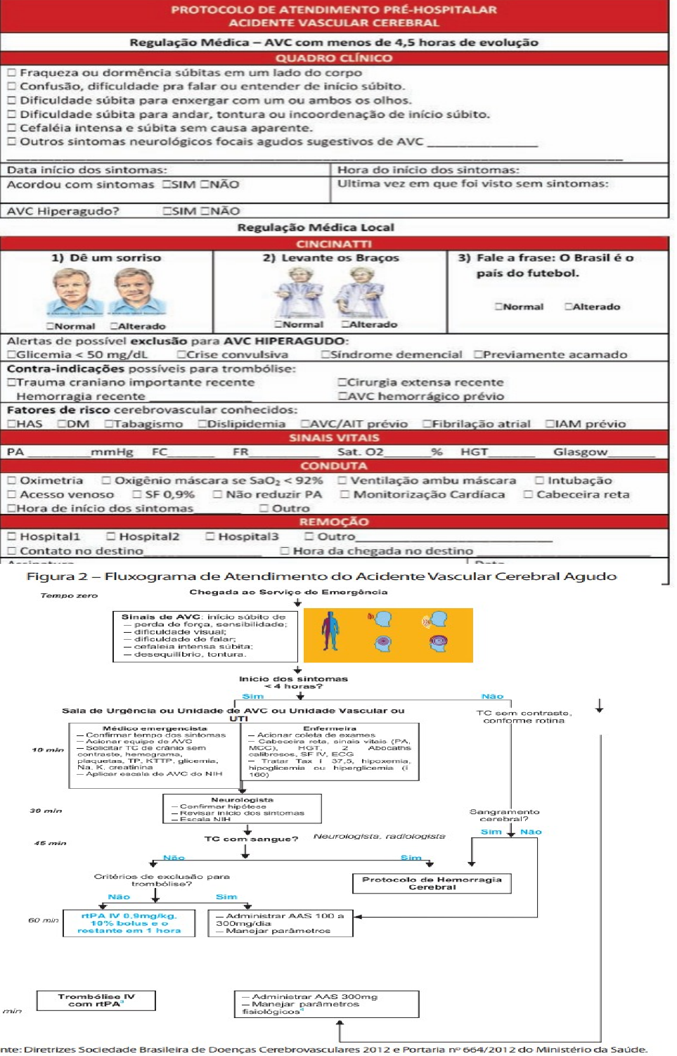 Trombólise IV- critério de inclusão para uso de rtPA/ATPlase (AVC isquêmico em qualquer território encefalico ,possibilidade de se iniciar a infusão do rtPA dentro de 4,5 horas do início dos sintomas. Para isso, o horário do início dos sintomas deve ser precisamente estabelecidos. Caso os sintomas forem observados foi observado normal; tomografia computadorizada (TC) do crânio ou RM sem evidencia de hemorragia, idade superior a 18 anos; critérios de exclusão – uso de anticoagulantes orais com tempo de protrombina (TP) com RNI superior a 1.7.U so de heparina nas ultimas 48 horas com TTPa elevado. AVC isquêmico ou traumatismo cranioencefálico grave nos últimos 3 meses. Historia pregressa de hemorragia intracraniana ou de malformação cerebral. RC de crânio demonstrando hemorragia. PAS sistólica acima de 185mmHg ou PA diastólica acima de 110) (em 3 ocasiões com 10 minutos de intervalo) refratária ao tratamento anti-hipertensivo, com melhoria rápida e completa dos sinas e sintomas nos período anterior ao início da trombólise, déficit neurológicos leves, cirurgia de grande porte o procedimento invasivo nos últimos 14 anos, Punção lombar nos últimos 7 dias, hemorragia geniturinária ou gastrointesitnal nos ultima 21 dias ou historia de varizes esofagianas, punção arterial em local não compressível na ultima semana, coagulopatia com Tp prolongada (RNI acima de 1,7) TTPA elevada ou plaquetas abaixo de 100.000, glicemia abaixo de 50 com reversão dos sintomas apos correção, evidência de endocardite ou embolo séptico, gravidez, infarto do miocárdio recente (contraindicação relativa) suspeita de hemorragia subaracnóidea ou dissecção aguda de aorta · Glicemia deve fica entre 60 e 400 · Dentre as contraindicações as que são consideradas relativas: sangramento do trato genito-urinaria, sangramento de TGI (mais de 21 dias) malformação arteriovenosa intracraniana); gestação, câncer, crise convulsiva, história de menstruarão, punção arterial em sito não compreensível nos últimas 7 dias e punção lombar nos últimas 7 dias. Cirurgia de grande porte nos ultimo 14 dias, trama grave não TCE nos ultimas 14 dias, · Cuidado! Apesar de poder evolui com paralisa de Todd, crises convulsiva pode ser a presença de um AVC isquêmico, Nunca menospreze paciente hemiparéticos após uma crise, · Lembra que uso de AAS, clopidogrel, uso de heparina em dose profilática, uso de Varfarin com IRN abaixo de 1,7 ; ultima dose de DOAC maior que 48 horas com função renal normal não sãos contraindicações Regime de tratamento do AVCi agudo com rtPA IV, transferi paciente para sala de urgência, unidade de tratamento intensivo, unidade de AVC agudo ou unidade vascular, indicar infusão de rtPA 0,9 mg/kg administrando 10% em bolus em 1 minutos e o restante 1 em 1, Não exceder dose máxima de 90 mg. Não administrar heparina, antiagragante plaquetária ou anticoagulante oral nas primeiras 24 horas do uso do trombolítico, manter o paciente em jejum por 24 horas pelo risco de hemorragia e neceessidade de intervenção cirúrgica, Não passar sonda nasogatrica nas preiam s 24 horas, não realizar cateterização venosa central ou punção arterial nas primeiras 24 horas. Não passar sonda vesical, se for imprevisível, podemos esperar 30 min após fim da infusão de rtPA. Manter hidratação com soro fisiológico, So uso soro glicosado se houver hipoglicmiea (nesse caso, usar soro isotônico) Controle neurológico rigoroso, verifica escore de AVC do NIH a cada 15 minutos após infusão, a cada 30 minutos nas primeiras 6 horas, e apos ,a cada hora ate completar 24 horas, monitorize a pressão arterial a cada 15 minutos nas duas primeiras horas depois a cada 30 minutos, ate 24 a 36 horas do início do tratamento, mante a pressão arterial abaixo de e 180/105mmHg. Se houver qualquer suspeita de hemorragia, suspeita rtPA e solicitar TC de crânio om urgência, hemograma TP, KTTP plaquetas e fibrinogênio. Após 24 horas do tratamento trombolitico, o tratamento do AVC segue as mesma orientações do paciente que não receber trombólise, isto é antiagregante plaquetária e coagulação, iniciar profilaxia para TVP (HBPM ou enoxaparina) 24 horas de trombólise O controle da pressão arterial, se PA estiver acima de 220 e/ou 140 (PAS) iniciamos com nitroprussiato, se PAS estiver 180-220 ou PAS 110-140 podemos controlar com esmolol, metoprolol ou enalapril iv, no pre-tratamento monitore PA cada 15 minutos, aspo o inicio da infusão, monitore a PA a cada 15 minutos nas 2 primerias horas a cada minutos, ate completar 24 a 36 horas do início de tratamento. Utilizar anti-hipertensivo IV se PA maior que 180/105 mmhg, · Nitroprussaio de sódio (Nipride) – 1amp te 50 mg, diluir 250 de SG5%. Usar 0,5 – 8ug/kg/min · Metoprolol (seloken) 1 amp tem 5ml com 5 mg, aplicamos 5 mg a cada 1ml/min a cada 10 min, ate no máximo 20 mg · Esmolol (brvibloc) 1 amp tem 2500 mg – 10 ml, diluir amplo em 240 de SF0,9%+ 10 10g/ml, dose de ataque 0,5mg/kg em 1 minutos, depois infusão continua de 0,05-3mg/kg/min · O rtPA EV (0,9 mg/kg, no máxima 90 mg) com 10% em bolus inicial, seguida da infusão restante em 60 minutos, A diluição é de 1mg/ml (já vem diluído) deve utilizar vãos da extremidade superior e não correr em Y com nenhuma outra medicação Na suspeita de sangramento, (paciente pode sofrer um transformação hemorrágica) – piora do defcit neurológico ou de nível de consciência, cefaleia subira, náuseas, vômitos, se for sunte a infusão, descontinuar rtPA, TC de crânio urgentee, colher HT,HB,TP,TTPA, plaquetas e fibrinogênio, se houver ehatona na TC avaliação neurocirurgica, o sangramento pode ser atribuído ao erPA se core em 24-36 horas, outro locais de sangramento, aplicar compressão mecânica, alguns caso de sangramento, para rtPA Tratamento da complicações hemorrágicas- o sangramento cerebral que se correlaciona cosntantes é o hematoma tipo 2 (e p