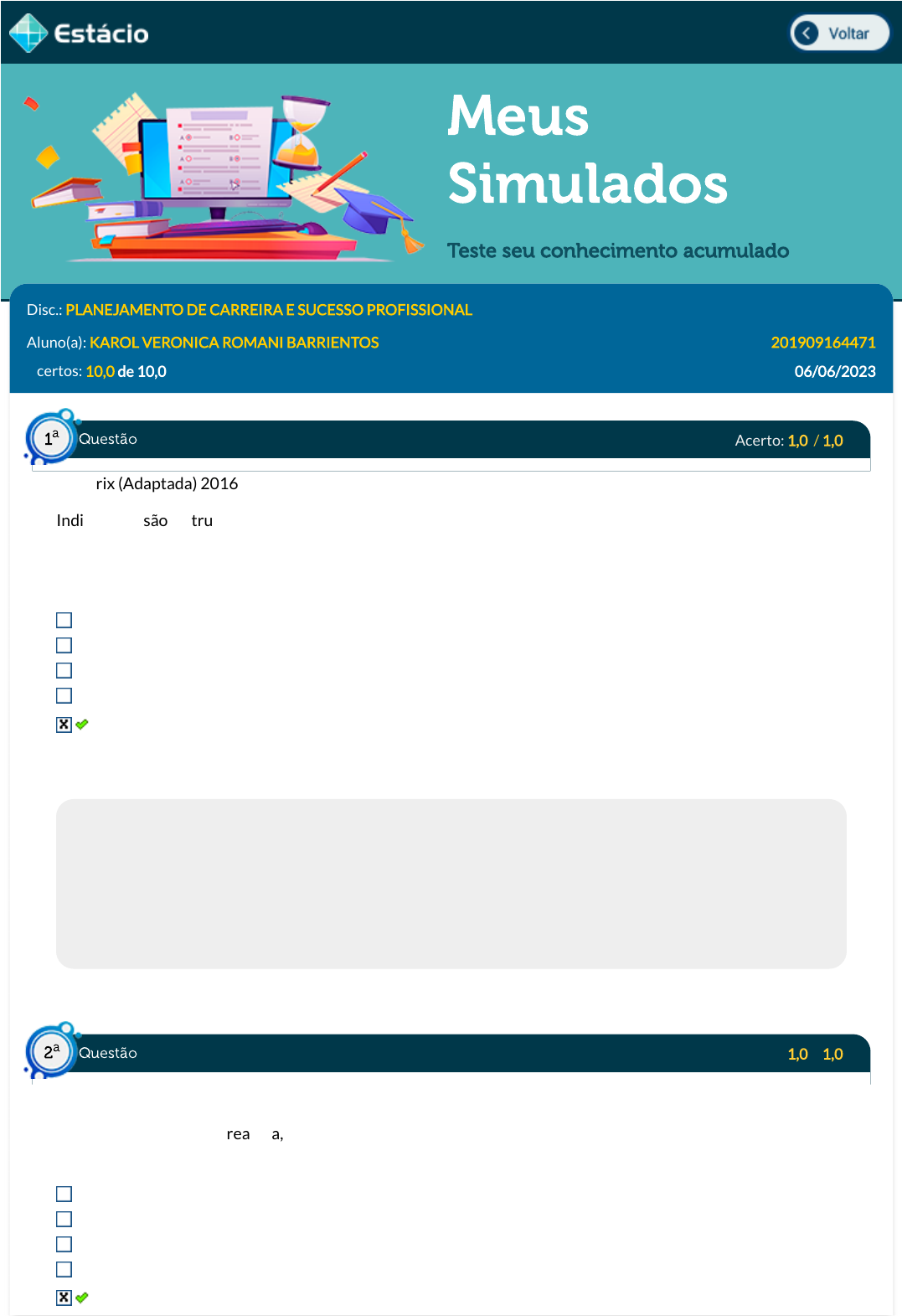 Meus Simulados Teste seu conhecimento acumulado Disc.: PLANEJAMENTO DE CARREIRA E SUCESSO PROFISSIONAL Aluno(a): KAROL VERONICA ROMANI BARRIENTOS 201909164471 Acertos: 10,0 de 10,0 06/06/2023 Acerto: 1,0 / 1,0 Quadrix (Adaptada) 2016 Indicadores são instrumentos de gestão do tempo utilizados nas atividades de monitoramento e avaliação dos objetivos e metas. Fazendo uso de um sistema de OKR (Objetive Key-Results) é possível realizar a medição e o consequente nível de desempenho e sucesso de um planejamento ou de um determinado objetivo. Um indicador do tipo SMART (Speci�c/Measurable/Attainable/Relevant/Timely) deve conter: todos os aspectos do plano, considerando aspectos pessoais e interpessoais. métricas com diferentes variáveis não quanti�cáveis. de�nições de variáveis quanti�cáveis e não quanti�cáveis. prazos �exíveis sem de�nição precisa. especi�cidade sobre o que se espera como resultado. Respondido em 07/06/2023 14:08:28 Explicação: O acrônimo SMART é utilizado para a construção de objetivos com características que ajudem a torna-los mais palpáveis e mais interessantes para a execução de técnicas como o OKR. Outras diversas técnicas se bene�ciam desse das vantagens de se construir objetivos e metas utilizando os princípios contidos nele. Pensando especi�camente na OKR, o que se busca é que os resultados possam ser medidos de forma objetiva, especí�ca, evitando ambiguidades e super ou sub estimação de resultados. As demais alternativas ferem algum dos princípios especi�cados no acrônimo SMART, como a letra "b" que fala em métricas não quanti�cáveis. Acerto: 1,0 / 1,0 IADES - 2018 Para que uma meta seja realista, deve estar relacionada a uma métrica. Dessa forma, é necessário que tenha atributos em sua composição. Assinale a alternativa que apresenta os cinco atributos SMART de uma meta. Seletiva, maleável, atrativa, rápida e tangível Especí�ca, moderna, anual, realista e tangível Positiva, sustentável, desa�adora, gerenciável e especí�ca Superável, medível, atingível, gerenciável e ecológica Especí�ca, medível, atingível, realista e com tempo de�nido Questão1 a Questão2 a https://simulado.estacio.br/alunos/inicio.asp javascript:voltar(); Respondido em 07/06/2023 14:26:37 Explicação: O acrônimo SMART que em inglês quer dizer Speci�c/ Measurable/ Attainable/ Relevant/ Timely, tem como tradução o indicado na alternativa "Especí�ca, medível, atingível, realista e com tempo de�nido". As demais alternativas trazem traduções distintas e que não condizem com os princípios apontados como importantes para a construção de objetivos e metas com excelência. Acerto: 1,0 / 1,0 Em relação às dinâmicas do mercado de trabalho, a escassez de mão de obra acontece quando: Não há operários su�cientes no setor da construção. Tem mais demanda de trabalho que pessoas quali�cadas para essas vagas. A oferta de trabalho é maior que a demanda de trabalho. O valor dos salários estão acima do que podem pagar as empresas. As tecnologias �cam obsoletas e deixam de ser usadas. Respondido em 07/06/2023 14:27:47 Explicação: Gabarito: Tem mais demanda de trabalho que pessoas quali�cadas para essas vagas. Justi�cativa: A escassez de mão de obra acontece com frequência nos mercados de certos tipos de trabalho. Entre outras situações, pode ocorrer, por um lado, quando há poucas pessoas dispostas a realizar certo tipo de ocupações (pelo seu risco, salário ou prestígio, por exemplo). Por outro, quando a quali�cação requerida para certas vagas é muito alta ou especí�ca e não tem su�cientes pessoas com esse per�l. Acerto: 1,0 / 1,0 Considerando a importância do autoconhecimento para orientar a carreira, indique qual dessas dimensões não formam parte desse conhecimento: Competências pro�ssionais destacadas. Fraquezas em relação a nossas atitudes. Os valores que consideramos mais importantes. Nível de renda familiar. Propósitos na nossa vida. Respondido em 07/06/2023 14:34:03 Explicação: Gabarito: Nível de renda familiar. Justi�cativa: O nível de renda familiar não é um elemento expressivo do autoconhecimento em relação à gestão da carreira. Outras questões são mais relevantes, tais como: ter clareza dos nossos propósitos na vida, identi�car quais são os valores mais importantes para nós, diferenciar nossas fortalezas pro�ssionais, assim como reconhecer as competências que precisamos desenvolver. Questão3 a Questão4 a Acerto: 1,0 / 1,0 Questão5 a Hoje, em nosso sistema �nanceiro nacional, existem diversos tipos e meios de pagamento disponíveis para o cidadão. Cada tipo de meio de pagamento oferece vantagens e desvantagens. O meio de pagamento eletrônico que oferece como vantagem a inexistência de custos, a transferência instantânea dos valores e a inexistência de restrição de horário para utilização é: Pagamento com transferência de direitos. DOC/TED. PIX. Cartão de crédito. Cartão de débito. Respondido em 07/06/2023 14:35:02 Explicação: O pagamento eletrônico lançado pelo BCB em 2020 foi uma inovação nos sistema �nanceiro. Sendo uma operação sem custo, instantânea e sem limite de horário, rapidamente caiu no gosto dos brasileiros e ultrapassou as expectativas de adesão projetadas pelo BCB. Mesmo sendo bons produtos, os demais meios de pagamentos têm funções diferentes, sendo que o PIX foi introduzido muito mais para substituir o papel moeda que essa outras modalidades de pagamento. Acerto: 1,0 / 1,0 Os nutrientes que podem fornecer energia são: carboidratos e proteínas. lipídios e vitaminas. carboidratos e minerais. proteínas e vitaminas. vitaminas e minerais. Respondido em 07/06/2023 14:35:16 Explicação: Você precisa entender o conceito de energia sob a ótica dos organismos vivos. A�nal, tanto a falta como o excesso de energia trazem problemas de saúde. A questão propõe que 