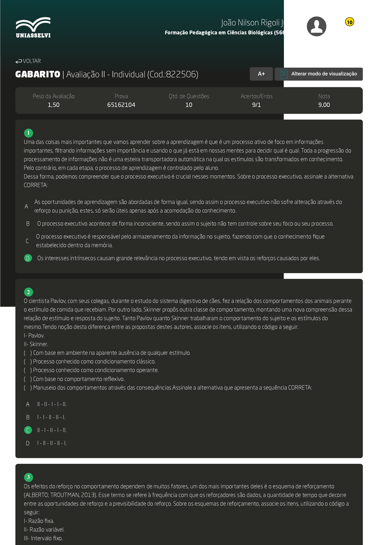 10/06/2023, 00:36 AVA https://ava2.uniasselvi.com.br/subject/grades-and-tests/answer-book/eyJ0ZXN0Ijp7InRlc3RDb2RlIjoiODIyNTA2IiwiZGVzY3JpcHRpb24iOiJBdmFsaWHDp8OjbyBJSSAtIEluZGl2aWR1YWwiLCJwYXJhbWV0ZXIiOjU0… 1/5 GABARITO | Avaliação II - Individual (Cod.:822506) Peso da Avaliação 1,50 Prova 65162104 Qtd. de Questões 10 Acertos/Erros 9/1 Nota 9,00 Uma das coisas mais importantes que vamos aprender sobre a aprendizagem é que é um processo ativo de foco em informações importantes, filtrando informações sem importância e usando o que já está em nossas mentes para decidir qual é qual. Toda a progressão do processamento de informações não é uma esteira transportadora automática na qual os estímulos são transformados em conhecimento. Pelo contrário, em cada etapa, o processo de aprendizagem é controlado pelo aluno. Dessa forma, podemos compreender que o processo executivo é crucial nesses momentos. Sobre o processo executivo, assinale a alternativa CORRETA: A As oportunidades de aprendizagem são abordadas de forma igual, sendo assim o processo executivo não sofre alteração através do reforço ou punição, estes, só serão úteis apenas após a acomodação do conhecimento. B O processo executivo acontece de forma inconsciente, sendo assim o sujeito não tem controle sobre seu foco ou seu processo. C O processo executivo é responsável pelo armazenamento da informação no sujeito, fazendo com que o conhecimento fique estabelecido dentro da memória. D Os interesses intrínsecos causam grande relevância no processo executivo, tendo em vista os reforços causados por eles. O cientista Pavlov, com seus colegas, durante o estudo do sistema digestivo de cães, fez a relação dos comportamentos dos animais perante o estímulo de comida que recebiam. Por outro lado, Skinner propôs outra classe de comportamento, montando uma nova compreensão dessa relação de estímulo e resposta do sujeito. Tanto Pavlov quanto Skinner trabalharam o comportamento do sujeito e os estímulos do mesmo.Tendo noção desta diferença entre as propostas destes autores, associe os itens, utilizando o código a seguir: I- Pavlov. II- Skinner. ( ) Com base em ambiente na aparente ausência de qualquer estímulo. ( ) Processo conhecido como condicionamento clássico. ( ) Processo conhecido como condicionamento operante. ( ) Com base no comportamento reflexivo. ( ) Manuseio dos comportamentos através das consequências.Assinale a alternativa que apresenta a sequência CORRETA: A II - II - I - I - II. B I - I - II - II - I. C II - I - II - I - II. D I - II - II - II - I. Os efeitos do reforço no comportamento dependem de muitos fatores, um dos mais importantes deles é o esquema de reforçamento (ALBERTO; TROUTMAN, 2013). Esse termo se refere à frequência com que os reforçadores são dados, a quantidade de tempo que decorre entre as oportunidades de reforço e a previsibilidade do reforço. Sobre os esquemas de reforçamento, associe os itens, utilizando o código a seguir: I- Razão fixa. II- Razão variável. III- Intervalo fixo. VOLTAR A+ Alterar modo de visualização 1 2 3 João Nilson Rigoli Junior Formação Pedagógica em Ciências Biológicas (5663998) 10 10/06/2023, 00:36 AVA https://ava2.uniasselvi.com.br/subject/grades-and-tests/answer-book/eyJ0ZXN0Ijp7InRlc3RDb2RlIjoiODIyNTA2IiwiZGVzY3JpcHRpb24iOiJBdmFsaWHDp8OjbyBJSSAtIEluZGl2aWR1YWwiLCJwYXJhbWV0ZXIiOjU0… 2/5 IV- Intervalo variável. ( ) Está disponível apenas em determinados horários periódicos. O exame final é um exemplo clássico. Esse planejamento cria um padrão interessante de comportamento. O indivíduo pode fazer muito pouco até um pouco antes do reforço estar disponível e, então, despender um jorro de esforço conforme o tempo para o reforço se aproximar. ( ) Está disponível em alguns momentos, mas não em outros, e não temos ideia de quando um comportamento será reforçado. Um exemplo disso é fazer verificações pontuais de alunos que estão fazendo as tarefas em sala de aula. Os alunos são reforçados se estiverem trabalhando bem no momento específico em que o professor aparece. Como eles não podem prever quando o professor os verificará, os alunos devem estar fazendo um bom trabalho o tempo todo. ( ) É aquele em que o número de comportamentos necessários para o reforço é imprevisível, embora seja certo que os comportamentos acabarão por ser reforçados. Por exemplo, uma máquina caça-níqueis é um reforçamento de razão variável. Pode valer a pena após uma única puxada e após 200 puxadas na próxima vez, e não há como prever qual puxada vencerá. ( ) É dado após um número fixo de comportamentos. Por exemplo, pode-se dizer: “assim que terminar dez problemas, você pode ir lá fora”. Independentemente do tempo que demore, os alunos são reforçados assim que concluem dez problemas. Assinale a alternativa que apresenta a sequência CORRETA: FONTE: ALBERTO, P. A.; TROUTMAN, A. C. Applied behavior analysis for teachers. 9. ed. Upper Saddle River: Pearson, 2013. A III - I - IV - II. B III - IV - II - I. C II - IV - I - III. D I - II - III - IV. Bandura (1986) observou que a ênfase skinneriana nos efeitos das consequências do comportamento ignorou amplamente os fenômenos de modelagem – a imitação do comportamento dos outros – e da experiência vicária – aprender com os sucessos ou fracassos dos outros. Ele sentiu que muito da aprendizagem humana não é moldada por suas consequências, mas é aprendida com mais eficiência diretamente de um modelo. Sobre as fases da aprendizagem observacional, segundo análise de Bandura (1997), e suas descrições, associe os itens, utilizando o código a seguir: I- Fase de atenção. II- Fase de retenção. III- Fase da reprodução. IV- Fase motivacional. ( ) Durante esta fase, os alunos tentam combinar seu comportamento com o do modelo. Na sala de aula, a avaliação da aprendizagem do aluno ocorre durante esta fase. Por exe