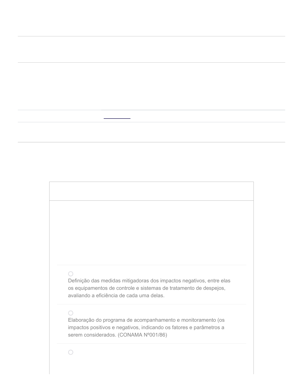 * Algumas perguntas ainda não avaliadas PRV - Prova Entrega 11 jun em 23:59 Pontos 4 Perguntas 12 Disponível 5 jun em 0:00 - 11 jun em 23:59 Limite de tempo 180 Minutos Histórico de tentativas Tentativa Tempo Pontuação MAIS RECENTE Tentativa 1 71 minutos 2 de 4 * Pontuação deste teste: 2 de 4 * Enviado 10 jun em 12:55 Esta tentativa levou 71 minutos. 0,2 / 0,2 ptsPergunta 1 O Estudo de Impacto Ambiental é o conjunto de estudos realizados com dados técnicos detalhados, realizado por profissionais especializados. No artigo 6° da Resolução CONAMA 001/86, o estudo de impacto ambiental deve desenvolver algumas atividades. Qual das alternativas abaixo NÃO inclui uma atividade? Definição das medidas mitigadoras dos impactos negativos, entre elas os equipamentos de controle e sistemas de tratamento de despejos, avaliando a eficiência de cada uma delas. Elaboração do programa de acompanhamento e monitoramento (os impactos positivos e negativos, indicando os fatores e parâmetros a serem considerados. (CONAMA Nº001/86) PRV - Prova: 2023B - Ciências do Ambiente (61928) - Eng. Civil https://ucaead.instructure.com/courses/61928/quizzes/160736 1 of 8 10/06/2023, 12:55 https://ucaead.instructure.com/courses/61928/quizzes/160736/history?version=1 https://ucaead.instructure.com/courses/61928/quizzes/160736/history?version=1 Análise dos impactos ambientais do projeto e de suas alternativas, através de identificação, previsão da magnitude e interpretação da importância dos prováveis impactos relevantes. A caracterização da qualidade ambiental futura da área de influência. Correto!Correto! 0,2 / 0,2 ptsPergunta 2 Sobre o estudo de caso envolvendo a área de Engenharia de Produção (TÓPICOS EM ENGENHARIA AMBIENTAL: ESTUDO DE CASO REFERENTE À ANÁLISE AMBIENTAL), qual o processo empregado na empresa como forma de reduzir a geração de resíduos. Sistema de Gestão Ambiental e Produção Limpa.Correto!Correto! ISO 140001:2015. Processo AQUA. Processo LEED. 0,2 / 0,2 ptsPergunta 3 A Produção Mais Limpa refere-se à produção integrada fortemente à preservação ambiental, ou seja, todas as fases do processo de produção visam a redução de poluentes. As vantagens mais evidentes são a redução da quantidade de materiais e energia usados e a minimização de poluentes (resíduos, efluentes, emissões). Qual é considerado o principal objetivo da Produção Mais Limpa. PRV - Prova: 2023B - Ciências do Ambiente (61928) - Eng. Civil https://ucaead.instructure.com/courses/61928/quizzes/160736 2 of 8 10/06/2023, 12:55 Fortalecimento econômico aliado à prevenção da poluição.Correto!Correto! Exclusão de inovação na produção. Aumento de produção, somente. Redução de poluição, somente. 0,2 / 0,2 ptsPergunta 4 Dentre as atividades ligadas ao transporte, qual delas, listadas abaixo, estão sujeitas ao Licenciamento Ambiental? I - Transporte de cargas ou de pessoas. II - Transporte de cargas perigosas. III - Transporte por dutos. IV - Marinas, portos e aeroportos. Terminais de minério, petróleo e derivados Todas as atividades.Correto!Correto! Somente a atividade IV. Todas as atividades, exceto a IV. Somente as atividades I, II e III. 0,2 / 0,2 ptsPergunta 5 PRV - Prova: 2023B - Ciências do Ambiente (61928) - Eng. Civil https://ucaead.instructure.com/courses/61928/quizzes/160736 3 of 8 10/06/2023, 12:55 Sobre o estudo de caso envolvendo a área de Engenharia Civil (SUSTENTABILIDADE NA CONSTRUÇÃO CIVIL: ESTUDO DE CASO EM UMA ORGANIZAÇÃO NÃO GOVERNAMENTAL), qual o principal problema identificado? Contaminação do lençol freático. Problemas com mofos, manchas, vazamento de água e perde de energia elétrica na edificação. Correto!Correto! Geração de resíduos. Geração de resíduos radioativos. 0,2 / 0,2 ptsPergunta 6 Quais são os três pilares em que o conceito de sustentabilidade é baseado? Cultural, emocional e financeiro Educação, social e politico Social, político e financeiro Econômico, social e financeiro Econômico, social e ambientalCorreto!Correto! 0,2 / 0,2 ptsPergunta 7 PRV - Prova: 2023B - Ciências do Ambiente (61928) - Eng. Civil https://ucaead.instructure.com/courses/61928/quizzes/160736 4 of 8 10/06/2023, 12:55 O Objetivo nº 5 do Desenvolvimento Sustentável fala sobre igualdade de gênero, de modo a alcançar a igualdade de gênero e empoderar as mulheres e meninas. Assinale a alternativa correta, que corresponde às metas desse objetivo. Acabar com algumas formas de discriminação contra as mulheres e meninas. Eliminar todas as formas de violência contra todas as mulheres e meninas, excluindo tráfico e exploração sexual. Aumenta o uso de tecnologias de base, para promover o empoderamento das mulheres. Correto!Correto! Assegurar o acesso a alguns postos de saúde. 0,2 / 0,2 ptsPergunta 8 Analise as informações abaixo: I. Emissões atmosféricas: deixam o local do processo através do ar. II. Emissões em corrente liquida: deixam o local do processo através das correntes de água. III. Emissões térmicas: energia que aumenta a temperatura do meio circundante. Com base nos conhecimentos adquiridos responda. c) I e II são verdadeiras e) II e III são verdadeiras PRV - Prova: 2023B - Ciências do Ambiente (61928) - Eng. Civil https://ucaead.instructure.com/courses/61928/quizzes/160736 5 of 8 10/06/2023, 12:55 a) Todas são verdadeirasCorreto!Correto! d) III é falsa b) I é falsa 0,2 / 0,2 ptsPergunta 9 Em 1997 foi assinado o Protocolo de Kyoto, acordo assinado entre 37 países e a comunidade europeia que visa: Proteção das matas ciliares Redução da emissão de gases de efeito estufa.Correto!Correto! Redução da produção de novos produtos. Proteção da fauna e flora. 0,2 / 0,2 ptsPergunta 10 Com base no objetivo 1 – Erradicação da Pobreza, analise as alternativas e assinale a que não possua uma meta para esse objetivo. d) Até 2030, construir a resiliência dos pobres e daqueles em situações de vulnerabili