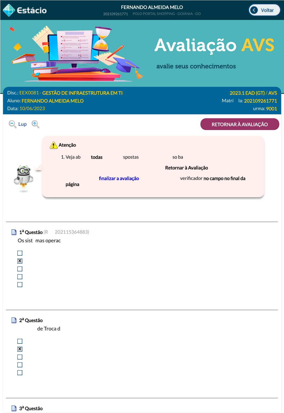 2. Caso você queira voltar à prova clique no botão "Retornar à Avaliação".