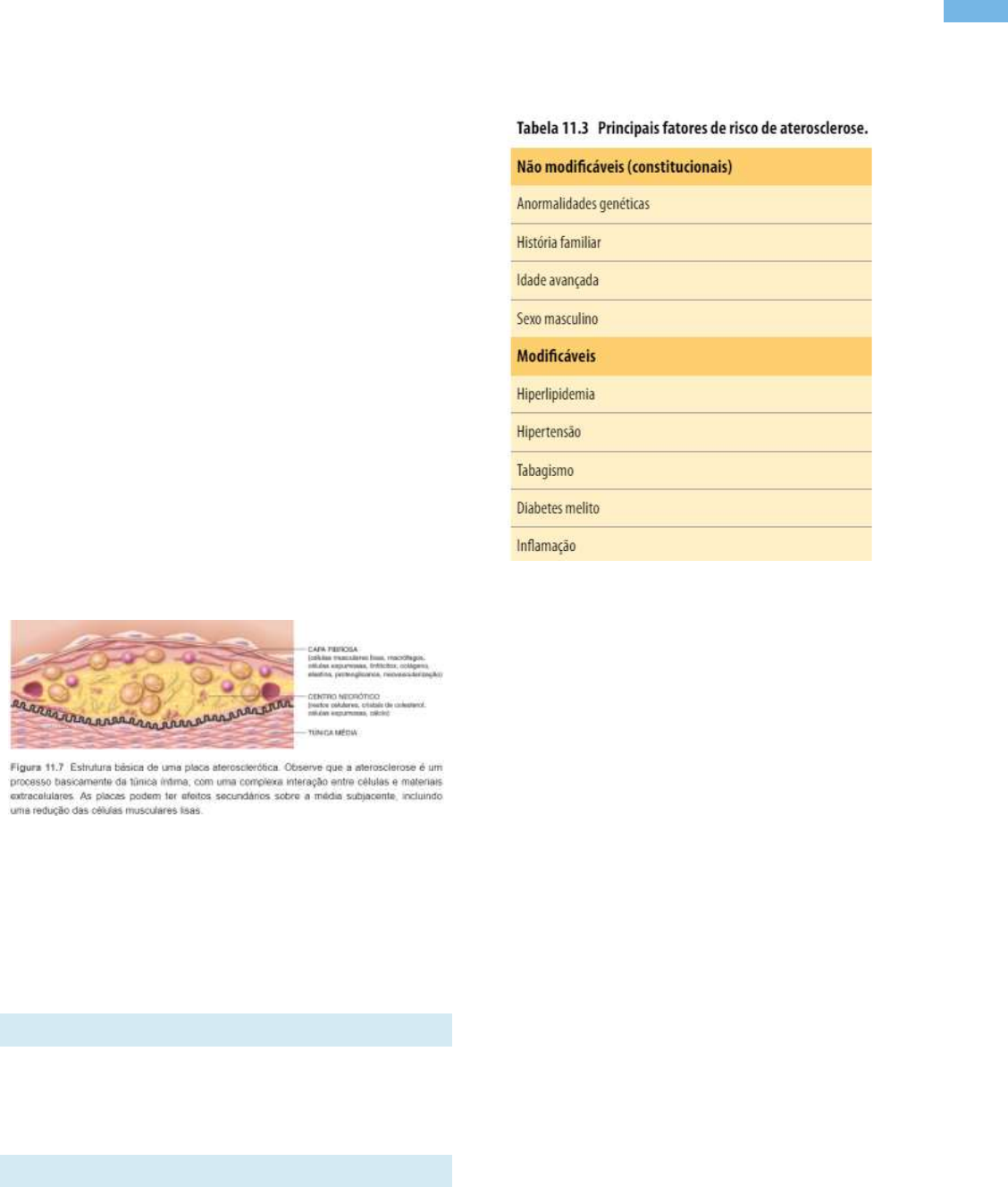 1 Laís Flauzino | ANATOMIA PATOLÓGICA | 7°P MEDICINA Aterosclerose • Base das doenças coronarianas, cerebrais e vasculares periféricas. • Provoca morbidade e mortalidade mais do que qualquer outra doença. • Doença arterial coronariana constitui importante manifestação da aterosclerose. A probabilidade de aterosclerose é determinada pela combinação de: • fatores de risco adquiridos (níveis de colesterol, tabagismo, hipertensão), • hereditários (mutações nos genes dos receptores de lipoproteína de baixa densidade LDL) e • associados a sexo e à idade. Esses fatores, atuando em conjunto causam lesões da túnica íntima que fazem protusão na luz dos vasos – ateromas, placas ateromatosas ou ateroscleróticas. Placa ateromatosa: • lesão elevada • cerne mole e grumoso de lipídios (colesterol e ésteres de colesterol) • recoberta por capa fibrosa Importante: • As placas ateroscleróticas podem sofrer ruptura, levando à trombose vascular obstrutiva. • As placas ateroscleróticas podem aumentar a distância de difusão da luz até a média, levando à lesão isquêmica e ao enfraquecimento da parede do vaso – pode resultar em aneurisma. EPIDEMIOLOGIA: A redução da mortalidade por doenças infecciosas e a adoção do estilo de vida ocidental levaram a um aumento na prevalência da doença cardíaca isquêmica nos países de baixa renda. FATORES DE RISCO: • Fatores constitucionais – menos controláveis. • Fatores adquiridos ou relacionados com comportamentos específicos – são acessíveis à intervenção. Normalmente, esses fatores de risco apresentam efeitos mais do que aditivos, porém o tratamento (mesmo quando abaixo do ideal) pode reduzir parte do risco. Fatores de risco constitucionais: • Genética: a predisposição familiar bem estabelecida à aterosclerose e à doença cardíaca isquêmica é habitualmente poligênica. • Idade: o desenvolvimento da placa aterosclerótica é um processo progressivo que se manifesta clinicamente na meia-idade ou em uma idade mais avançada. Com o envelhecimento, há uma tendência à proliferação de clones hematopoéticos e essa hematopoese clonal está associada a um aumento da mortalidade cardiovascular. • Gênero: mulheres na pré-menopausa são relativamente protegidas contra a aterosclerose. Por isso, o IAM e outras complicações da aterosclerose são incomuns em mulheres na pré- menopausa, a não ser que tenham predisposição ao DM, à hiperlipidemia ou à hipertensão grave. Entretanto, depois da menopausa, a incidência de doenças relacionadas com a aterosclerose aumenta. Importante: a terapia com estrogênio na pós-menopausa aumenta o risco cardiovascular. Fatores de risco modificáveis: • Hiperlipidemia e hipercolesterolemia: a hipercolesterolemia é suficiente para iniciar o desenvolvimento de uma lesão. O principal componente do colesterol sérico associado a um aumento de risco é o colesterol LDL (“colesterol ruim”). A LDL é o complexo de lipídio-colesterol- proteína que libera colesterol nos tecidos periféricos; em contrapartida, a lipoproteína de alta densidade (HDL) é o complexo que mobiliza 2 Laís Flauzino | ANATOMIA PATOLÓGICA | 7°P MEDICINA colesterol da periferia (incluindo ateromas) e o transporta até o fígado para catabolismo e excreção biliar. A presença de níveis mais altos de HDL (“colesterol bom”) correlaciona-se com uma redução do risco. Reduzir os níveis de LDL é interessante, mas elevar exclusivamente os níveis de HDL não é efetivo. Ácidos graxos ômega-3 são benéficos. Gorduras insaturadas trans são adversas. As estatinas são uma classe de fármacos que reduzem os níveis circulantes de colesterol ao inibir a hidroximetilglutaril coenzima A (HMG CoA) redutase, a enzima limitadora de velocidade na biossíntese hepática de colesterol. As estatinas também tem efeitos não intencionais sobre a redução da inflamação. • Hipertensão: pode aumentar o risco de doença cardíaca isquêmica. Constitui a causa mais comum de hipertrofia ventricular esquerda – também um marcador substituto de risco cardiovascular. • Tabagismo: duplica a taxa de mortalidade por doença cardíaca isquêmica. O abandono do tabagismo reduz de modo substancial esse risco. • Diabetes melito: induz hipercolesterolemia e aumenta o risco de aterosclerose. A incidência de IAM é 2x mais alta em pacientes diabéticos. Existe também um aumento no risco de acidente vascular encefálico e um aumento de 100 vezes no risco de gangrena dos membros inferiores induzida pela aterosclerose. Fatores de risco adicionais: Até 20% de todos os eventos cardiovasculares ocorrem na ausência de fatores de risco importantes (p. ex., hipertensão, hiperlipidemia, tabagismo ou diabetes melito). Com efeito, mais de 75% dos eventos cardiovasculares em mulheres anteriormente saudáveis ocorrem com níveis de colesterol LDL abaixo de 160 mg/dℓ (níveis geralmente considerados indicadores de baixo risco). Evidentemente, existe a contribuição de outros fatores. Entre os fatores comprovados ou suspeitos, destacam-se os seguintes: • Inflamação: observada em todos os estágios da aterogênese e está ligada à formação da placa aterosclerótica e sua ruptura. Diversos marcadores circulantes da inflamação exibem uma correlação com a doença cardíaca isquêmica, e a proteína C reativa (PCR) surgiu como um dos mais estáveis e mais simples de medir. A PCR é um reagente de fase aguda sintetizado principalmente pelo fígado. Embora a PCR não pareça ter nenhuma relação causal com o desenvolvimento da aterosclerose ou suas sequelas, já está bem estabelecido que a PCR plasmática constitui um forte marcador de risco independente para o infarto do miocárdio, o acidente vascular encefálico, a doença arterial periférica e a morte súbita cardíaca, até mesmo entre indivíduos aparentemente saudáveis. Por conseguinte, os níveis de PCR são agora incorpo