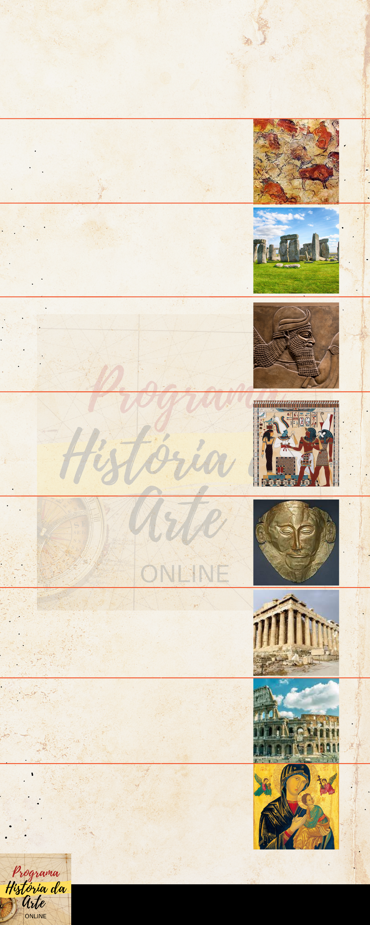 Linha do Tempo da História da Arte www.historiadaarteonline.com.br @programahistoriadaarteonline 01.Pré-história paleolítico 03.Arte Mesopotâmica 04.Arte Egípcia Antiga 02.Pré-história neolitico 05.Arte Micênica e Cretense 06.Arte Grega antiga 07.Arte Romana antiga 08.Arte Bizantina e conteúdo programático do curso completo com Dante Velloni. www.historiadaarteonline.com.br @programahistoriadaarteonline 10. Arte Gótica 12. Maneirismo 13. Rococó 11. Renascimento 14. Arte Barroca 15. Neoclassicismo 16. Romantismo 17. Realismo 09. Arte Românica www.historiadaarteonline.com.br @programahistoriadaarteonline 19. Pós- Impressionismo 21. Art Nouveau 22. Fauvismo 20. Simbolismo 23. Expressionismo – O Cavaleiro Azul 24. Expressionismo – A Ponte 25. Cubismo 26. Orfismo 18. Impressionismo www.historiadaarteonline.com.br @programahistoriadaarteonline 28. Raionismo 30. Construtivismo 31. Neoplasticismo 29. Suprematismo 32. Dadaísmo 33. Arte Metafísica 34. Surrealismo 35. Informalismo 27. Futurismo www.historiadaarteonline.com.br @programahistoriadaarteonline 37. Expressionismo Abstrato - Color Field Painting 39. Hiper-realismo 40. Minimalismo 38. Pop-Art 41. Arte Conceitual 42. Op-Art 43. Arte Cinética 44. Arte Cibernética 36. Expressionismo Abstrato - Action Painting www.historiadaarteonline.com.br @programahistoriadaarteonline 46. Happening e Performance 48. Intervenções 49. Poéticas Visuais 47. Graffiti 50. Vídeo-Art 51. Arte Contemporânea e Bienais 45. Body-Art CLIQUE AQUI E ENTRE PARA A COMUNIDADE DO FACEBOOK https://www.facebook.com/groups/3504190606532042 https://www.facebook.com/groups/3504190606532042 https://www.facebook.com/groups/3504190606532042