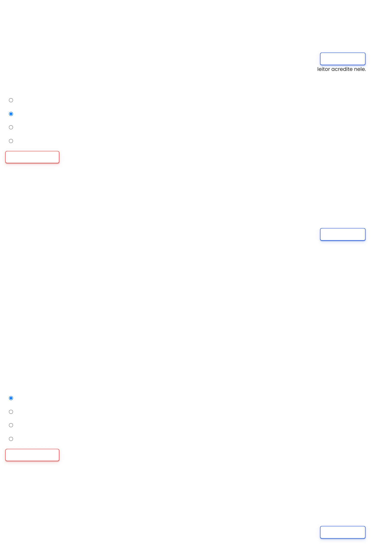 12/06/2023, 10:39 Questionário Online www.unipvirtual.com.br/avaunip/mod/quiz/attempt.php?attempt=1379350&cmid=94675 2/6 Um texto argumentativo é aquele em que defendemos uma ideia, opinião ou ponto de vista, procurando fazer com que o leitor acredite nele. Para conseguir esse objetivo, utilizamos: Escolha uma opção: a. Tópico frasal. b. Argumentos. c. Premissas. d. Raciocínio lógico. Limpar minha escolha Leia o texto abaixo: A leitura auxilia o desenvolvimento da escrita, pois lendo o indivíduo tem contato com modelos de textos bem-redigidos que, ao longo do tempo, farão parte de sua bagagem linguística; e também porque entrará em contato com vários pontos de vista de intelectuais diversos, ampliando, dessa forma, o seu ponto de vista em relação aos assuntos. Como a produção escrita se baseia praticamente na exposição de ideias por meio de palavras, certamente aquele que lê desenvolverá sua habilidade devido ao enriquecimento linguístico adquirido através da leitura de bons autores. I. O principal argumento do texto é: “A leitura auxilia o desenvolvimento da escrita”; II. A tese do texto é a seguinte: “lendo, o indivíduo tem contato com modelos de textos bem-redigidos que ao longo do tempo farão parte de sua bagagem linguística”; III. A parte do texto que apresenta a conclusão é: “Como a produção escrita se baseia praticamente na exposição de ideias por meio de palavras, certamente aquele que lê desenvolverá sua habilidade devido ao enriquecimento linguístico adquirido por meio da leitura de bons autores”; IV. O movimento do texto é A -> pt -> T. Está correto o que se afirma apenas em: Escolha uma opção: a. III. b. I e III. c. IV. d. II e IV. Limpar minha escolha Sobre o termo “argumento”, analise as afirmações a seguir: Marcar questão Questão 1 Ainda não respondida Vale 1,00 ponto(s). Marcar questão Questão 2 Ainda não respondida Vale 1,00 ponto(s). Marcar questão Questão 3 Ainda não respondida Vale 1,00 ponto(s). http://www.unipvirtual.com.br/avaunip/mod/quiz/attempt.php?attempt=1379350&cmid=94675 http://www.unipvirtual.com.br/avaunip/mod/quiz/attempt.php?attempt=1379350&cmid=94675 12/06/2023, 10:39 Questionário Online www.unipvirtual.com.br/avaunip/mod/quiz/attempt.php?attempt=1379350&cmid=94675 3/6 I. Argumento é defesa de uma ideia, opinião ou ponto de vista, procurando fazer com que o leitor acredite nele; II. A palavra argumento vem do latim argumentum e significa fazer brilhar, iluminar; III. Argumento é a apresentação de um raciocínio concreto. Está correto o que se afirma apenas em: Escolha uma opção: a. I e II. b. I e III. c. II e III. d. II, apenas. Limpar minha escolha Leia o texto a seguir: “No Brasil, as palavras envelhecem e caem como folhas secas. Não é somente pela gíria que a gente é apanhada (aliás, já não se usa mais a primeira pessoa, tanto do singular como do plural: tudo é ‘a gente’). A própria linguagem corrente vai-se renovando e a cada dia uma parte do léxico cai em desuso. Minha amiga Lila, que vive descobrindo essas coisas, chamou minha atenção para os que falam assim: — Assisti a uma fita de cinema com um artista que representa muito bem. Os que acharam natural essa frase, cuidado! Não saberão dizer que viram um filme com um ator que trabalha bem. E irão ao banho de mar em vez de ir à praia, vestido de roupa de banho em vez de biquíni, carregando guarda-sol em vez de barraca. Comprarão um automóvel em vez de comprar um carro, pegarão um defluxo em vez de um resfriado, vão andar no passeio em vez de passear na calçada. Viajarão de trem de ferro e apresentarão sua esposa ou sua senhora em vez de apresentar sua mulher.” (SABINO, F. Folha de S. Paulo, 13 abr. 1984. Com adaptações.) Qual o tema do texto? Escolha uma opção: a. A utilização de inovações no léxico na comparação de gerações. b. O emprego de palavras com sentidos diversos em diferentes regiões brasileiras. c. O uso de palavras novas em detrimento ao uso de palavras antigas. d. Os aspectos identificadores da classe social a que pertence o falante por meio da pronúncia e do vocabulário. Limpar minha escolha Preencha os parênteses com os números correspondentes; em seguida, assinale a alternativa que indica a correspondência correta das partes do texto argumentativo: 1. Introdução 2. Desenvolvimento 3. Conclusão ( ) É a parte do texto em que retomamos a tese central, agora já respaldada pelos argumentos desenvolvidos no texto. ( ) É a parte do texto argumentativo em que apresentamos o assunto de que trataremos e a tese a ser desenvolvida a respeito desse assunto. ( ) É a argumentação propriamente dita, correspondendo aos desdobramentos da tese apresentada. Esse é o coração do texto, por isso, d d b i d á f Marcar questão Questão 4 Ainda não respondida Vale 1,00 ponto(s). Marcar questão Questão 5 Ainda não respondida Vale 1,00 ponto(s). http://www.unipvirtual.com.br/avaunip/mod/quiz/attempt.php?attempt=1379350&cmid=94675 http://www.unipvirtual.com.br/avaunip/mod/quiz/attempt.php?attempt=1379350&cmid=94675 12/06/2023, 10:39 Questionário Online www.unipvirtual.com.br/avaunip/mod/quiz/attempt.php?attempt=1379350&cmid=94675 4/6 comumente se desdobra em mais de um parágrafo. Escolha uma opção: a. 1, 3 e 2. b. 2, 1 e 3. c. 1, 2 e 3. d. 3, 1 e 2. Limpar minha escolha Os temas solicitados em questões discursivas podem ser: social, filosófico ou polêmico. Sobre os temas polêmicos, podemos dizer que há, sobretudo: I. Necessidade de informações atualizadas; II. Exigência de amadurecimento intelectual; III. Pressuposição de uma visão não preconceituosa e uma proposta de intervenção que respeite os direitos humanos. Está correto o que se afirma apenas em: Escolha uma opção: a. I. b. II. c. III. d. I e II. Limpar minha escolha Sobre a introdução do texto argumentativo, analise as afirmativas a seguir: I. Constitui o primeiro parágrafo do texto; I