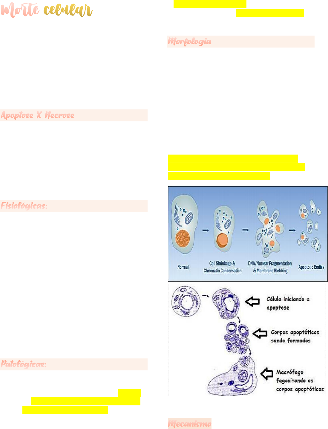 • perda irreversível das atividades integradas da célula • incapacidade de manutenção dos mecanismos de homeostasia • lesão severa nas membranas celulares • incapacidade de reverter a disfunção mitocondrial Apoptose Apoptose = morte celular programada (induzida pela própria célula) Causas: • Fisiológicas • Patológicas • Embriogênese • processo de desenvolvimento do embrião • Involução de tecidos hormônios- dependentes • útero e mama lactante • Manutenção do número constante de células • Células proliferativas (epit da pele, epit intestinal) • Morte de células que já cumpriram suas funções • Leucócitos • Lesão do DNA • radiação, drogas citotóxicas, hipóxia > (falta de oxigênio suficiente para a células e tecidos do corpo) • Acumulo de proteínas • Infecção viral • HIV, Hepatite • Atrofia no parênquima de órgãos após obstrução de ducto (redução volumétrica) • pâncreas, na parótida e no rim • retração celular • condensação da cromatina na periferia da célula • formação de bolhas citoplasmáticas > blebs • formação dos corpos apoptóticos > membrana plasmática intacta • fagocitose dos corpos apoptóticos por macrófagos ( não tem extravasamento do conteúdo citoplasmático para o tecido > não ocorre ativação resposta inflamatória ) • ativação das caspases • via intrínseca = via mitocondrial • via extrínseca = via receptor de morte • Fagocitose dos corpos apoptóticos • Macrófagos (não há ativação de resposta inflamatória) (joga o que não é necessário para fora da célula) • É a manifestação final de uma célula que sofreu lesões irreversíveis • Desnaturação das proteínas intracelulares e digestão enzimática das células lesadas • enzimas lisossomais • perda da integridade da membrana com extravasamento do conteúdo celular • ex: ação mecânica, temperatura, radiação; Agentes químicos : • ex: álcool, medicamentos, detergentes, fenóis etc; Agentes Biológicos: • ex: bactérias, vírus, fungos e parasitas; • alterações citoplasmáticas • alterações nucleares Alterações citoplasmáticas: • eosinofilia • aparência vítrea e homogênea (perda de glicogênio ) • Vacuolização citoplasmática (digestão enzimática) Alterações nucleares: • Picnose (condensação da cromatina e contração do núcleo) • Cariorrexe (fragmentação nuclear) • Cariólise (dissolução do núcleo) Necrose individual •Causa: obstrução vascular • Hipóxia → Isquemia → Infarto •Área de necrose de coagulação localizada = Infarto • Macroscopia: área pálida e opaca • Microscopia: perda do núcleo, eosinofilia citoplasmática, preservação da forma celular e arquitetura do tecido (sombra arquitetural). • Presença de sangue na área de necrose • Hipóxia • Preservação dos contornos estruturais do tecido (sombras arquiteturais) associado a hemorragia difusa • total lise da área tecidual • resulta da ação de enzimas hidrolíticas • dissolução enzimática • SNC (cérebro) e necroses supurativas (formação de pus) • Macroscopia: área amolecida, mal delimitada, liquefeita, com destruição tecidual • Microscopia: não preserva a arquitetura do tecido, acúmulo de material purulento • Tipo especial de necrose coagulativa • Se instala no meio da reação inflamatória em certas doenças • Área necrótica se assemelha à queijo branco fresco / ricota • Macroscopia: massa amorfa, esbranquiçada, sem brilho, friável e seca • Microscopia: necrose eosinofílica amorfa, circundados por células inflamatórias (granuloma). É frequente a calcificação. • Necrose enzimática das gorduras em tecidos ricos em lípidios • Macroscopia: massas esbranquiçadas com aspecto de “pingos de vela” sobre o tecido adiposo • Microscopia: contornos “sombreados” da célula adiposa rodeados por células inflamatórias • Encontrada na sífilis terciária ou na sífilis congênita • Termo derivado da “cola goma arábica”. • Macroscopia: a área necrótica é compacta, uniforme e elástica. • Microscopia: tecido rico em vasos, fibroblastos, plasmócitos e linfócitos. Presença de T. pallidum • O tecido necrótico sofre modificação por agentes externos como ar ou bactérias • Necrose de coagulação (isquemia) com ou sem liquefação associada (infecções) • Causas: trombos arteriais, aterosclerose, diabetes • GANGRENA SECA. A área necrótica perde água para o ambiente, ficando seca, retraída e com aspecto mumificado. Fica também negra, por alteração da hemoglobina. • GANGRENA ÚMIDA. Quando o tecido necrótico se contamina com bactérias que digerem o tecido.