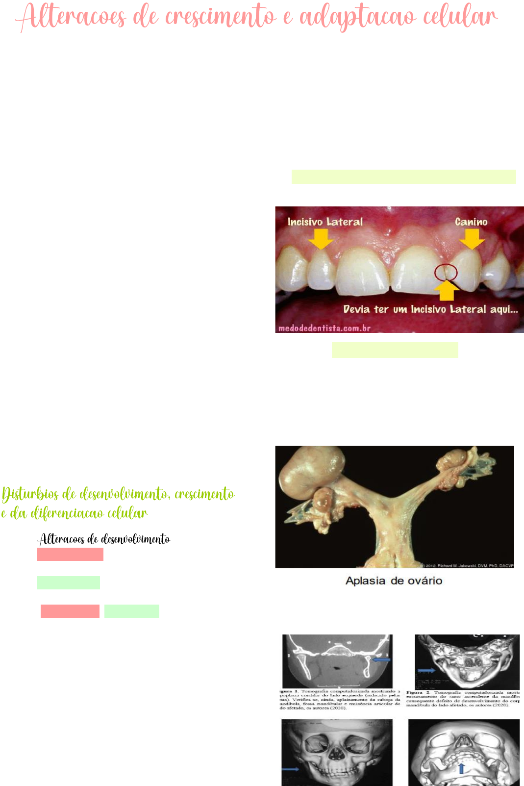 • • Ciclo celular • Células lábeis células epiteliais, hematopoiéticas e linfóides • Células estáveis fígado, pâncreas, salivares, fibroblastos e osteoblastos • Células permanentes células do sistema nervoso central e músculo Finalidade: • Organizar a proliferação celular • Transmitir a informação genética para a próxima geração. • Produzir duas células idênticas a partir de uma única célula. Função: • Regula, durante o desenvolvimento embrionário e pós-natal: • Proliferação celular • Diferenciação celular • Apoptose das células não mais necessárias • celular (congênitas) • Alterações de crescimento celular (adquiridas) • Alterações da diferenciação celular (congênitas/adquiridas) Alterações de desenvolvimento: Defeitos congênitos de desenvolvimento (GENÉTICA) Ação de agentes no desenvolvimento embrionário (toxinas, infecciosos e químicos) Causas: congênita, infecções, traumas, disfunções hormonais, medicamentos • Agenesia • Aplasia/Hipoplasia • Atresia • Ectopia Agenesia • Ausência total ou parcial de um órgão • Ex: acardia, anencefalia, etc. Aplasia: :má formação do orgão • Há somente um esboço embrionário de uma região ou órgão, sem o completo desenvolvimento destes • Ex: aplasia segmentar do esôfago, aplasia de membro, microcefalia, etc • Aplasia condilar: Hipoplasia • Formação deficiente de parte ou totalidade de um órgão ou tecido. • Há diminuição do número de células, porém, estas conservam morfologia e função normais; • o tecido ou órgão é que tem o volume e a função diminuídos. • Hipoplasia maxilar •Hipoplasia de esmalte Atresia Quando não há o completo desenvolvimento de um órgão oco ou de um ducto. Ectopia Quando um tecido ou órgão se localiza em local incomum. • Tecido normal em localização anormal. Alterações de crescimento: • Atrofia/Hipotrofia • Hipertrofia • Hipoplasia • Hiperplasia Atrofia/Hipotrofia • Redução no tamanho/volume da célula devido à perda de substância celular • Menor consumo de O2 • Diminuição no número e tamanho das organelas • Menor número de mitocôndrias, miofilamentos e estruturas do retículo endoplasmático • Causas comuns: • ↓ carga (atrofia por desuso) • Perda da inervação (atrofia por desnervação) • ↓ suprimento sanguíneo (isquemia) • Nutrição inadequada • Perda da estimulação endócrina • Por compressão Hipotrofia Fisiológica: - senilidade (generalizada) - menopausa (↓ estrogênio → atrofia mamas - afeta todo organismo → adaptação - sem prejuízo funcional Atrofia dos maxilares por uso excessivo de chupeta. Hipertrofia Aumento do volume celular provocado pelo aumento individual do tamanho da célula, sem alteração do seu número. • Comum em células perenes ou estáveis (células musculares, principalmente). • Maior conteúdo de DNA • o ciclo celular pára antes da mitose Ex.: atletas, halterofilistas (patológica) útero na gravidez (fisiológica), uso de medicamentos (barbitúricos provoca hipertrofia de hepatócitos). Hipertrofia cardíaca • Sobrecarga hemodinâmica crônica • Hipertensão arterial ou disfunção de valvas • Aumento da síntese de proteínas •Homeostase!!! Língua e Adenoides Hipoplasia • Diminuição na taxa de reprodução celular • Diminuição no número de células • Órgão menor • Fisiológico • Senilidade (gônadas) • Patológico • Anemias hipoplásicas (agentes tóxicos) • Órgãos linfoides (AIDS, corticoterapia prolongada) Hiperplasia Aumento do número de células de um órgão ou tecido resultando em aumento de seu volume • Ocorre quando a população celular for capaz de sintetizar DNA permitindo que ocorra mitose • Ex.: aumento de volume do tecido conjuntivo fibroso em pacientes portadores de próteses totais desajustadas. • Ex: hiperplasia gengival • Fisiológico • Estímulo hormonal (Mama → gravidez / puberdade; Útero → gravidez) • Compensatória (hepatócitos após hepatotectomia, rins e testículos após retirada do órgão contralateral) • Regeneração (reconstituição do tecido) • Patológico • Estímulo hormonal excessivo (hiperfunção da hipófise) • Fígado após lesões (cirrose) • Infecção viral em cels epiteliais (verrugas e papilomas) • Uso de Medicamentos (fenitoína, ciclosporina A, etc) Alterações de diferenciação: • Metaplasia • Displasia • Anaplasia (não fala sobre no slide) • Defeitos adquiridos ou congênitos • Alterações de diferenciação envolvem modificações qualitativas das células, ou seja, há alterações em seu comportamento. Metaplasia • Uma célula adulta passa a adquirir características de outro tipo de célula adulta. • Resultado de reprogramação de células- tronco que seguem nova via de diferenciação por meio de sinais gerados por citocinas, fatores de crescimento e componentes da matriz extracelular no ambiente que cerca a célula. • Pode se desenvolver em tecidos expostos a prolongados traumatismos ou a irritações crônicas. • Ex.: a célula cilíndrica dos epitélios respiratórios pode adquirir características de célula escamosa (semelhante a do epitélio cutâneo). → metaplasia escamosa Displasia • Proliferação celular excessiva, acompanhada de ausência ou escassez de diferenciação. • Precedido por uma irritação ou inflamação crônica, o processo displásico pode regredir se retirada a causa irritante. • O termos displasia, para órgãos, refere-se a processos regressivos e/ou degenerativos associados a condições genéticas. • É considerada uma lesão pré-neoplásica!!!