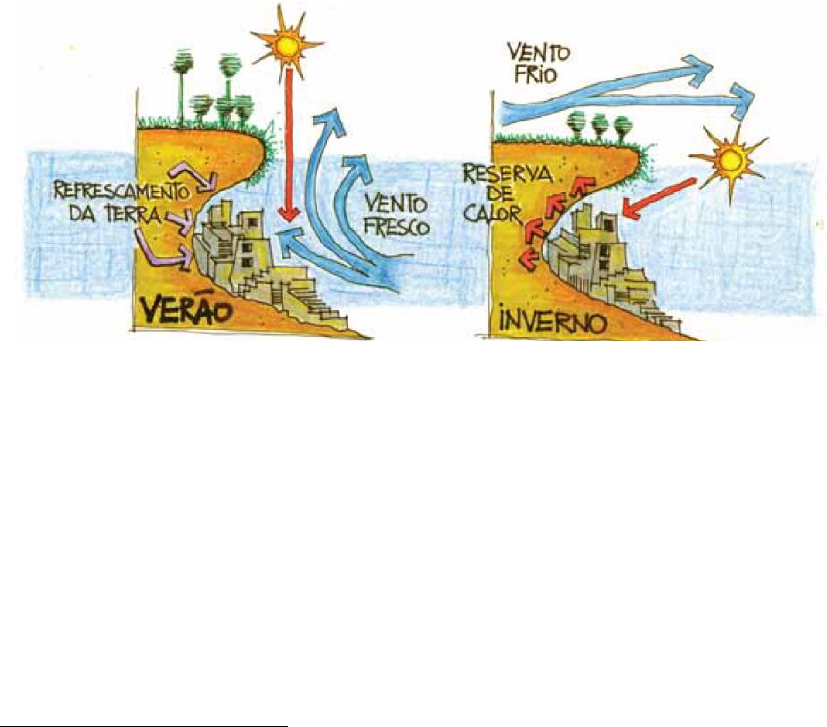 Conforto ambiental - Ventilação | climatização Prof. Me. Altimar Cypriano I. O Conforto Ambiental 1 – Introdução O ser humano sempre procurou abrigo para se proteger das intempéries e perigos do ambiente exterior, as cavernas foram possivelmente os primeiros abrigos, que possibilitavam aos seres humanos condições de sobrevivência. O homem foi, com o passar do tempo, dominando o fogo, técnicas de agricultura e de construir seu próprio abrigo, tendo adquirido o conhecimento das condições climáticas e de adaptar-se a elas. A arquitetura vernacular1 em diversas regiões do mundo demonstra como os povos foram se adaptando ao clima, desenvolvendo técnicas e conceitos para tornar os ambientes mais adequados às condições humanas. Como exemplo, abaixo temos as habitações do povo Mesa Verde, no deserto do Colorado, nos Estados Unidos - – habitações adaptadas ao clima, protegidas do sol pelas encostas de pedra. (LAMBERTS, Et al, 2003) Habitações do povo Mesa Verde (Colorado, USA) Fonte: Lamberts Et. al. (2003) O homem é um animal homeotérmico e, para sobrevivência, necessita manter uma temperatura interna relativamente constante (FROTA & SCHIFFER 2001), em torno de 37°C. É por meio do metabolismo que o organismo controla o ganho ou perda de calor. 1 Ver artigo: Arquitetura vernacular – Em busca de uma definição de Rubenilson Brazão Teixeira, disponível em: http://www.vitruvius.com.br/revistas/read/arquitextos/17.201/6431 O conforto ambiental está relacionado às condições de habitabilidade dos ambientes e sua implicação na exigência de adaptação das pessoas ao calor, umidade, som e luz. As principais variáveis climáticas de conforto térmico são: temperatura, umidade, velocidade do ar e radiação solar. Existe uma relação entre os elementos de conforto, podendo haver interferência entre eles, por exemplo, a luz proveniente do Sol, fornece também calor, que implicará num ganho térmico nem sempre pretendido, portanto, neste caso, o controle da insolação é necessário. O arquiteto romano Vitrúvio em “Dez livros sobre a Arquitetura” (séc. I a.C.)2, a arquitetura baseada em três preceitos: "Utilitas" (comodidade e função), "Firmitas" (solidez) e "Venustas" (beleza). “Utilitas” trata da função a que se destina o espaço – quais atividades serão desenvolvidas ali, assim como a sua comodidade, ou seja, quais as condições os usuários terão ao desenvolver essas atividades (LAMBERTS, Et al, 2003.) Quanto menor o esforço do usuário para se adaptar, maior o conforto do ambiente. “A Arquitetura deve servir ao homem e ao seu conforto, o que abrange o seu conforto térmico. O homem tem melhores condições de vida e de saúde quando seu organismo pode funcionar sem ser submetido a fadiga ou estresse, inclusive térmico. A Arquitetura, como uma de suas funções, deve oferecer condições térmicas compatíveis ao conforto térmico humano no interior dos edifícios, sejam quais forem as condições climáticas externas. Por outro lado, a intervenção humana, expressa no ato de construir seus espaços internos e externos, altera as condições climáticas locais, das quais, por sua vez, também depende a resposta térmica da edificação” (FROTA & SCHIFFER 2001) 2 - Conceito de Conforto Ambiental | Ventilação O conceito de conforto ambiental, pode ser entendido como a avaliação e o atendimento das exigências humanas, baseados no princípio de que quanto maior for o esforço de adaptação do indivíduo no ambiente em função da atividade que estiver desenvolvendo, maior será sua sensação de desconforto. Assim do ponto de vista fisiológico o “esforço de adaptação” do indivíduo está relacionado aos sistemas de percepção da luz, som e calor, portanto, se a iluminação, o som ou a temperatura do ambiente não estiver adequada irá demandar esforço 2 Marco Vitrúvio Polião, arquiteto romano. do usuário. Compete ao projeto a adequação da arquitetura e do design de interiores ao clima, objetivando atenuar as sensações de desconforto impostas por climas rigorosos. Principais variáveis do conforto Ambiental Fonte: Vianna e Gonçalves, (2001) Temos como objetivos do conforto ambiental: • Conforto térmico: temperaturas adequadas – evitando temperaturas internas muito elevadas no verão e muito baixas no inverno; • Ventilação: renovação do ar interno – eliminação de odores, poluentes, etc. e eliminar excesso de calor interno; • Acústica – condições de trabalho e sossego – níveis de ruídos aceitáveis e não prejudiciais ao sistema auditivo; • Iluminação – visibilidade, segurança, orientação – por meio dos aspectos quantitativos, ou seja, quantidade de luz adequada as tarefas e funções dos ambientes – níveis de iluminância (E – em lux) bem como a sua distribuição, considerando também os aspectos qualitativos, como o conforto e ergonomia visual, evitando ofuscamentos, brilhos e reflexões, levando em conta os aspectos estéticos fundamentais na concepção do espaço. A ventilação dos ambientes pode ser natural, quando por meio das aberturas, há o deslocamento do ar através do edifício (FROTA & SCHIFFER 2001) ou a ventilação pode ser mecânica ou artificial, quando esse processo é provocado por algum tipo de equipamento que necessite do consumo de energia. A ventilação natural pode ser promovida por diferença de pressão (ação dos ventos) ou por diferença de temperatura (efeito chaminé). O conforto térmico é de acordo com a ASHRAE3 é a condição que expressa satisfação com o ambiente térmico, e essa condição de satisfação indica para o conceito de neutralidade térmica quando não há nem acúmulo nem perda excessiva de calor entre o organismo e o ambiente, que é uma condição para o conforto térmico. De acordo com Lamberts Et al (2003) “Quanto maior a resistência térmica da roupa, menor serão suas trocas de calor com o meio”, po