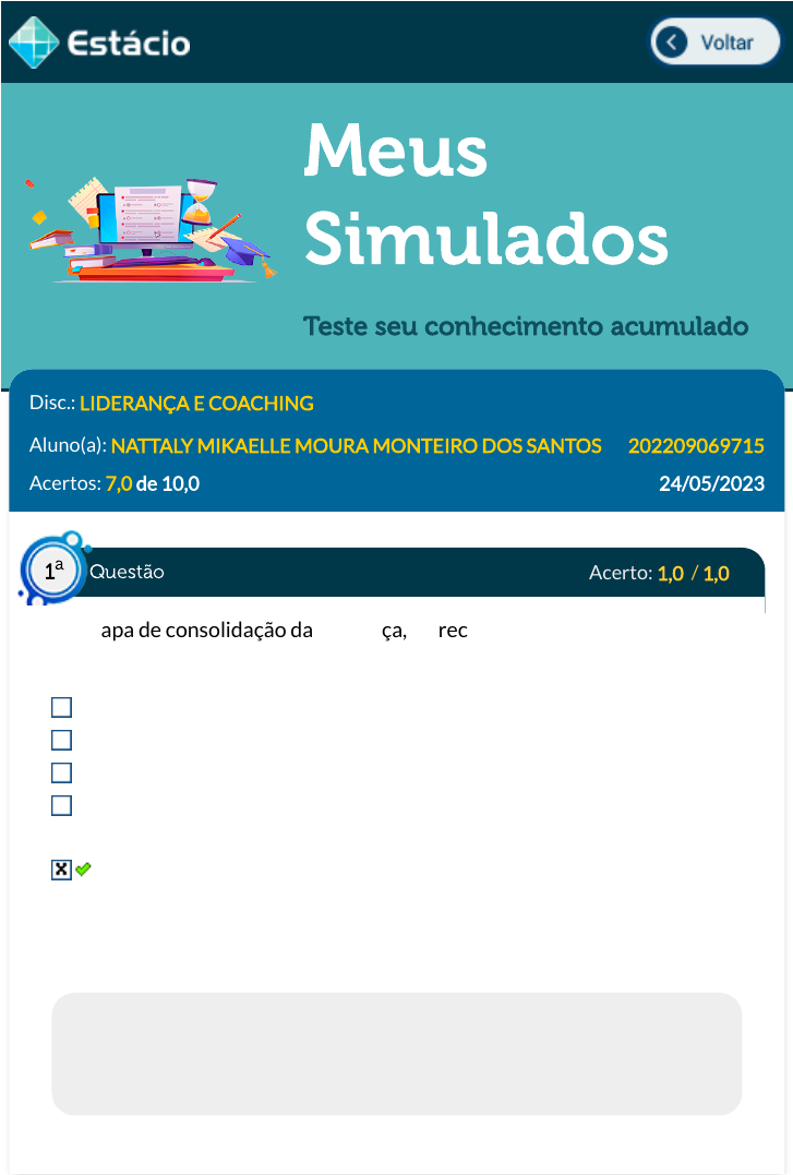 13/06/23, 11:17 Estácio: Alunos https://simulado.estacio.br/alunos/ 1/8 Meus Simulados Teste seu conhecimento acumulado Disc.: LIDERANÇA E COACHING Aluno(a): NATTALY MIKAELLE MOURA MONTEIRO DOS SANTOS 202209069715 Acertos: 7,0 de 10,0 24/05/2023 Acerto: 1,0 / 1,0 Na etapa de consolidação da liderança, é preciso mudar a mentalidade no sentido de: Saber que agora você é uma che�a e não um colega de trabalho. Se esforçar ao máximo para ser mais produtivo que os demais. Ser ciente de que os membros do grupo anseiam seu cargo. Fazer o necessário para cumprir os objetivos, mesmo que não goste de liderar. Alinhar seus valores com os da empresa e acreditar que faz a diferença para liderar. Respondido em 24/05/2023 19:42:42 Explicação: A resposta correta é: Alinhar seus valores com os da empresa e acreditar que faz a diferença para liderar. Questão1 a https://simulado.estacio.br/alunos/inicio.asp javascript:voltar(); 13/06/23, 11:17 Estácio: Alunos https://simulado.estacio.br/alunos/ 2/8 Acerto: 1,0 / 1,0 Considerando a diferença entre gestão e liderança, indique a alternativa mais adequada: A liderança pode emergir de qualquer pessoa, o estudo dos fenômenos é diferenciado e a gestão é burocrática. O estudo da gestão começou a Antiga Grécia e o da liderança é recente. O gerente não busca o bem comum, precisa inspirar e sua atuação está regulamentada. O gestor deve transformar os seguidores e o líder não precisa. O gerenciamento é formal, a liderança não implica vínculos pessoais e busca atingir resultados. Respondido em 24/05/2023 19:54:52 Explicação: A resposta correta é: A liderança pode emergir de qualquer pessoa, o estudo dos fenômenos é diferenciado e a gestão é burocrática. Acerto: 1,0 / 1,0 Muitas são as atribuições e responsabilidades de um líder. Pensar no futuro é uma responsabilidade da liderança que consiste em: Não gerar antipatias entre os membros da equipe porque pode precisar deles. Ter um pensamento imediato e reativo, cuidando das ações de curto prazo. Se antecipar aos acontecimentos. O pensamento tem que ser estratégico, com uma perspectiva ampla do planejamento. Ter em mente que o planeta depende das ações pontuais. Ter em mente que a liderança vai terminar um dia. Respondido em 24/05/2023 19:55:28 Questão2 a Questão3 a 13/06/23, 11:17 Estácio: Alunos https://simulado.estacio.br/alunos/ 3/8 Explicação: A resposta correta é: Se antecipar aos acontecimentos. O pensamento tem que ser estratégico, com uma perspectiva ampla do planejamento. Pensar no futuro. Um líder deve se antecipar aos acontecimentos, aos eventos. Seu pensamento tem que ser estratégico, com uma perspectiva ampla do planejamento. Acerto: 1,0 / 1,0 Um dos princípios da liderança ética é a contribuição para a comunidade, que se manifesta: Quando a empresa contribui para ações culturais de incentivo �scal. Quando se busca o benefício dos trabalhadores acima de tudo. Quando se entregam produtos ou realizam serviços de graça aos órgãos de poder locais. Quando se realizam ações para ajudar as famílias dos líderes. Quando a atividade da organização tem um impacto positivo na sociedade. Respondido em 24/05/2023 19:57:58 Explicação: A resposta correta é: Quando a atividade da organização tem um impacto positivo na sociedade. Acerto: 0,0 / 1,0 Questão4 a Questão5 a 13/06/23, 11:17 Estácio: Alunos https://simulado.estacio.br/alunos/ 4/8 A teoria liderado-seguidores (LMX) teve origem na década de 1970. Sobre a teoria LMX é correto a�rmar: Os líderes têm o papel fundamental de manter o time motivado, por isso, a troca é necessária, sendo essa sua principal função. Estudos se concentram em como a qualidade das trocas líder- membro estava relacionada a resultados positivos para líderes, seguidores, grupos e organização em geral. Não existe comprovação de que a relação diádica entre os líderes e os grupos externos gerem resultados positivos. O líder atua de modo coadjuvante perante o time, que deve desenvolver trocas frequentes e tocar decisões por conta própria. Grupos internos e externos devem estar cada vez mais integrados de forma que não haja mais vieses de interação e as trocas sejam cada vez mais positivas. Respondido em 24/05/2023 20:00:37 Explicação: A resposta correta é: Estudos se concentram em como a qualidade das trocas líder-membro estava relacionada a resultados positivos para líderes, seguidores, grupos e organização em geral. Acerto: 1,0 / 1,0 Sobre a diversidade de gênero é relevante ressaltar: Universidades em todo mundo têm recebido cada vez mais mulheres interessadas em áreas que antes eram majoritariamente masculinas. Mulheres ainda ocupam poucas posições de alta liderança porque não têm capacidade e desenvolvimento intelectual para isso. Não é possível a�rmar que a presença de mulheres nos times possa melhorar a performance geral. Mulheres sempre sofrem preconceito em processos seletivos, portanto, devem ter uma avaliação mais leve. Questão6 a 13/06/23, 11:17 Estácio: Alunos https://simulado.estacio.br/alunos/ 5/8 Mulheres têm naturalmente mais di�culdade de desenvolvimento de carreira devido à maternidade. Respondido em 24/05/2023 20:14:47 Explicação: A resposta correta é: Universidades em todo mundo têm recebido cada vez mais mulheres interessadas em áreas que antes eram majoritariamente masculinas. Acerto: 0,0 / 1,0 Sobre os benefícios da relação diádica da liderança LMX é importante a�rmar: Os grupos internos devem sempre receber mais atenção que os externos. A teoria LMX não estava diretamente associada à criatividade, mas servia como um mecanismo para nutrir os sentimentos das pessoas, o que aumentava sua criatividade. Líderes com baixo carisma tem mais di�culdades em exercer a troca efetiva entre os grupos. Grupo externo remete a pessoas que são terceiras, portanto, são menos importantes no desenvolvimento das tarefas