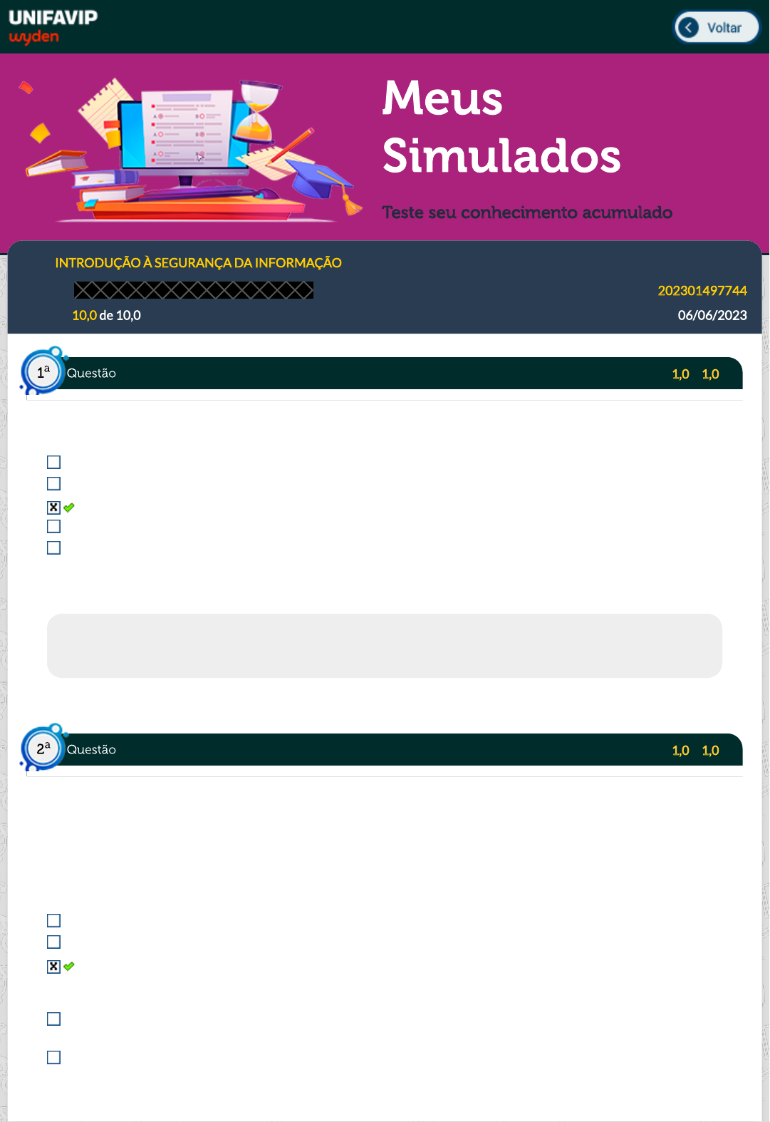 06/06/2023, 12:26 UNIFAVIP: Alunos https://simulado.wyden.com.br/bdq_simulados_avaliacao_parcial_resultado.asp?cod_hist_prova=311457570&cod_prova=6437606404&f_cod_disc= 1/5 Disc.: INTRODUÇÃO À SEGURANÇA DA INFORMAÇÃO Aluno(a): 202301497744 Acertos: 10,0 de 10,0 06/06/2023 Acerto: 1,0 / 1,0 Dentre as opções a seguir, qual Norma Técnica apresenta um código de prática para a gestão da segurança da informação? ABNT NBR ISO/IEC 20000-1:2011 ABNT NBR ISO 14001:2004 ABNT NBR ISO/IEC 27002:2013 ABNT NBR ISO/IEC 27001:2013 ABNT NBR ISO 9001:2008 Respondido em 06/06/2023 12:16:22 Explicação: A resposta correta é: ABNT NBR ISO/IEC 27002:2013 Acerto: 1,0 / 1,0 O item 12.2.1 da norma ABNT NBR ISO/IEC 27002:2013 diz respeito aos controles contra malware, cujas diretrizes para implementação recomendam a proteção contra códigos maliciosos baseada em softwares de detecção de malware e reparo, na conscientização da informação, no controle de acesso adequado e nos planos de continuidade de negócio. Com base no acima exposto, e no seu conhecimento de segurança da informação e sistemas de computação, marque a alternativa que possui uma das diretrizes recomendadas: Estabelecer uma política informal proibindo o uso de softwares autorizados. Ignorar informalmente a presença de quaisquer arquivos não aprovados ou atualização não autorizada. Estabelecer uma política formal para proteção contra os riscos associados com a importação de arquivos e softwares, seja de redes externas, ou por qualquer outro meio, indicando quais medidas preventivas devem ser adotadas. Instalar e atualizar regularmente softwares de detecção e remoção de malware, independentemente da fabricante, procedência e con�abilidade, para o exame de computadores e mídias magnéticas. Conduzir análises informais, esporádicas e descompromissadas dos softwares e dados dos sistemas que suportam processos críticos de negócio. Respondido em 06/06/2023 12:16:55 https://simulado.wyden.com.br/alunos/inicio.asp javascript:voltar(); 06/06/2023, 12:26 UNIFAVIP: Alunos https://simulado.wyden.com.br/bdq_simulados_avaliacao_parcial_resultado.asp?cod_hist_prova=311457570&cod_prova=6437606404&f_cod_disc= 2/5 Explicação: A resposta correta é: Estabelecer uma política formal para proteção contra os riscos associados com a importação de arquivos e softwares, seja de redes externas, ou por qualquer outro meio, indicando quais medidas preventivas devem ser adotadas. Acerto: 1,0 / 1,0 Complete a frase corretamente: "as funções de hash, por exemplo, são adequadas para garantir a integridade dos dados, porque ..." Usam chave única para criptografar e descriptografar a mensagem. Qualquer alteração feita no conteúdo de uma mensagem fará com que o receptor calcule um valor de hash diferente daquele colocado na transmissão pelo remetente. Fazem a troca de chaves na chave simétrica. Geralmente podem ser calculadas muito mais rápido que os valores de criptogra�a de chave pública. Utilizam algoritmos de criptogra�a de chave pública. Respondido em 06/06/2023 12:18:11 Explicação: A resposta correta é: Qualquer alteração feita no conteúdo de uma mensagem fará com que o receptor calcule um valor de hash diferente daquele colocado na transmissão pelo remetente. Acerto: 1,0 / 1,0 Segurança da informação é um conjunto de práticas e medidas destinadas a proteger a con�dencialidade, integridade e disponibilidade de informações. Qual das opções abaixo é considerada uma boa prática de segurança? Sempre abrir links ou fazer download de arquivos enviados por e-mails não con�áveis ou de remetentes desconhecidos. Sempre utilizar antivírus desatualizados. Nunca baixar programas de fornecedores o�ciais. Desabilitar o �rewall do sistema operacional. Nunca compartilhar senhas. Respondido em 06/06/2023 12:19:50 Explicação: O compartilhamento de senhas é uma prática arriscada e pode comprometer a segurança da informação, já que uma vez que a senha é compartilhada, a pessoa que a recebe pode ter acesso a informações con�denciais. Portanto, manter senhas seguras e não compartilhá-las é uma boa prática para proteger a con�dencialidade das informações. Acerto: 1,0 / 1,0 06/06/2023, 12:26 UNIFAVIP: Alunos https://simulado.wyden.com.br/bdq_simulados_avaliacao_parcial_resultado.asp?cod_hist_prova=311457570&cod_prova=6437606404&f_cod_disc= 3/5 Houve um superaquecimento em um roteador, que parou de funcionar. O plano de tratamento para esse caso, de�nido como "risco alto", será colocado em prática imediatamente, porque esse risco é considerado: Prioritário Residual Informalmente identi�cado Resolvido Não identi�cado Respondido em 06/06/2023 12:20:26 Explicação: A resposta correta é: Prioritário Acerto: 1,0 / 1,0 O Gerenciamento da Continuidade dos Serviços de Tecnologia Informação (GCSTI) é um processo essencial para que o negócio possa voltar a operar com o suporte dos serviços de TI o mais rápido possível após a ocorrência de um cenário de desastre. Selecione a opção que apresenta um possível desa�o de desenvolvimento de um GCSTI: Justi�car a importância do desenvolvimento da GCSTI. Criar um GCSTI quando não existirem planos de gerenciamento de continuidade de negócios. Obter exemplos no mercado de casos de sucesso do desenvolvimento, da implantação e da aplicação da GCSTI. Encontrar apoio pro�ssional no mercado para dar suporte ao desenvolvimento da GCSTI. Obter referências para adoção das melhores práticas apropriadas em TI. Respondido em 06/06/2023 12:21:23 Explicação: A resposta correta é: Criar um GCSTI quando não existirem planos de gerenciamento de continuidade de negócios. Acerto: 1,0 / 1,0 Na questão que avalia conhecimento de informática, a menos que seja explicitamente informado o contrário, considere que: todos os programas mencionados estejam em con�guração-padrão, em português; o mouse esteja con�gur
