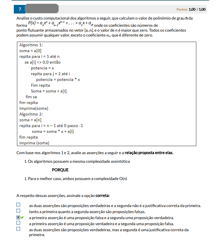 Pontos: Analise o custo computacional dos algoritmos a seguir, que calculam o valor de polinômio de grau n da forma P(x) = onde os coeficientes são de ponto flutuante armazenados no vetor e valor de é maior que zero. Todos os coeficientes podem assumir qualquer valor, exceto o coeficiente an que é diferente de zero. Com base nos algoritmos 1 e 2, avalie as asserções a seguir e a relação proposta entre elas. 1. Os algoritmos possuem a mesma complexidade assintótica. PORQUE 1. Para o melhor caso, ambos possuem a complexidade O(n). as duas asserções são proposições verdadeiras e a segunda não é a justificativa correta da primeira. tanto a primeira quanto a segunda asserção são proposições falsas. a primeira asserção é uma proposição falsa e a segunda uma proposição verdadeira. a primeira asserção é uma proposição verdadeira e a segunda uma proposição falsa. as duas asserções são proposições verdadeiras, mas a segunda é uma justificativa correta da primeira.