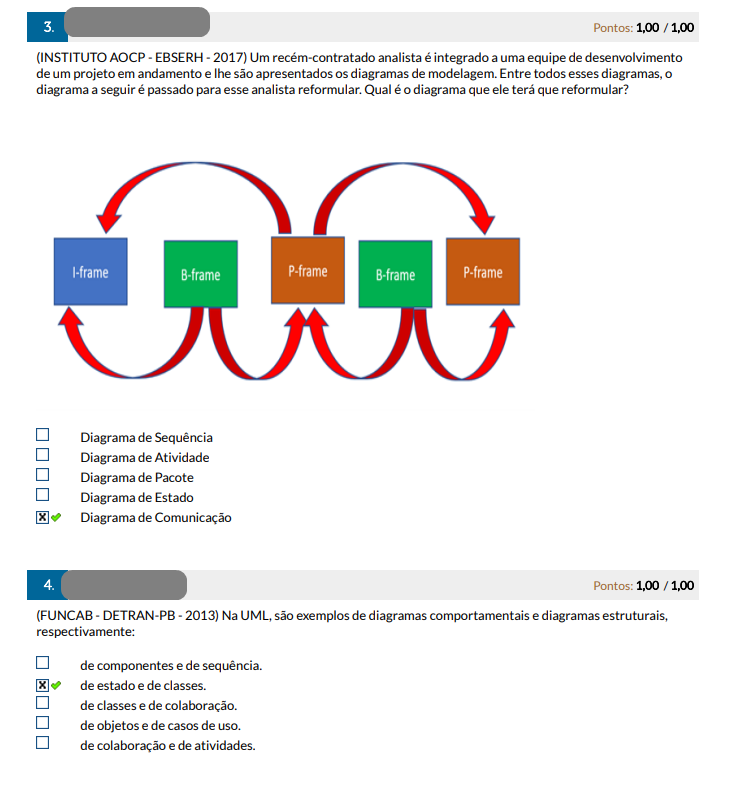 Um recém-contratado analista é integrado a uma equipe de desenvolvimento de um projeto em andamento e lhe são apresentados os diagramas de modelagem. Entre todos esses diagramas, diagrama a seguir é passado para esse analista reformular. Qual é diagrama que ele terá que reformular? I-frame B-frame P-frame B-frame P-frame Diagrama de Sequência Diagrama de Atividade Diagrama de Pacote Diagrama de Estado Diagrama de Comunicação