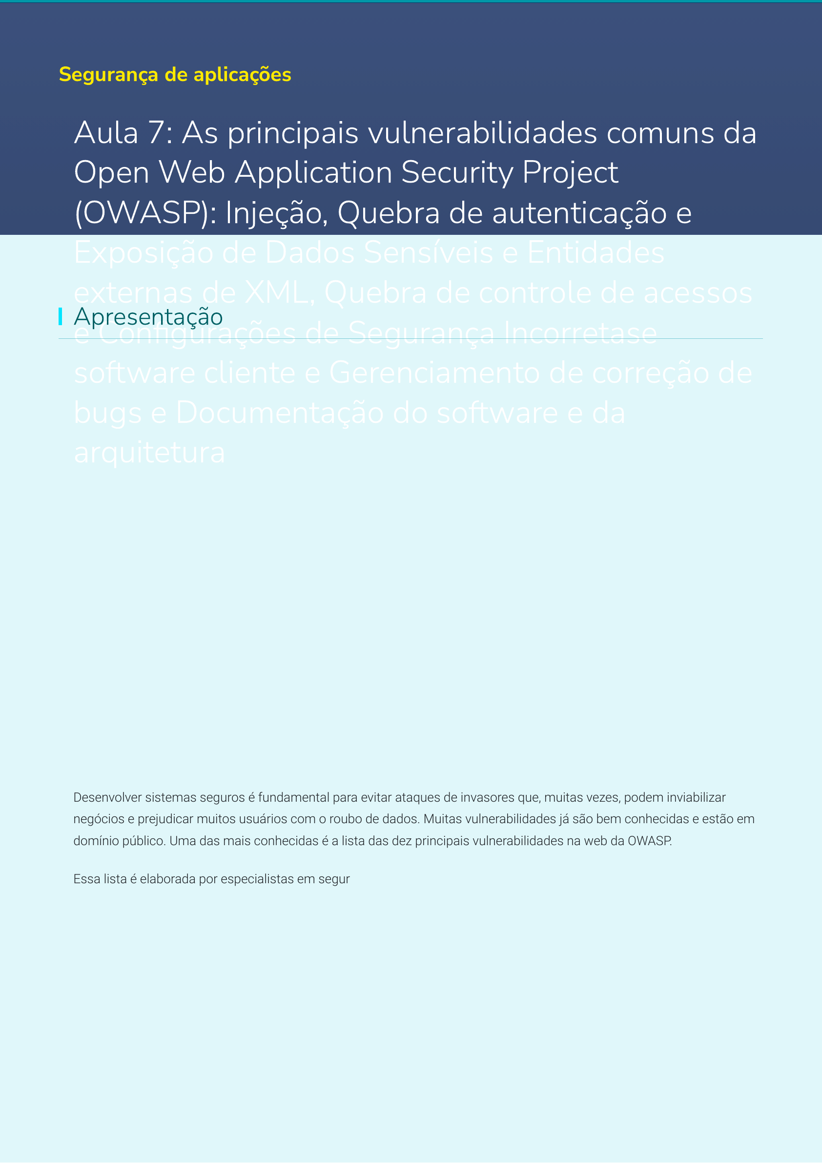 apresenta exemplos e sugestões de como evitá-las. Nesse texto, serão apresentadas as vulnerabilidades Injeção, Quebra