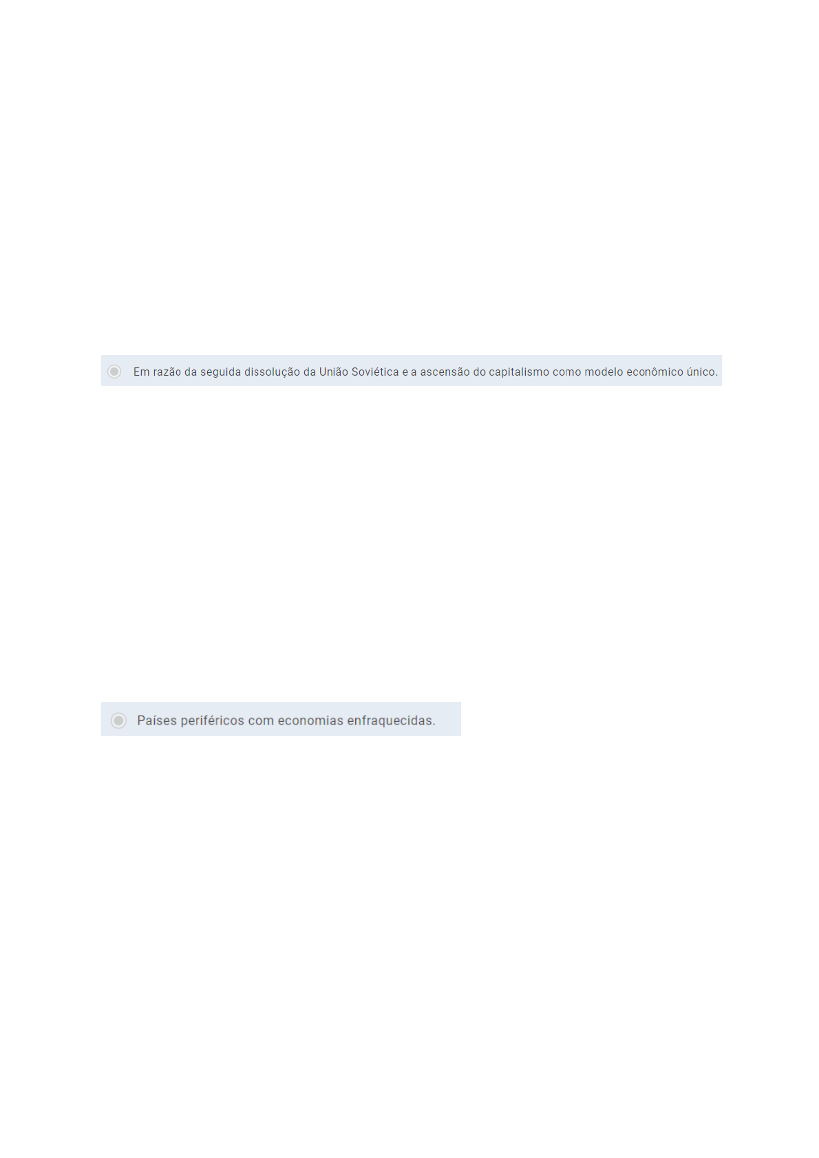 Atividade 4 - Desafios Contemporâneos 1) “Poucas vezes é possível testemunhar um acontecimento e ter certeza que a História com h maiúsculo, está sendo escrita diante dos seus próprios olhos. Este certamente é um desses momentos [...] há poucos dias uma pessoa que tentasse atravessar do outro lado do Muro, de Berlim Oriental para cá, poderia ser fuzilada pelos guardas de fronteira. Hoje isso aqui parece uma rua de pedestres, as pessoas estão comemorando em ritmo de batucada. O Muro de Berlim em si ainda está aqui, mas em espírito ele já desapareceu.” Fonte: MEMORIA GLOBO. Jornal Nacional: a n otícia faz história. Rio de Janeiro: Jorge Zahar, 2004. A queda do muro de Berlim é um dos grandes acontecimentos da história das últimas décadas, isto se justifica: Resposta: Resposta Correta – em 1989 o muro de Berlim caiu, reunificando a Alemanha e dois anos depois, a União Soviética se desfez, abrindo caminho para ascensão do capitalismo enquanto sistema econômico. 2) “A globalização econômica enseja a formação de um mercado mundial que deve ser objeto de regulamentação multilateral no sentido da liberalização do comércio sem deixar de garantir a aplicação de certas medidas protecionistas. Ao contrário do que se costuma asseverar, o atual processo de globalização impõe uma regulamentação multilateral do comércio internacional, pautada por princípios que militam no sentido da liberalização comercial fazendo certas concessões ao protecionismo.” Fonte: TOMAZZETE, Marlon. A necessidade de regulamentação multilaretal do comércio internaciona l: protecionismo x liberalização. Disponível em: https://www.publicacoes.uniceub.br/prisma/article/download/1194/1159https://www.publicacoes.unice ub.br/prisma/article/download/1194/1159 Os principais afetados por medidas protecionistas no mercado globalizado são: Resposta: Resposta Correta: Países periféricos com economias enfraquecidas, por conta da agressividade de políticas econômicas das grandes nações desenvolvidas, que protegem setores da sua própria economia. 3) “[...] de 2001 a 2004, a desigualdade de renda familiar per capita caiu de forma contínua e substancial, alcançando seu menor nível nos últimos trinta anos. Além de ser um resultado importante por si só, essa desconcentração levou a uma expressiva redução da pobreza e da extrema pobreza.” Fonte: DEDDECA, Cláudio. A redução da desigualdade e seus desafios. Disponível em: http://repositorio.ipea.gov.br/bitstream/11058/3383/1/td_2031.pdfhttp://repositorio.ipea.gov.br/bitstrea m/11058/3383/1/td_2031.pdf É sabido das mudanças sociais e econômicas que aconteceram no país na segunda metade dos anos 2000, estas mudanças se devem principalmente a programas governamentais, um baluarte destes programas, de transferência de renda é chamado de: Resposta: https://www.publicacoes.uniceub.br/prisma/article/download/1194/1159 https://www.publicacoes.uniceub.br/prisma/article/download/1194/1159 http://repositorio.ipea.gov.br/bitstream/11058/3383/1/td_2031.pdf http://repositorio.ipea.gov.br/bitstream/11058/3383/1/td_2031.pdf Resposta Correta: Bolsa família, trata-se de um programa referência mundial de transferências de rendas, que contribuiu para o aquecimento da economia, superação da pobreza extrema e outros indicadores sociais. 4) “Os princípios da igualdade, da liberdade e da fraternidade formam o célebre lema da Revolução Francesa (1789), evento de rompimento histórico com o ancien régime, ou seja, com o servilismo e a sociedade de ordens e privilégios. A Revolução Francesa promoveu a igualdade entre os cidadãos (direito igual), a cooperação como fundamento do trabalho coletivo as liberdades republicanas e do governo, por intermédio de representantes eleitos. [...] A seguir, mostram-se alguns artigos da Declaração dos Direitos do Homem e do Cidadão de 1789 que ressaltam a igualdade: Art.1.º Os homens nascem e são livres e iguais em direitos. [...] Art. 6.º A lei é a expressão da vontade geral. Todos os cidadãos têm o direito de concorrer, pessoalmente ou através de mandatários, para a sua formação. Ela [a lei] deve ser a mesma para todos, quer se destine a proteger quer a punir.” Fonte: AZEVEDO, Mário. Qual é a medida de justiça social? Além da igualdade, amplamente difundida nos debates de justiça social, debate-se a questão da equidade, este conceito é definido por: Resposta: 5) “John Rawls, o autor do clássico tratado Uma Teoria da Justiça (1971), é um filósofo político elusivo e, ao mesmo tempo, onipresente na discussão pública contemporânea. [...] "Uma Teoria da Justiça foi o resultado de um trabalho que ocupou o espírito de Rawls por mais de dez anos. A partir da década de 1950, ele praticamente ficou possuído pela ideia da “justiça como equidade” ( justice as fairness ) e de como ela poderia ser transmitida não só para as instituições democráticas de uma sociedade liberal como deveriam ser os Estados Unidos, mas também para a construção completa de uma comunidade bem-ordenada" Fonte: CUNHA, Martin. O que diz “Uma Teoria da Justiça”, de John Rawls, que moldou a discussão política atual. Disponível em: https://www.gazetadopovo.com.br/ideias/o-que-dizuma-teoria-da-justica-de-john-rawls-que-moldou-a- discussao-politica-atual-cdm84kxulw0k7i765zxy51np8/https://www.gazetadopovo.com.br/ideias/o-que -dizuma-teoria-da-justica-de-john-rawls-que-moldou-a-discussao-politica-atual-cdm84kxulw0k7i765zx y51np8/ Considerando os apontamentos acima, indique os pontos fundamentais da teoria da justiça de John Rawls. Resposta: Resposta Correta: Conforme John Rawls são necessários três princípios para alcançar a equidade, condição essencial da justiça social, listados como garantias fundamentais, igualdade de oportunidade e garantias de alcance a cidadania. 6) “O século XXI, que estaria começando, deveria ser chamado, argumenta Habermas, de "